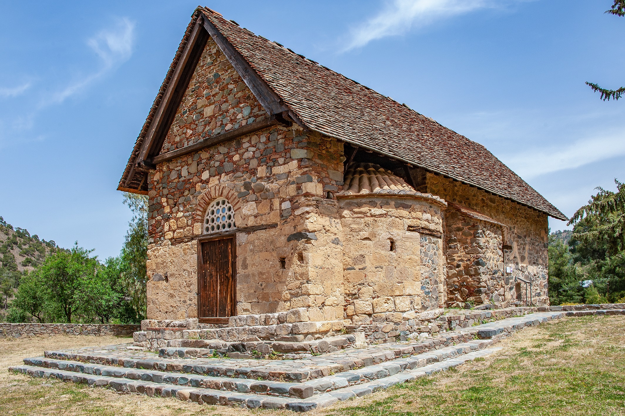 Πρόκειται για ένα σχετικά μεγάλο μονοπάτι περίπου 8 χλμ. που ξεκινά από την Παναγία του Άρακα στα Λαγουδερά. Πριν ξεκινήσετε αξίζει μια επίσκεψη στην εκκλησία του Άρακα που χτίστηκε στο δεύτερο μισό του 12ου αι. Ανήκει στις μονόκλιτες με τρούλο και η στέγη της εξωτερικά σχηματίζει σταυρό ενώ είναι καλυμμένη με πλάκες. Το εσωτερικό της διαθέτει εξαιρετικές τοιχογραφίες του νεοκλασικού ρυθμού της Βυζαντινής τέχνης επίσης του 12ου αι. και αποτελεί και αυτή Μνημείο Παγκόσμιας Πολιτιστικής Κληρονομιάς της UNESCO. Το μονοπάτι καταλήγει στον ιερό ναό Σταυρός του Αγιασμάτι του 1494 ο οποίος διαθέτει επίσης υπέροχες τοιχογραφίες και είναι και αυτός μνημείο της UNESCO. Στη διαδρομή θα περάσετε μέσα από πυκνό δάσος τραχείας πεύκης, αμπελώνες, αμυγδαλιές και παλιές ξερολιθιές ενώ θα θαυμάσετε την εξαιρετική θέα στα Κιόνια, στην πεδιάδα της Μόρφου, στον Όλυμπο και τη Μαδαρή.