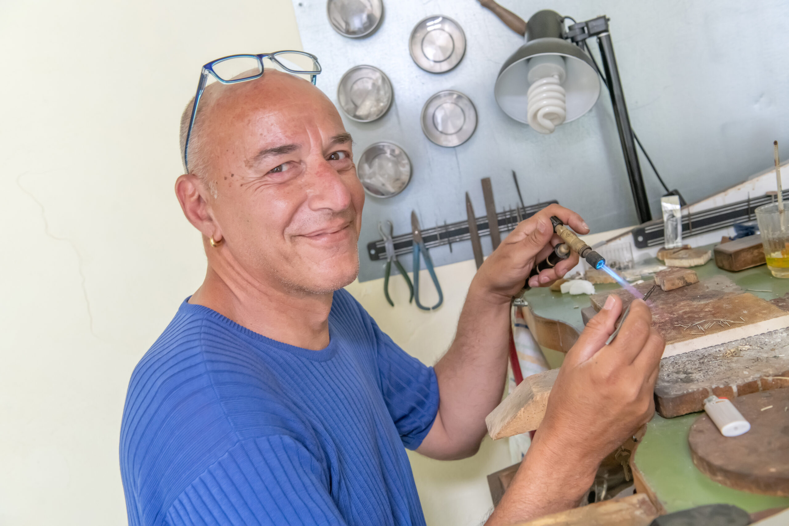 Στο νησί ο Αχιλλέας έρχεται εδώ και 35 χρόνια και στον Πύργο βρέθηκε από επιλογή. «Άκουσα τη γνώμη της μικρής μου ανιψιάς και άνοιξα πριν από 6 χρόνια ένα λιλιπούτειο μαγαζί στην πλατεία για να δοκιμάσω αν αυτού του είδους το χειροποίητο κόσμημα και αυτή η λογική στέκει εδώ. Στη συνέχεια, μεταφέρθηκα σε αυτό τον χώρο», μου λέει. Και προσθέτει ότι οι ντόπιοι όχι μόνο τον δέχθηκαν, αλλά και τον βοήθησαν να ενσωματωθεί στη μικρή τους κοινότητα.