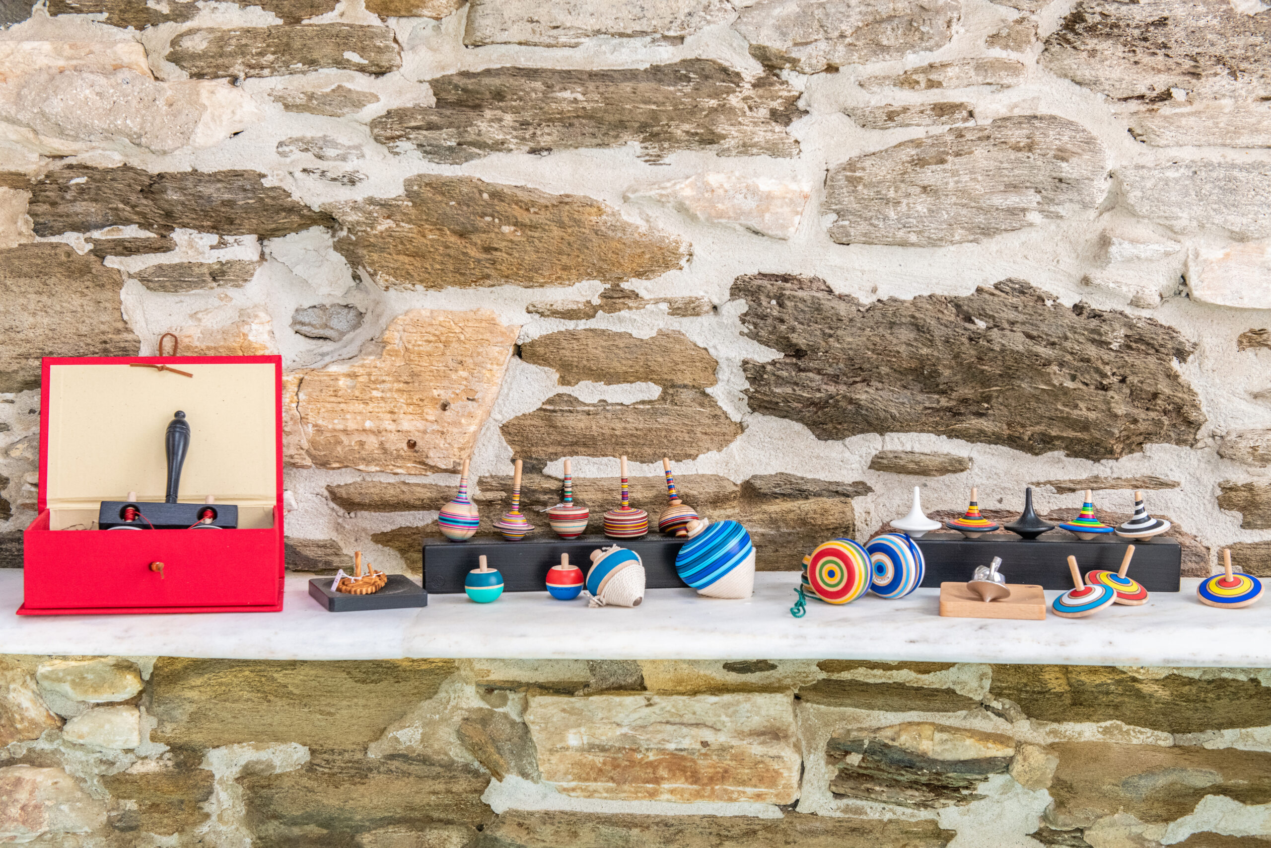 Περπατώντας στο κεντρικό σοκάκι του οικισμού αξίζει να κάνεις στάση στο εκθετήριο του ταλαντούχου γλύπτη που γεννήθηκε στον Πύργο, από καλλιτεχνική οικογένεια, ανήκοντας στην 5η γενιά καλλιτεχνών. Ζει στο χωριό όλη του τη ζωή, έχοντας αποφοιτήσει από το Προπαρασκευαστικό Σχολείο Καλών Τεχνών. Δημιούργησε το δικό του εργαστήριο το 1995 και από τότε συνεχίζει την τέχνη συνδυάζοντας, όπως θα μου πει, «τη γονιδιακή με τη βιωματική μνήμη». Χαρακτηριστικά είναι τα ολόγλυφα λευκά περιστέρια του σε μάρμαρο και τα μαρμαρόγλυπτα «χάρτινα καραβάκια», ενώ έχει δημιουργήσει πολλά χρηστικά αντικείμενα -πιατέλες και μαρμάρινα τραπέζια με ρόδια, ελιές, στάχυα και σταφύλια- αλλά και κατά παραγγελία αντικείμενα για τη διακόσμηση διάφορων χώρων. «Η συνομιλία μου με το υλικό είναι πλέον κανονική επικοινωνία. Φυσικά το γνωρίζω τώρα τόσο, όσο το έχω δουλέψει, γιατί ποτέ δεν σταματάς να το γνωρίζεις. Είναι μια σχέση αλληλεπίδρασης. Το μάρμαρο είναι δύσκολο και ακριβό υλικό, δεν σου δίνει ελευθερία. Πρέπει να είσαι πολύ προσεκτικός -και αυτό περνάει στη συνείδησή σου. Και νομίζω διαμορφώνει χαρακτήρες», λέει ο καλλιτέχνης.