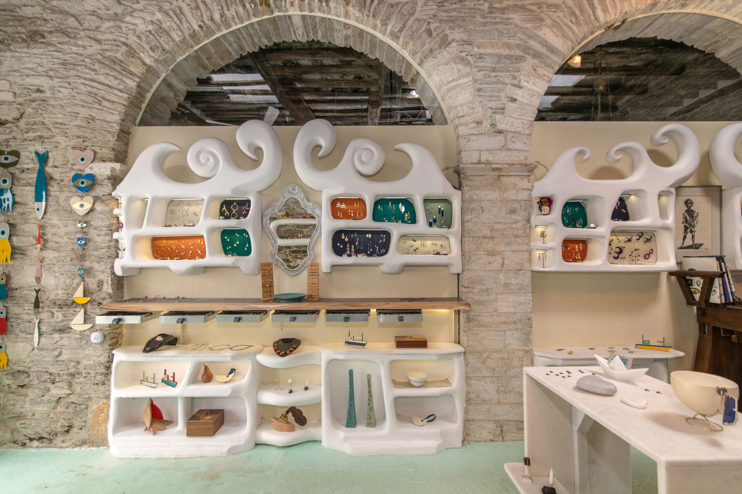 Ο Αχιλλέας έχει δημιουργήσει σε ένα παλιό πέτρινο κτίσμα στον Πύργο ένα αξιοθέατο μαγαζί που ξεχωρίζει, όχι μόνο για τις εξαιρετικές συλλογές κοσμημάτων, αλλά και για τα σκαλιστά μπλοκς, στα οποία τοποθετούνται: είναι φτιαγμένα από αφρώδες υλικό που το σκαλίζει και το βάφει ο ίδιος. «Η λογική είναι ότι όλα αυτά πρέπει να μεταφέρονται και να είναι ευπροσάρμοστα. Να τα αλλάζω, να προσθέτω ή να αφαιρώ τμήματά τους», εξηγεί, καθώς μου δείχνει κι έναν ποδοκίνητο τόρνο του 1700 που παίζει ρόλο γραφείου. Τo Jove φιλοξενεί επίσης συλλογές άλλων καλλιτεχνών, όπως των Bord de l’ eau από τη Θεσσαλονίκη και των Padalu που φτιάχνουν κεραμικά και τρισδιάστατα αρχιτεκτονικά σχέδια.