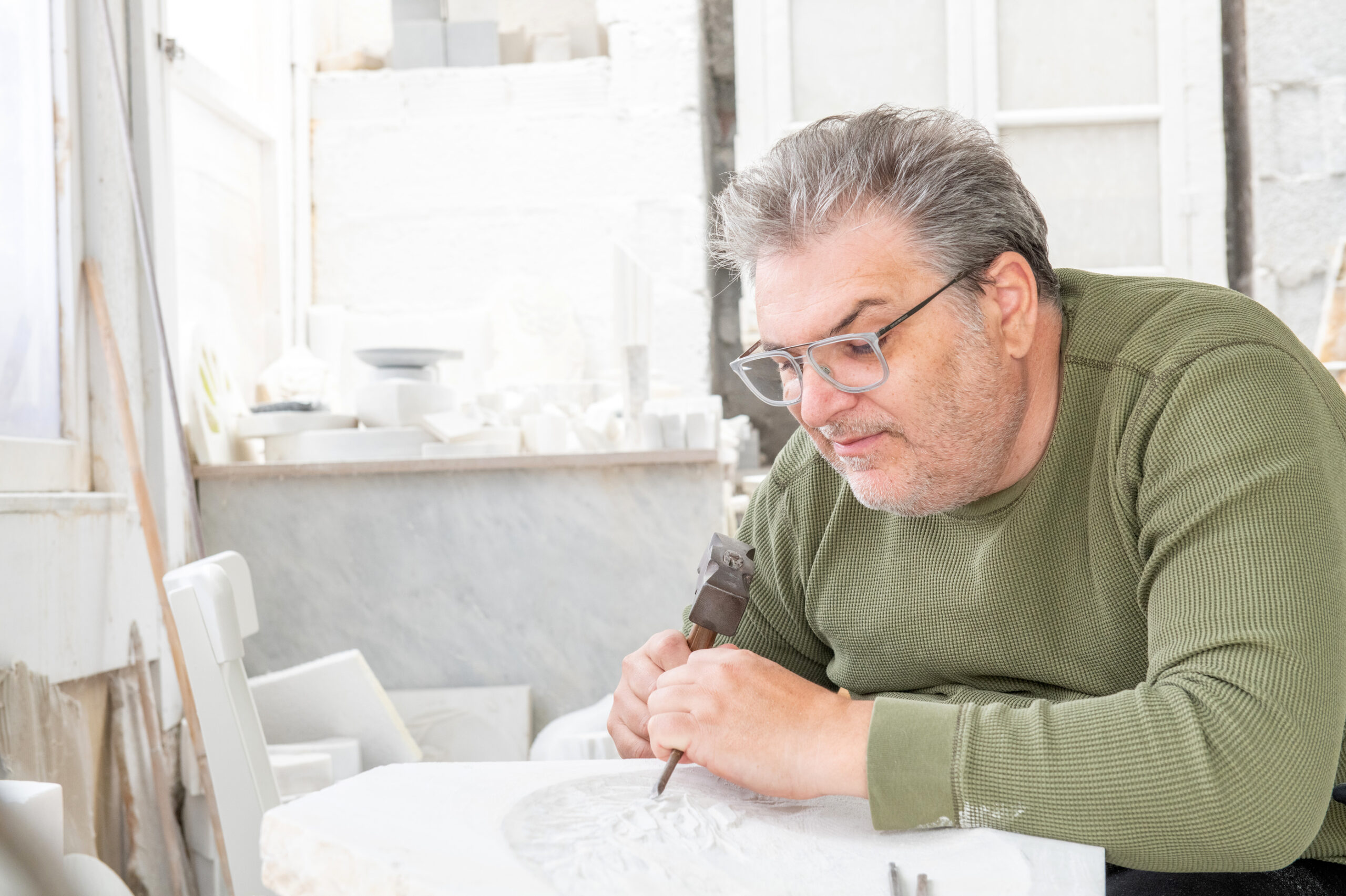 «Παίρνω ζωή από την τέχνη μου και νιώθω πλέον απόλυτη σύνδεση με το υλικό. Συμβαίνει από χρόνια, αλλά σταδιακά μεγαλώνει. Εγώ το μάρμαρο το θεωρώ ζωντανό -άλλωστε είμαστε φίλοι πια. Πρέπει να το δουλεύεις γλυκά, όχι να το χτυπάς με μανία. Το μάρμαρο πονάει. Αν το χτυπήσεις λάθος, αλλάζει ο ήχος και σε προειδοποιεί. Ή θα σπάσω, ή θα σπάσει το καλέμι», μου λέει πάντα ευγενικός και χαμογελαστός.