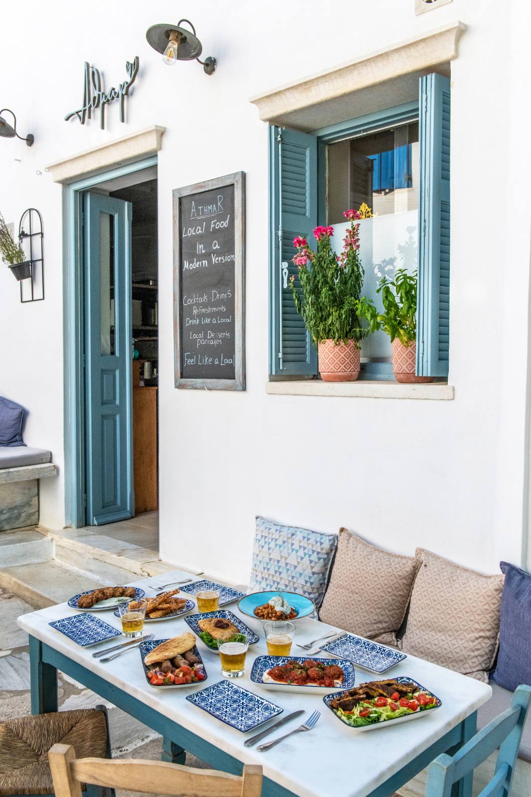 Αθμάρ: ο Bαγγέλης Χαρίτος, με προπάππου τον γλύπτη Γ. Καπαριά, είχε παιδικό του όνειρο να φτιάξει «το μαγαζί στα σκαλιά της πλατείας του Πύργου». Το κατάφερε μετά από 30 χρόνια, έχοντας ως φιλοσοφία τα Τηνιακά προϊόντα να πρωταγωνιστούν στα πρωτότυπα κοκτέιλ του Αθμάρ και να έχουν παρουσία σε πολλούς από τους μεζέδες του all day bistrot. Άλλωστε και το όνομα είναι εμπνευσμένο από το θυμάρι που μοσχοβολάει σε όλο το νησί. Στον κατάλογο με τα κοκτέιλ θα βρείτε πρωτότυπες μίξεις υλικών -όπως, για παράδειγμα, το Τηνιακό Νεγκρόνι με κρίταμο και κάπαρη, που έχει γίνει δημοφιλές.