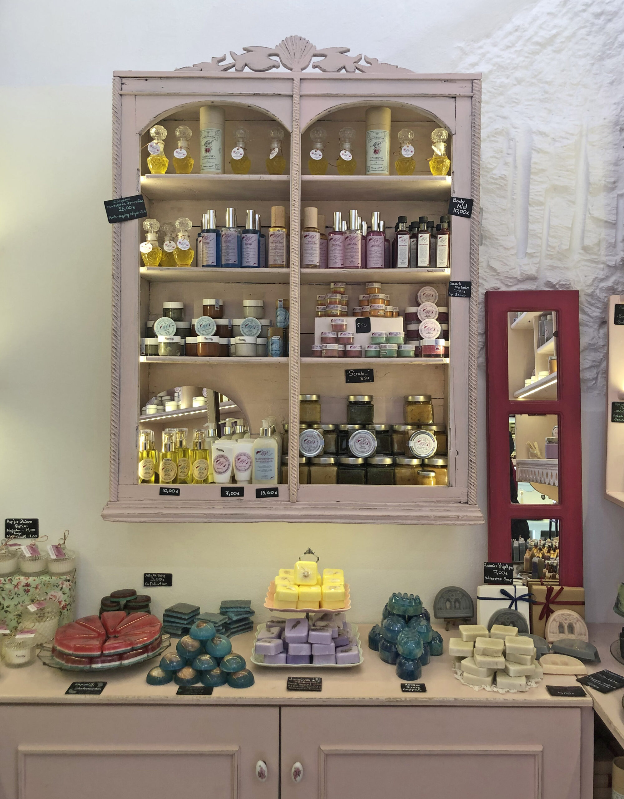 Υπέροχα αρώματα με καλωσορίζουν στο λιλιπούτειο μαγαζί με το vintage ύφος και τα ξύλινα έπιπλα βαμμένα σε ροζ και φιστικί χρώματα, ήδη πριν μπει φουριόζα από την πλατεία, όπου κάθεται με τους συγγενείς της, η Μαργαρίτα Καγιώργη. Ευπροσήγορη και γελαστή, σε κερδίζει με το χαμόγελο και την καλή της διάθεση. «Έχω σπουδάσει ωκεανογραφία και δούλευα σε ένα ερευνητικό κέντρο στην Κρήτη. Ήταν μια περίεργη φάση της ζωής μου, ένιωθα μέσα μου ότι ήθελα να κάνω μια αλλαγή. Να φτιάχνω κάτι με τα χέρια μου, χωρίς να έχω καταλήξει στο τι ακριβώς, και να έχω έναν δικό μου χώρο», μου λέει.