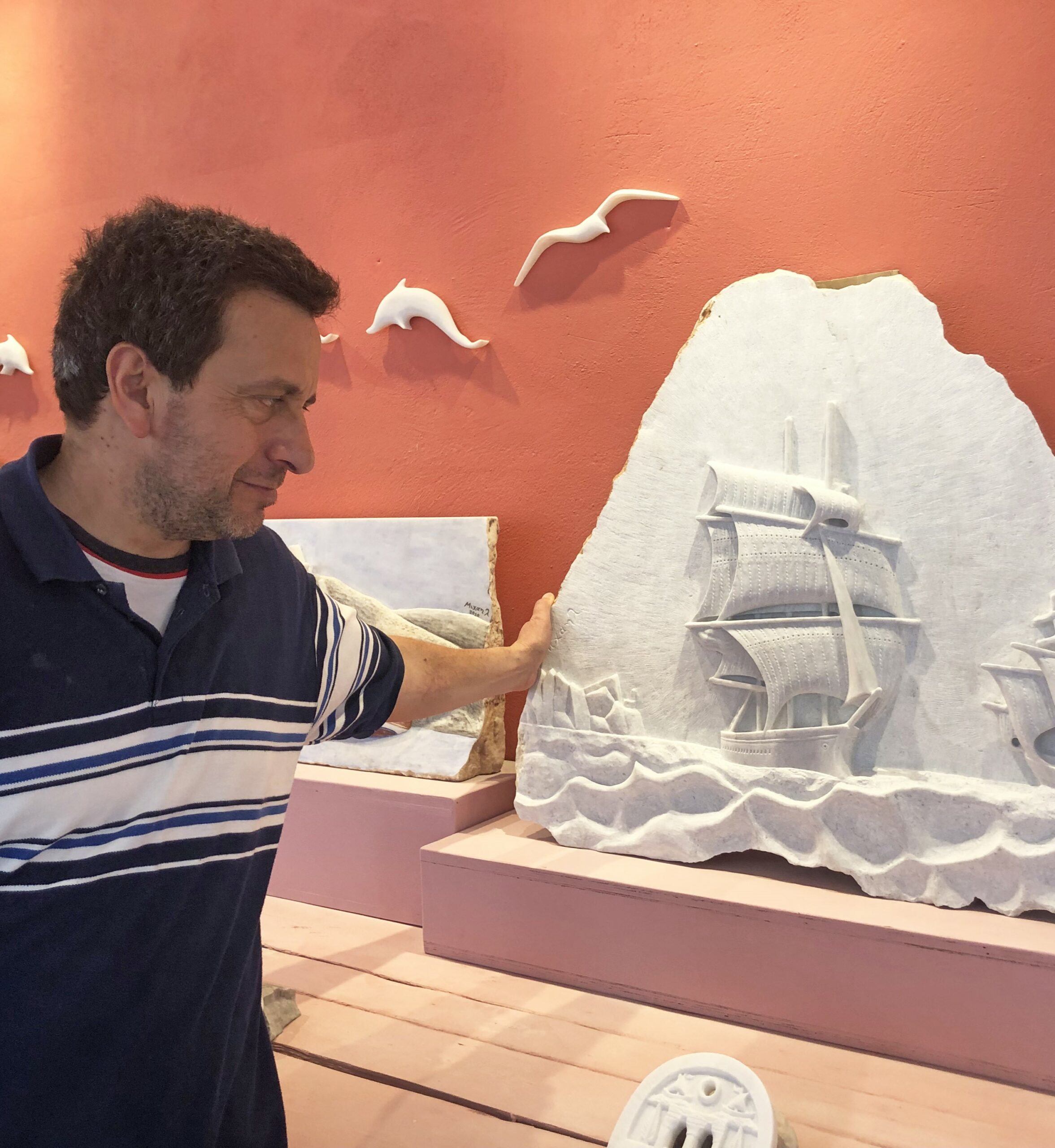 Toν Μιχάλη τον γνώρισα πριν από 20 χρόνια κι όμως φαίνεται σαν χθες. Το εργαστήριο-πωλητήριό του είναι γεμάτο έργα, με το αγαπημένο μου, τα καΐκια σε τρικυμία, με τα λεπτεπίλεπτα κατάρτια και πανιά, να παραμένει σε περίοπτη θέση, όπως άλλοτε. Μόνο που τώρα στη βιτρίνα έχει προστεθεί ένα ακόμη αριστουργηματικό δημιούργημα, ένα μαρμάρινο κοφίνι με σταφύλια, με λεπτομέρεια τόση που νομίζεις ότι είναι αληθινό. Bάρκες, καΐκια και υπέρθυρα, ελιές, τα δέντρα της ζωής, καθώς και πιο μοντέρνα αφαιρετικά έργα δημιουργούνται από τη σμίλη του ακούραστου Μιχάλη που συνεχίζει με σεμνότητα και εργατικότητα τη μακραίωνη παράδοση της μαρμαροτεχνίας.
