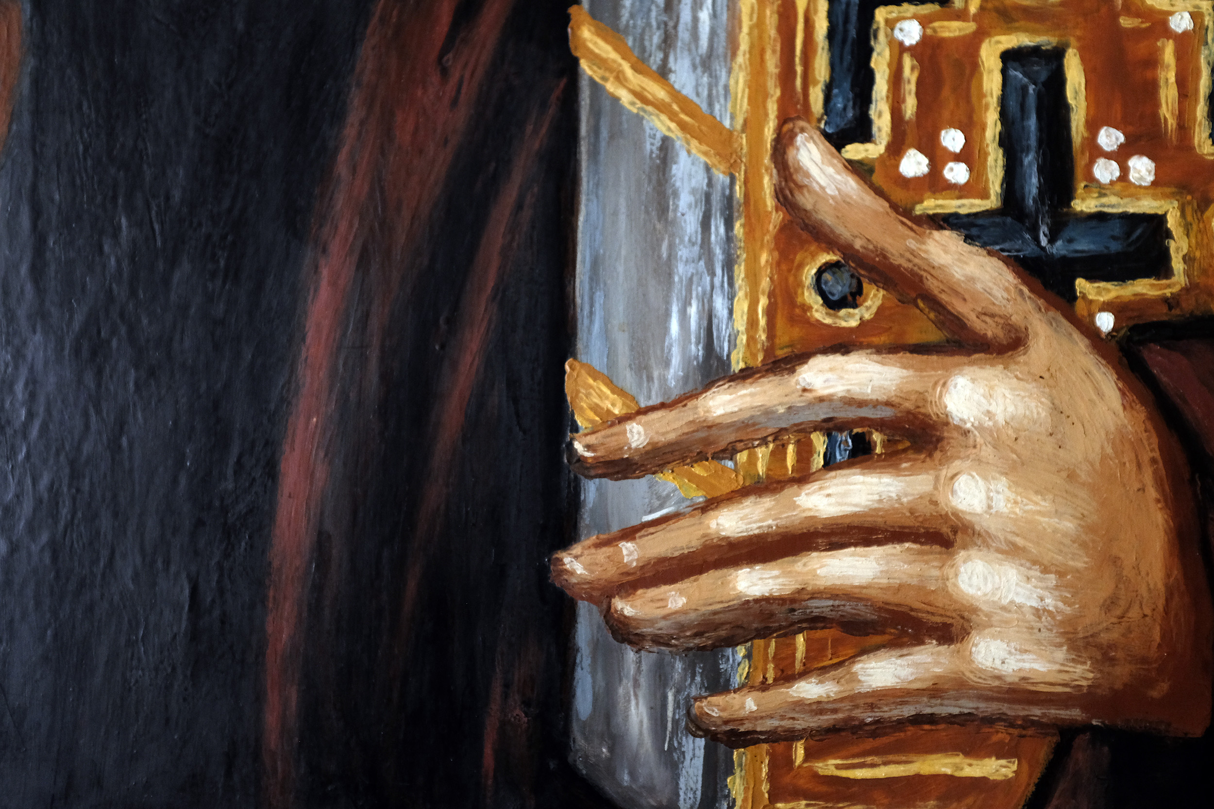 Για να με συναντήσει, έχει διακόψει για λίγο την εργασία του στην απεικόνιση της σκηνής, του «Αποχαιρετισμού των τεσσάρων Μαρτύρων», οι οποίοι ήταν από τις Μέλαμπες και με ξεναγεί στους τέσσερις τοίχους οι οποίοι φιλοξενούν τα έργα του περιγράφοντάς τα ένα προς ένα. Η μεταφορά μας στον κόσμο της αγιογραφίας διακόπτεται προσωρινά από την είσοδο της μητέρας του στο χώρο, η οποία με καλωσορίζει με θέρμη και ένα πλατύ χαμόγελο. Η στροφή στην κουβέντα μας έρχεται όμως όταν αρχίζει να μου μιλά για την αγάπη του στην κατασκευή διακοσμητικών μαχαιριών. «Αγιογραφίες και μαχαίρια», σκέφτηκα αυτόματα, τι παράξενος αλλά και κάπως ταιριαστός συνδυασμός. Μην πάει ο νους σε μαχαίρια κρητικά, παραδοσιακά τοπικά και ολίγον τουριστικά. Ο Παναγιώτης αναζήτησε μόνος του και έμαθε να κατασκευάζει μικρά έργα τέχνης, επηρεασμένος, κυρίως από την ιαπωνική τέχνη και αισθητική. Εμπνέεται επίσης από εποχές διάφορες, την Αναγέννηση αλλά και τον Μεσαίωνα.