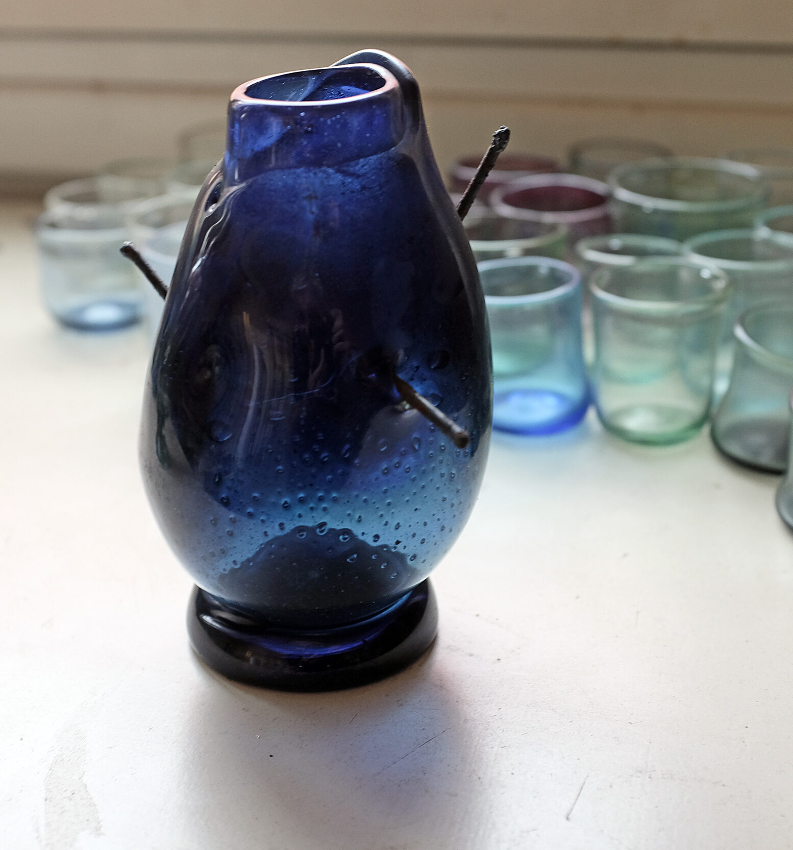 Φυσητό, χειροποίητο γυαλί, αυτή είναι η τέχνη του Νίκου Χαριτάκη. «Πρώτη ύλη του, το ανακυκλωμένο γυαλί. Το λιώνει σε καμίνι και το δουλεύει σε ελεύθερες φυσητές φόρμες χωρίς καλούπια. Το κάθε αντικείμενο, ξεχωριστά, αποκτά την κίνηση και τις γραμμές του μέσα από φυσήματα, στροβιλίσματα και σμίλεμα με τα χέρια», αναγράφεται στην επίσημη ιστοσελίδα του πωλητηρίου του Μουσείου Μπενάκη, όπου φιλοξενούνται δημιουργίες του εδώ και κάμποσα χρόνια.