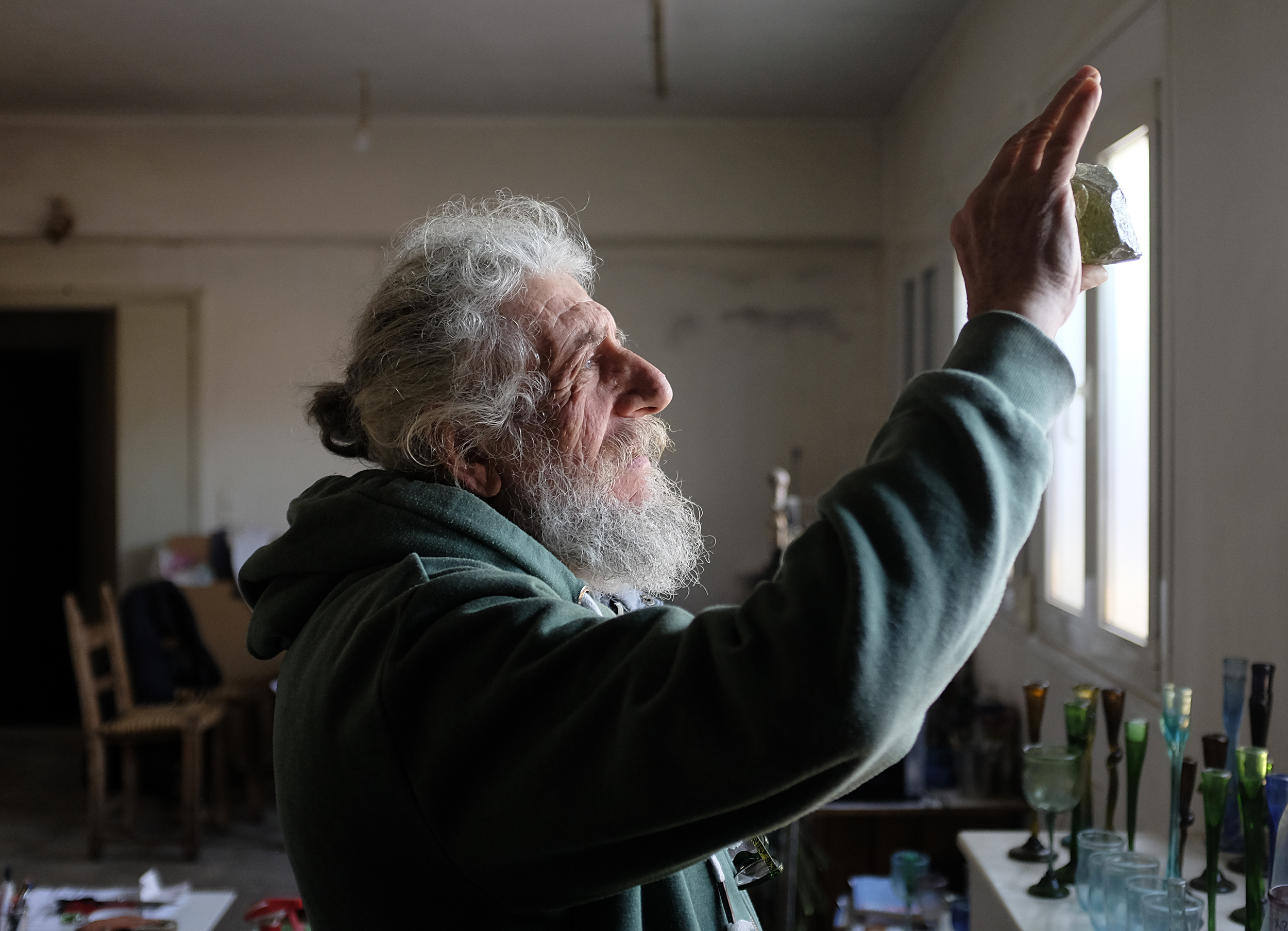 Το πρόσωπο και τα χέρια του φανερώνουν ιστορίες και συσσωρευμένες εμπειρίες από μια ζωή πολύπλευρη. Δούλευε οικοδομές, μπετά και μετά σοβά. Έχει σερβίρει σε καφετέρια για σεζόν σε μια εποχή όπου αυτή η έννοια ήταν αρκετά διαφορετική, έχει ζήσει μέχρι και στη Ζυρίχη όπου μυήθηκε στην τέχνη του γυαλιού. Έχει γνωρίσει, έχει συναναστραφεί και συνεργαστεί και συνεχίζει να συνεργάζεται με ανθρώπους γνωστούς και λιγότερο γνωστούς αλλά όχι λιγότερο σημαντικούς από κάθε γωνιά του πλανήτη. Οι κουβέντες του καθώς μου μιλά για τη ζωή του, κρύβουν και φανερώνουν ταυτόχρονα μια εμπειρία και μια παιδικότητα, μια εφηβική διάθεση για τα πάντα και μια ώριμη επιλεκτικότητα, ένα γούστο στο κλασικό και μια ασυγκράτητη έκφραση του νεωτερικού.