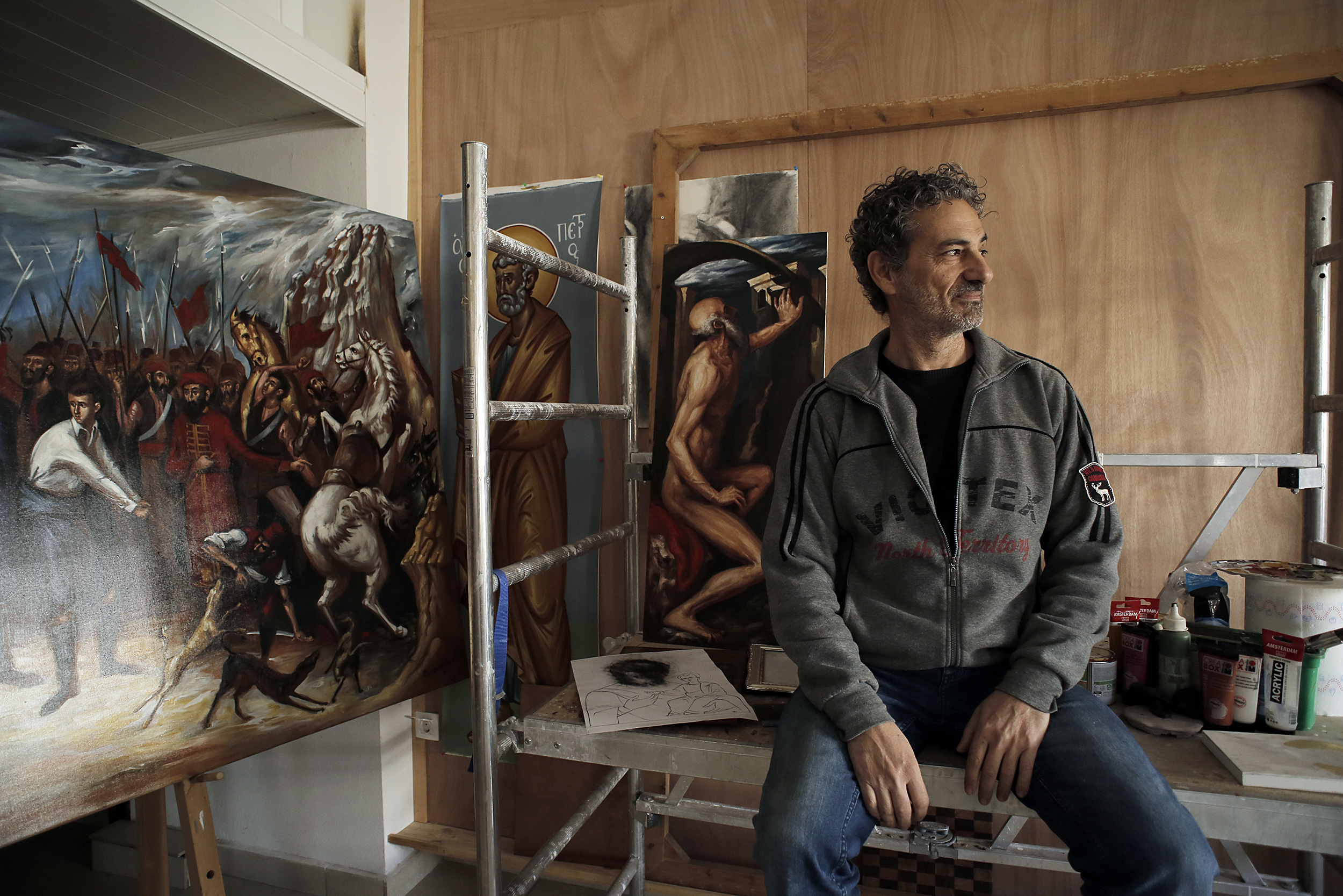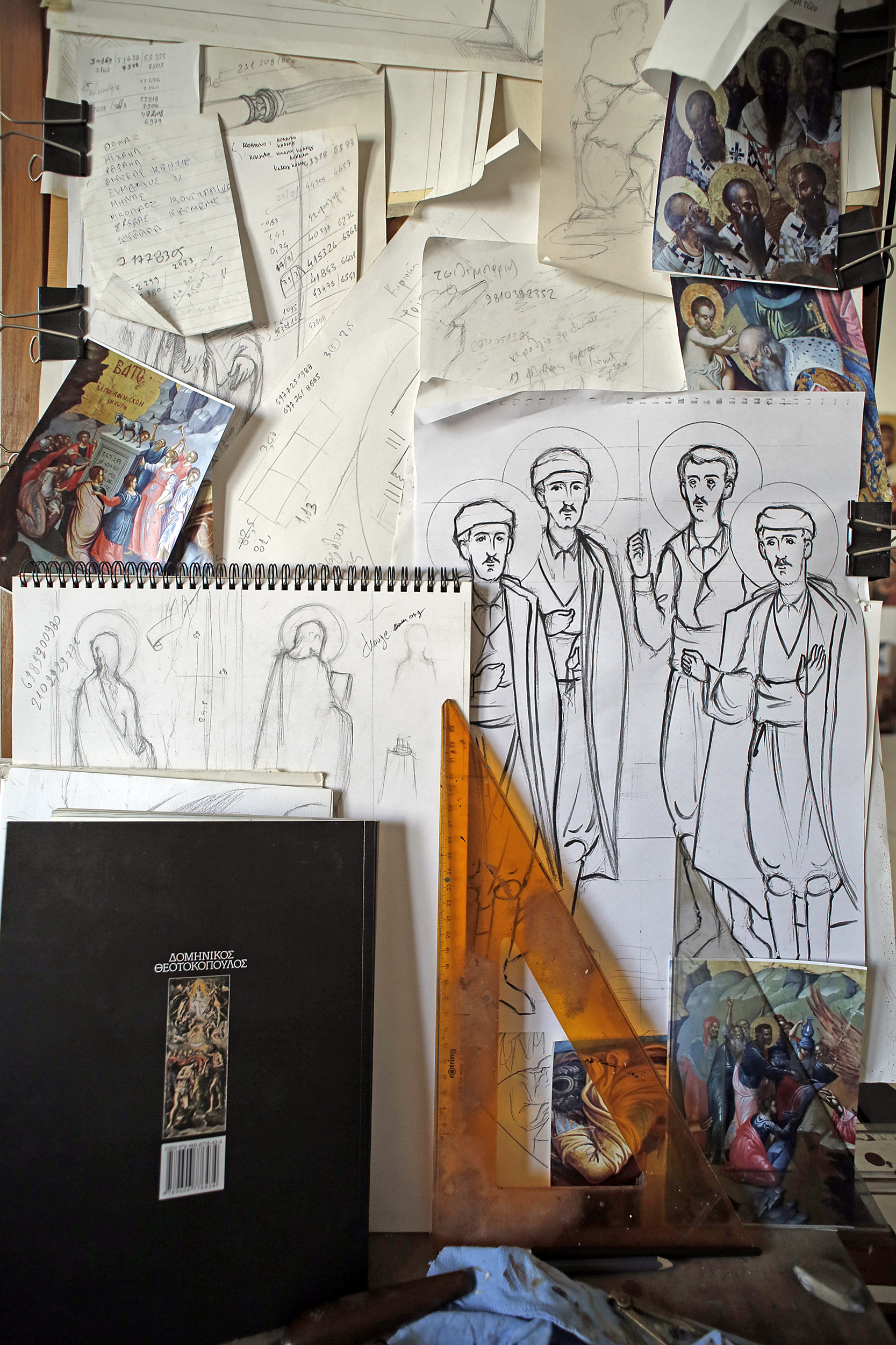 Κάθιδρος και εξαιρετικά ντροπιασμένος, φθάνω επιτέλους, χωρίς γρατζουνιά, στο εργαστήριο του Παναγιώτη Παπαδομιχελάκη με τον οποίο είχα κανονίσει να βρεθώ και να γνωρίσω τη δουλειά του. Το ατελιέ στην κάτω γειτονιά του χωριού είναι δροσερό, αρκετά φωτεινό και γεμάτο χρώματα. Η τέχνη της αγιογραφίας εκφράζεται εδώ με πολλούς τρόπους, από προσωπογραφίες Αγίων, μέχρι βιβλικές σκηνές, αποτυπωμένες σε διάρκεια ετών, μερικές φορές, σε καμβάδες μεγάλους και επιβλητικούς. Με καταγωγή από τις Μέλαμπες, έφυγε στην Αθήνα για να σπουδάσει αγιογραφία και σκηνογραφία. Ήδη μετράει 35 χρόνια ως αγιογράφος και ζει, εδώ και 12 χρόνια, μόνιμα πια στον τόπο καταγωγής του.
