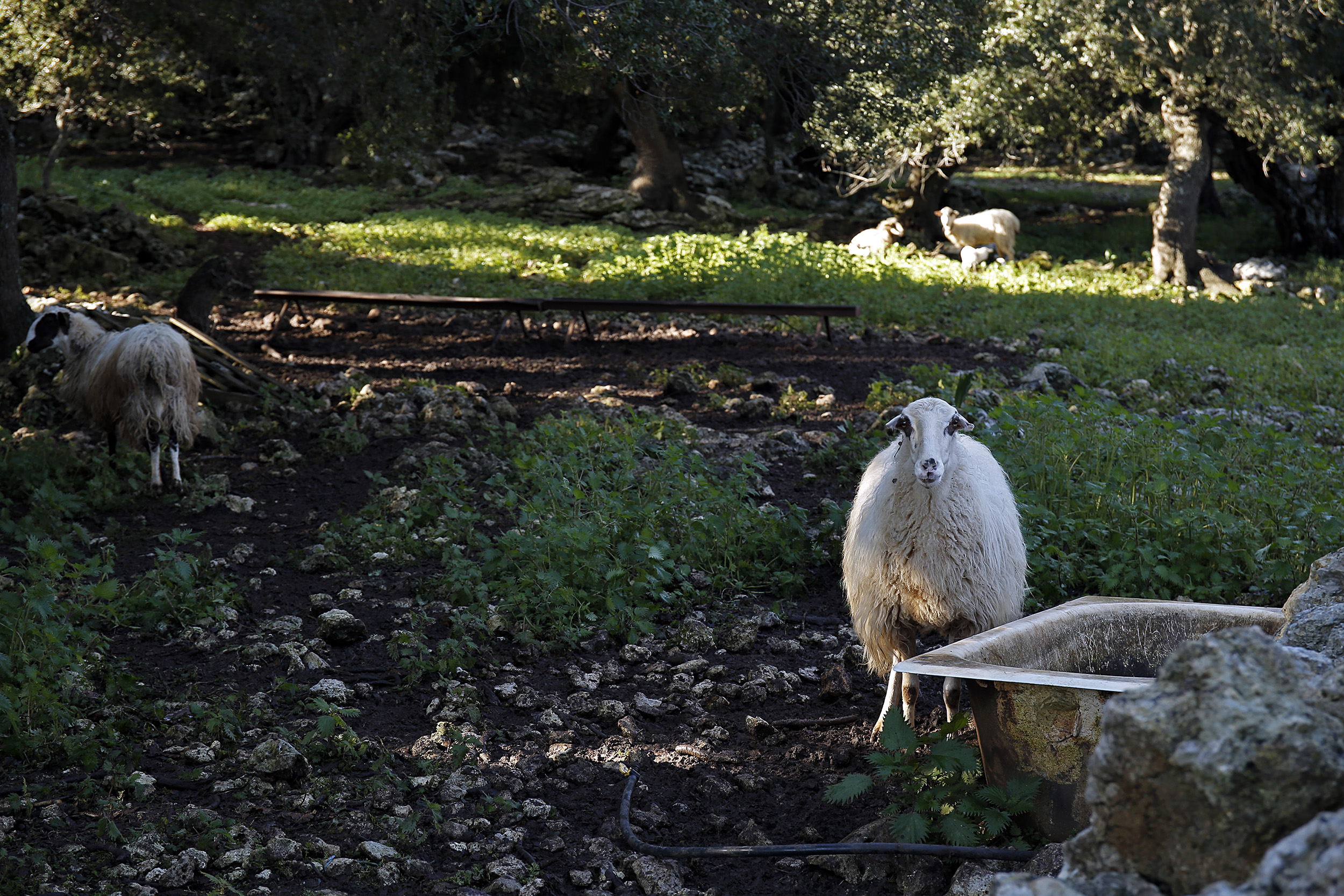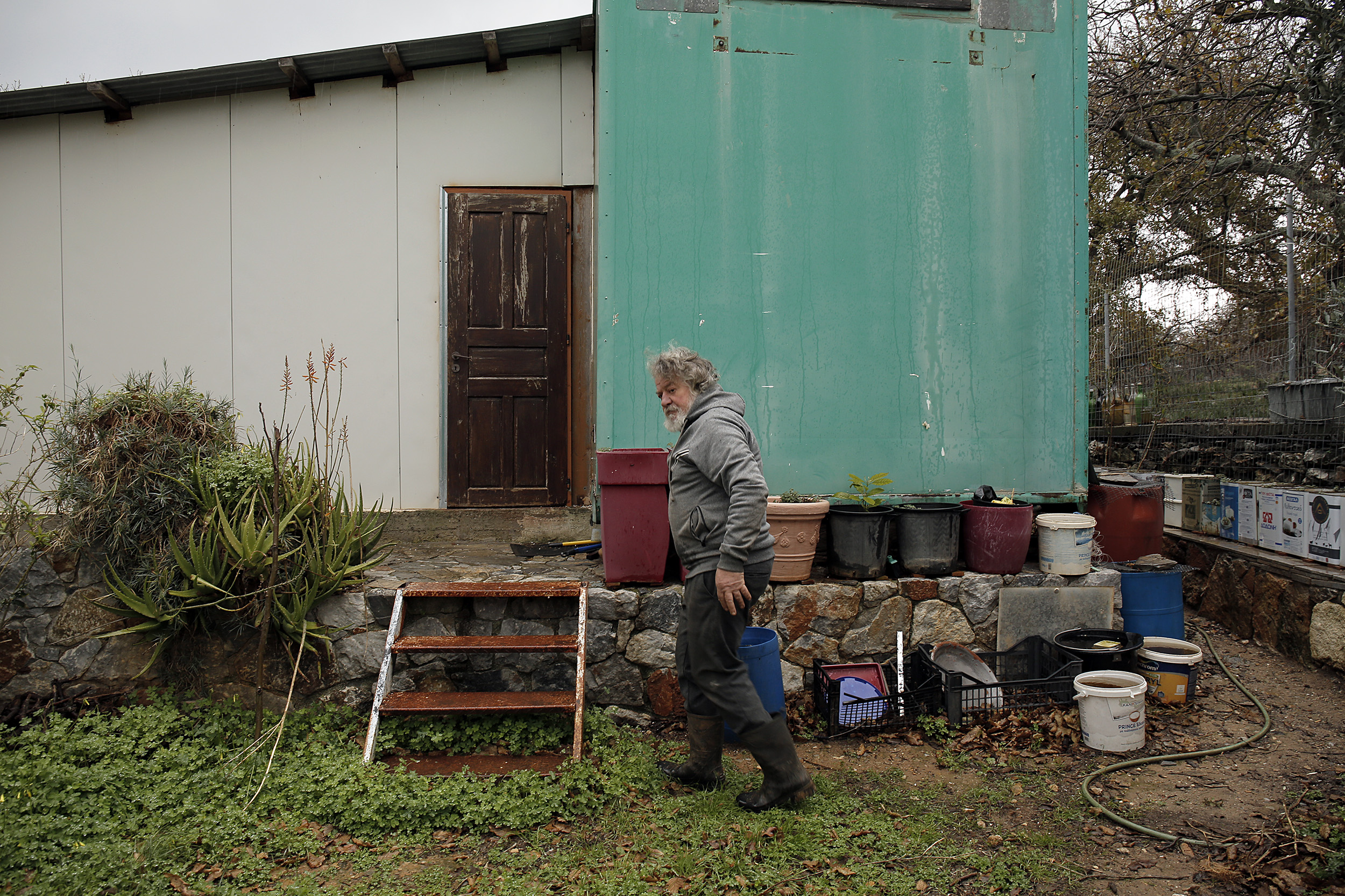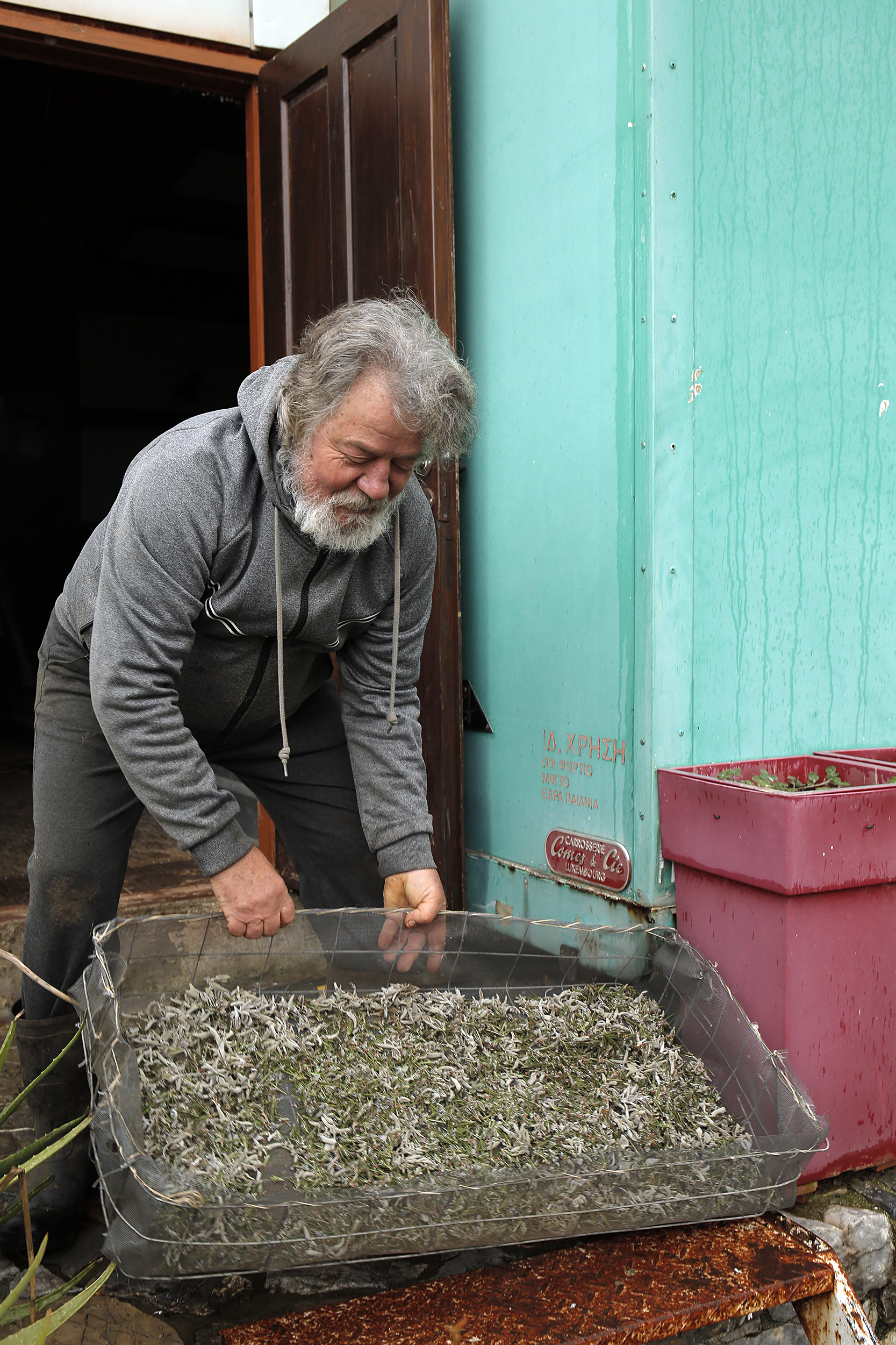 Η φυσική κοπριά κάνει όλη τη δουλειά, βλέπω περπατώντας ανάμεσα στα μικρά λοφάκια που είναι στοιβαγμένη. Ο Τζέκος ο καφετής και ο Μπάμπης ο μαύρος, τα δυο σκυλιά του Άγγελου είναι διαρκώς μαζί μας καθώς περπατούμε κάτω από την ασταμάτητη βροχή που χαρακτηρίζει το πρωινό. Στο δωμάτιο που μπαίνουμε να προφυλαχτούμε, άνθρωποι και σκύλοι, καθόμαστε ανάμεσα σε δίχτυα με αποξηραμένα βότανα αλλά και δύο σετ από κρουστά και ντραμς, καθώς και μια κονσόλα μίξης, αφού ο γιος του Άγγελου, ο Γιώργος Καπαρός είναι μουσικός και αυτό είναι το βασίλειό του.