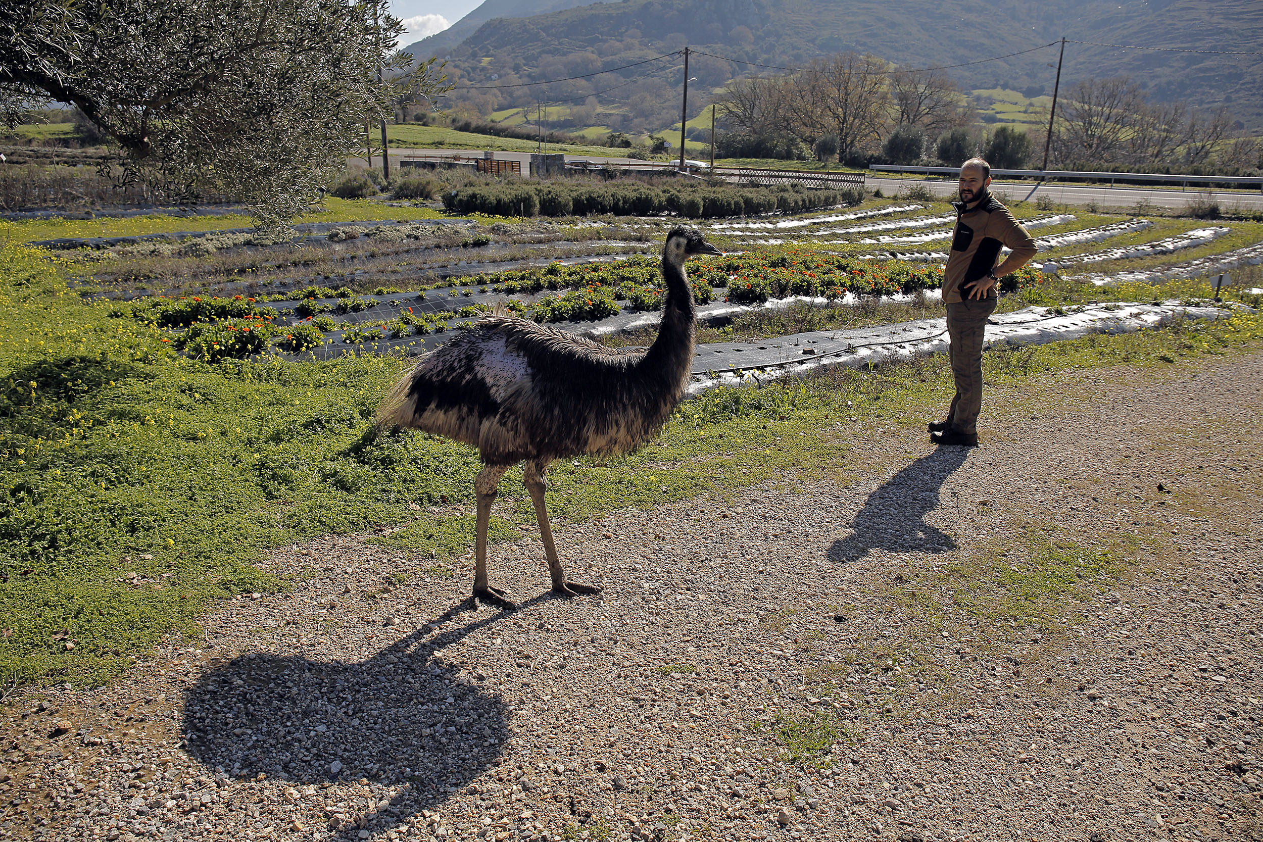 Παρέα στην ξενάγησή μου στο κτήμα από τον Κωστή Θεοδωράκη, μας κάνουν και δύο ευφυέστατα και λίγο «κουτσομπόλικα» Εμού, τα δεύτερα σε μέγεθος και εξαιρετικά γρήγορα πτηνά του κόσμου. Νιώθω διαρκώς το βλέμμα τους καρφωμένο επάνω μου και ο μακρύς, σαν στρουθοκαμήλου, λαιμός τους με πλησιάζει διαρκώς και ξανατραβιέται με κινήσεις σχεδόν χορευτικές σε μια επικοινωνία αναγνώρισης και φιλικής προσέγγισης.