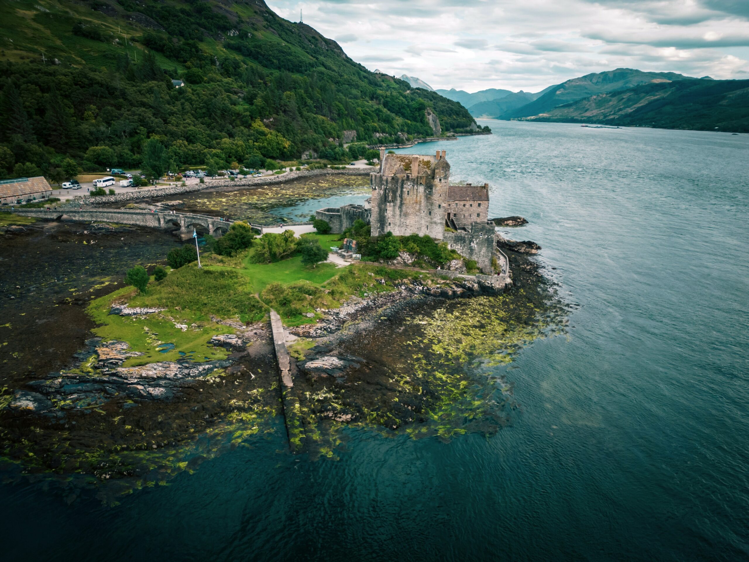Στην πραγματικότητα, το κάστρο είναι χτισμένο πάνω σε ένα μικρό νησάκι, το οποίο συνδέεται με την ακτή μέσω μιας πέτρινης γέφυρας. Στρατηγικά τοποθετημένο, μοιάζει να επιπλέει στα γαλήνια νερά, στο σημείο όπου ενώνονται τρεις από τις πιο επιβλητικές λίμνες της Σκωτίας. Γύρω του, οι δασωμένες πλαγιές των βουνών του Kintail ενισχύουν τη γοητεία του, ενώ στο βάθος, το μυστηριώδες Isle of Skye προσθέτει μια σχεδόν ονειρική διάσταση στο τοπίο. Το βλέμμα αφήνεται να περιπλανηθεί πάνω από τα νερά των λιμνών, που καθρεφτίζουν την επιβλητική όψη του πιο πολυφωτογραφημένου κάστρου της Σκωτίας, με ιστορία που ξεκινά από τον 13ο αιώνα.