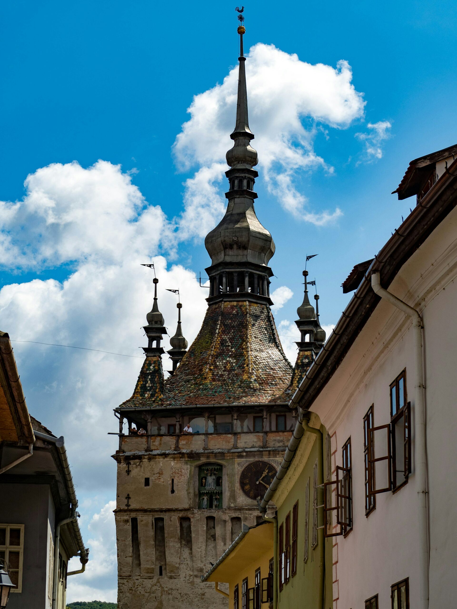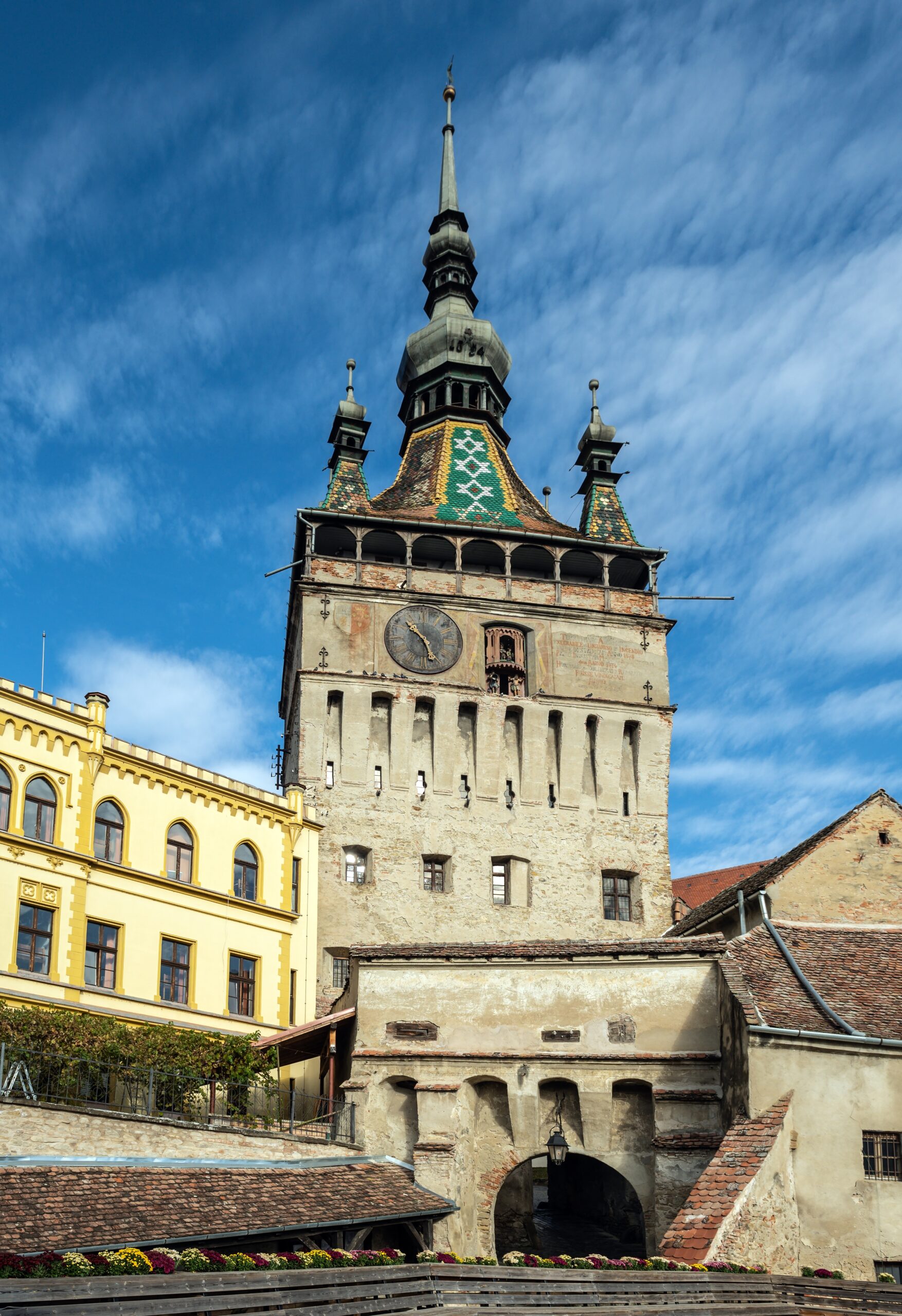 Πίσω της βρίσκεται ο Πύργος των Σιδηρουργών και δίπλα της ο Πύργος του Ρολογιού, γνωστός και ως Πύργος του Δημαρχείου, που χτίστηκε το δεύτερο μισό του 14ου αιώνα και επεκτάθηκε τον 16ο, ο οποίος ήλεγχε την κύρια πύλη του αμυντικού τείχους και αποθήκευε τους θησαυρούς της πόλης. Σήμερα λειτουργεί ως «Μουσείο της Πόλης» και προσφέρει επίσης υπέροχη θέα στην περιοχή. Οι τέσσερις μικροί γωνιακοί πυργίσκοι στην κορυφή του πύργου συμβόλιζαν τη δικαστική αυτονομία του Δημοτικού Συμβουλίου, το οποίο μπορούσε να εφαρμόσει, εάν ήταν απαραίτητο, τη θανατική ποινή. Μετά από μια πυρκαγιά το 1676, όταν εξερράγη η πυρίτιδα της πόλης που βρισκόταν στον Πύργο των Ραφτών, Αυστριακοί καλλιτέχνες ανακατασκεύασαν την οροφή του πύργου στο σημερινό μπαρόκ στυλ του και το 1894 προστέθηκαν πολύχρωμα πλακάκια.