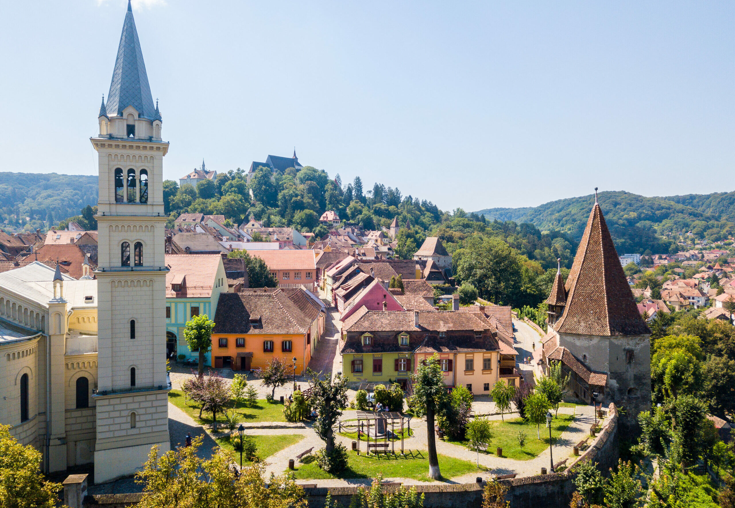 Πίσω από την πλατεία βρίσκεται το άγαλμα του Βλαντ και ακριβώς δίπλα το μεγάλο και άκρως εντυπωσιακό δημαρχείο της πόλης του 1888, το οποίο στην πίσω του πλευρά έχει όμορφους κήπους και παγκάκια για να απολαύσετε τη θέα στην Κάτω Πόλη, δηλαδή την πόλη που απλώνεται κάτω από την Ακρόπολη. Παραδίπλα θα δείτε την ταπεινή Εκκλησία της Δομινικανής Μονής, σε ύστερο γοτθικό ρυθμό του 13ου αιώνα, η οποία αναστηλώθηκε τον 15ο αιώνα και στη συνέχεια ξανά τον 16ο αιώνα μετά τη μεγάλη πυρκαγιά του 1676 και πήρε τη σημερινή της μορφή μετά τις επισκευές του 1929. Στο εσωτερικό της μπορείτε να θαυμάσετε τη χάλκινη κολυμπήθρα του 1440, το πέτρινο πλαίσιο της πόρτας του 1570 που είναι σκαλισμένο σε αναγεννησιακό στιλ της Τρανσυλβανίας, τη συλλογή ανατολίτικων χαλιών του 16ου και 17ου αιώνα που είναι κρεμασμένα στους τοίχους της, ένα μπαρόκ όργανο επίσης του 17ου αιώνα και ένα υπέροχο σκαλιστό τρίπτυχο του 1680. Η εκκλησία μάλιστα φιλοξενεί συχνά συναυλίες κλασικής μουσικής.
