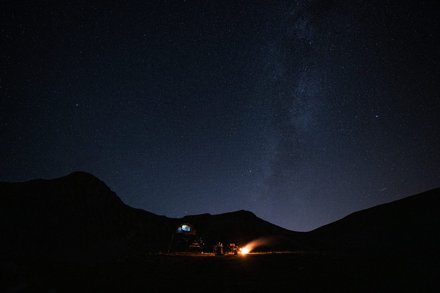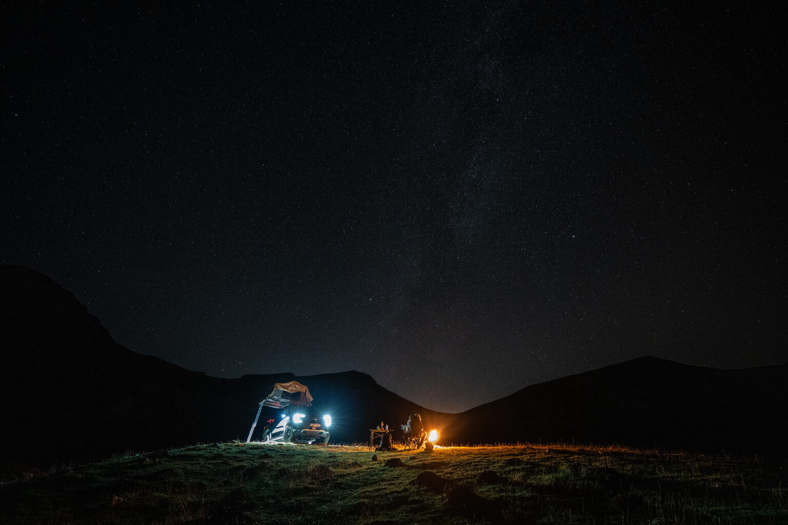 Με το σκοτάδι να απλώνεται, ξεκινά το δεύτερο κεφάλαιο της περιπέτειάς μας. Επιστρέφουμε στο σημείο στάθμευσης, όπου στήνουμε τον καταυλισμό μας. Η μικρή φωτιά που ανάβουμε γίνεται το επίκεντρο της βραδιάς -ένας φάρος θαλπωρής μέσα στο σκοτάδι του βουνού. Τα ξύλα που είχε προνοήσει να φέρει ο Δημήτρης αποδεικνύονται πολύτιμα, καθώς η θερμοκρασία πέφτει αισθητά. Η σκηνή οροφής ανοίγει σαν καταφύγιο πολυτελείας, ενώ οι καρέκλες τοποθετούνται στρατηγικά γύρω από τη φωτιά.