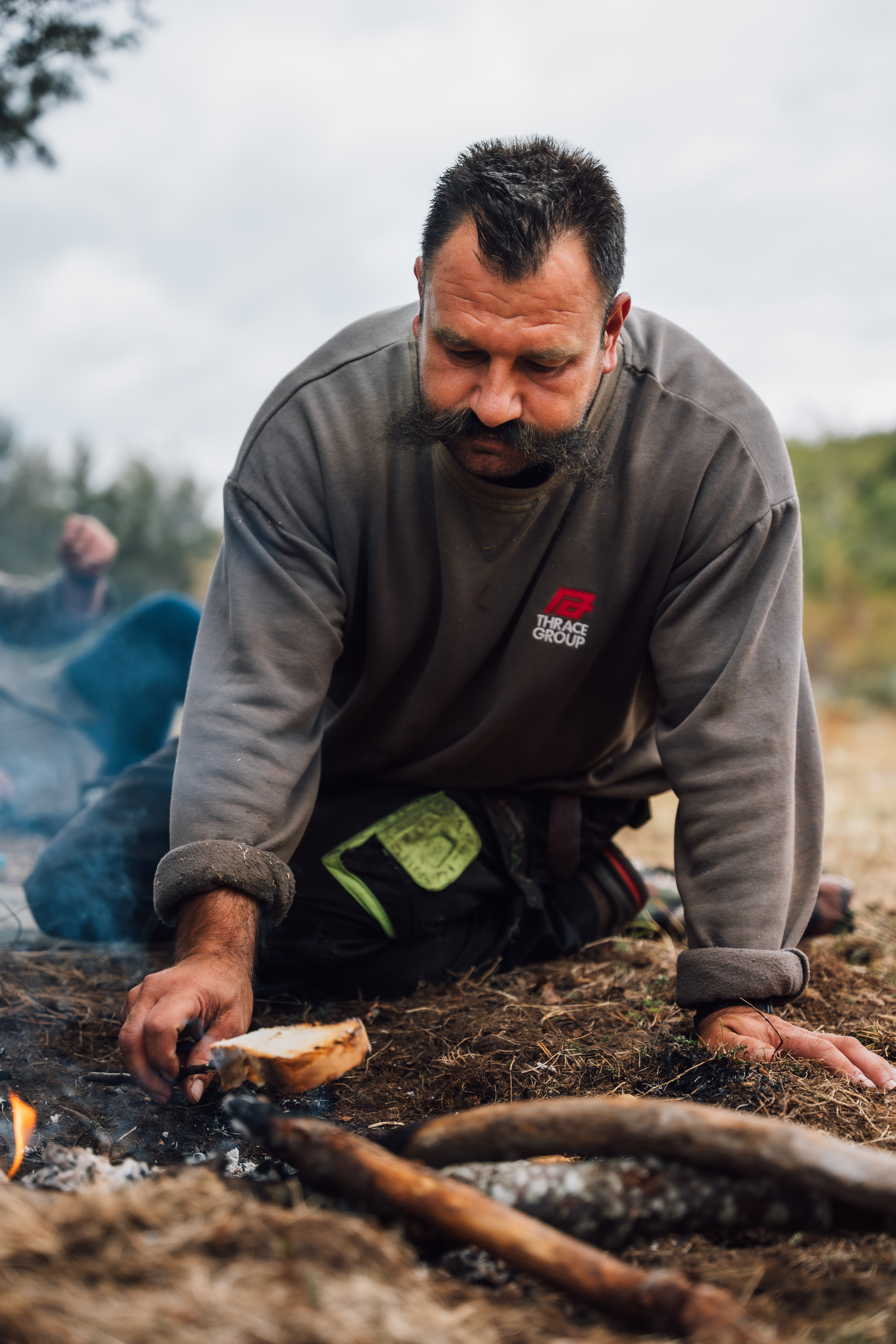 Ο Χασάν και ο πατέρας του Ραμαζάν μάς υποδέχονται στο διάλειμμα του πρωινού τους κολατσιού. Ζεσταίνουν το ψωμί στη φωτιά που σιγοκαίει, μοιράζονται μαζί μας λίγο χαλβά. Κάθονται δίπλα σε επιβλητικές στοίβες ξύλων, που μοιάζουν με φυσικά γλυπτά μέσα στο δάσος. Η εικόνα είναι επιβλητική: σειρές από στοιβαγμένους και τεμαχισμένους κορμούς δέντρων, μάρτυρες της σκληρής δουλειάς που γίνεται εδώ.