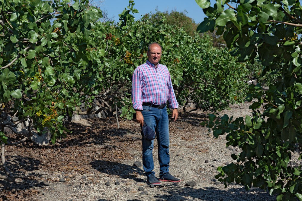 Ελιές, λοιπόν, πεύκα –βλέπουμε κάμποσα και από αυτά εδώ και εκεί στο νησί – και φιστικές. Να, μια ωραία ιστορία, όπως αρέσκεται να λέει και να διηγείται ο Νομικός: «Τις φιστικιές τις έφερε στη Σαντορίνη ο συνονόματος μου, Πέτρος Νομικός (πρόκειται για τον ιδρυτή του Συνεδριακού Κέντρου της Σαντορίνης στα Φηρά), σε μια προσπάθεια διεύρυνσης των καλλιεργειών του νησιού. Η φιστικιά αγαπάει την άνυδρη γη και πράγματι έπιασε. Στην αρχή, λοιπόν, τις χάριζε και δεν τις έπαιρνε κανένας. Όταν άρχισε να τις πουλάει τότε τις πήρανε κάποιοι. Ο πατέρας μου δεν είχε χρήματα να αγοράσει δέντρα και οι φιστικιές που βλέπετε εδώ στο κτήμα είναι φυτεμένες από κουκούτσια».