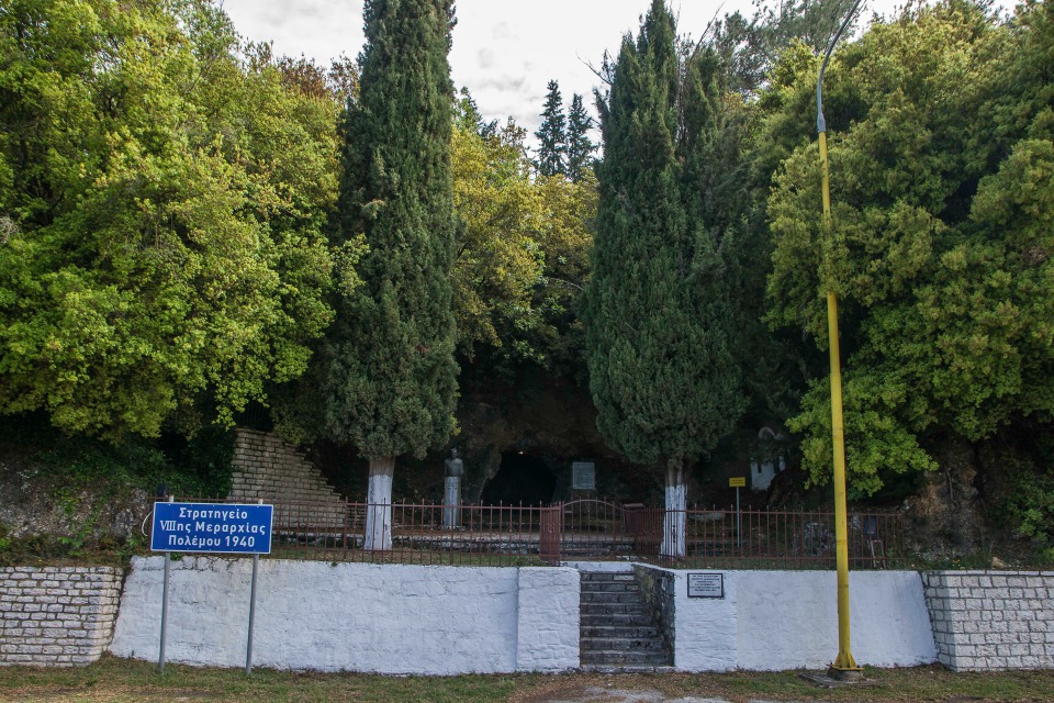 Συναντώντας τα πρώτα σπίτια του χωριού, στην στροφή δεξιά, βρίσκεται η σπηλιά που χρησιμοποιήθηκε ως τακτικό στρατηγείο την περίοδο του πολέμου. Εδώ μέσα ο Κατσιμήτρος και οι συνεργάτες του έγραψαν ιστορία, καθηλώνοντας τους Ιταλούς παρά τις … «Σειρήνες».