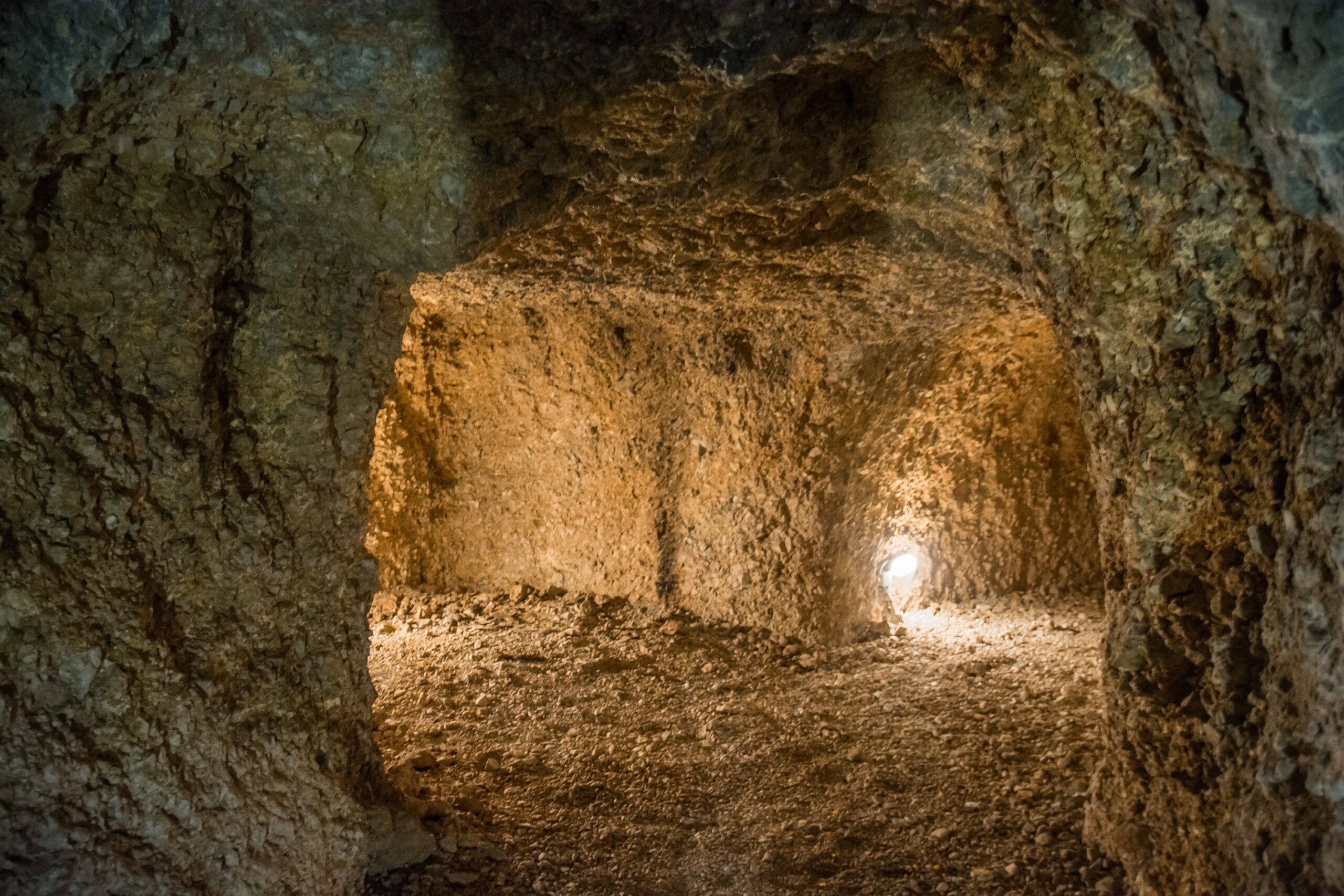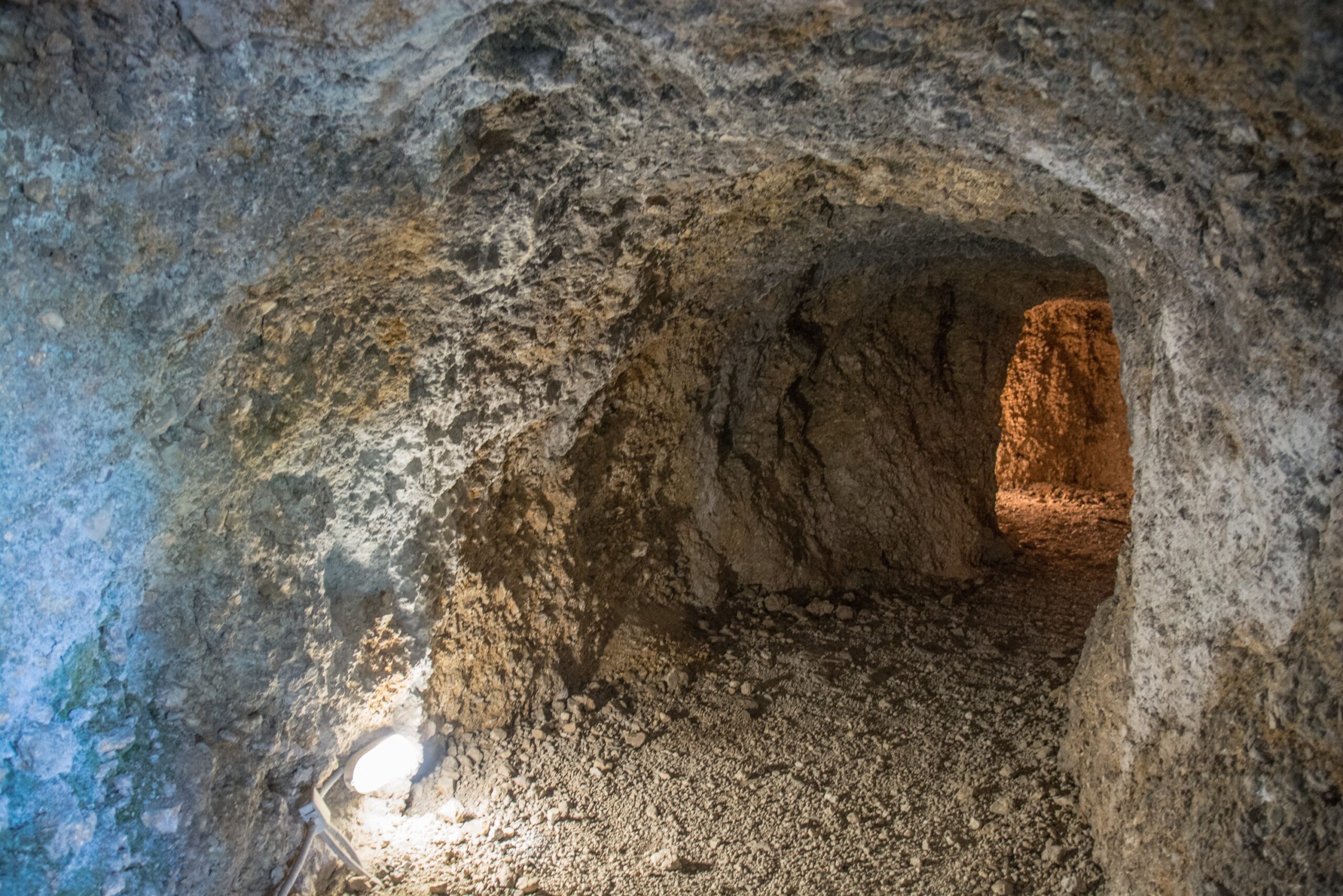 Πρόκειται ουσιαστικά για ένα τεχνητό σπήλαιο στους νότιους πρόποδες του λόφου Γοριτσάκι, που διανοίχτηκε -σύμφωνα με τα προβλεπόμενα σχέδια πριν από την ιταλική επίθεση- για τη στέγαση του πολεμικού Στρατηγείου της 8ης Μεραρχίας Ηπείρου. Είναι σε μορφή πετάλου, με είσοδο και έξοδο, και το συνολικό μήκος του αγγίζει τα 34 μ. και το πλάτος τα 2 μ. Στο μέσο του βρισκόταν ο χώρος με το γραφείο του Κατσιμήτρου και το τραπέζι του επιτελείου, πάνω στο οποίο ήταν αραδιασμένοι στρατιωτικοί χάρτες, σχεδιαγράμματα, διαταγές κ.α. Περπατώντας μέσα στον υγρό διάδρομο,θαρρείς πως ακούς τις συνομιλίες του Κατσιμήτρου με τους επιτελείς του. Φωνές γεμάτο ένταση, αγωνία αλλά και επιφωνήματα χαράς και ικανοποίησης μετά από κάθε επιτυχία στο πεδίο της μάχης.