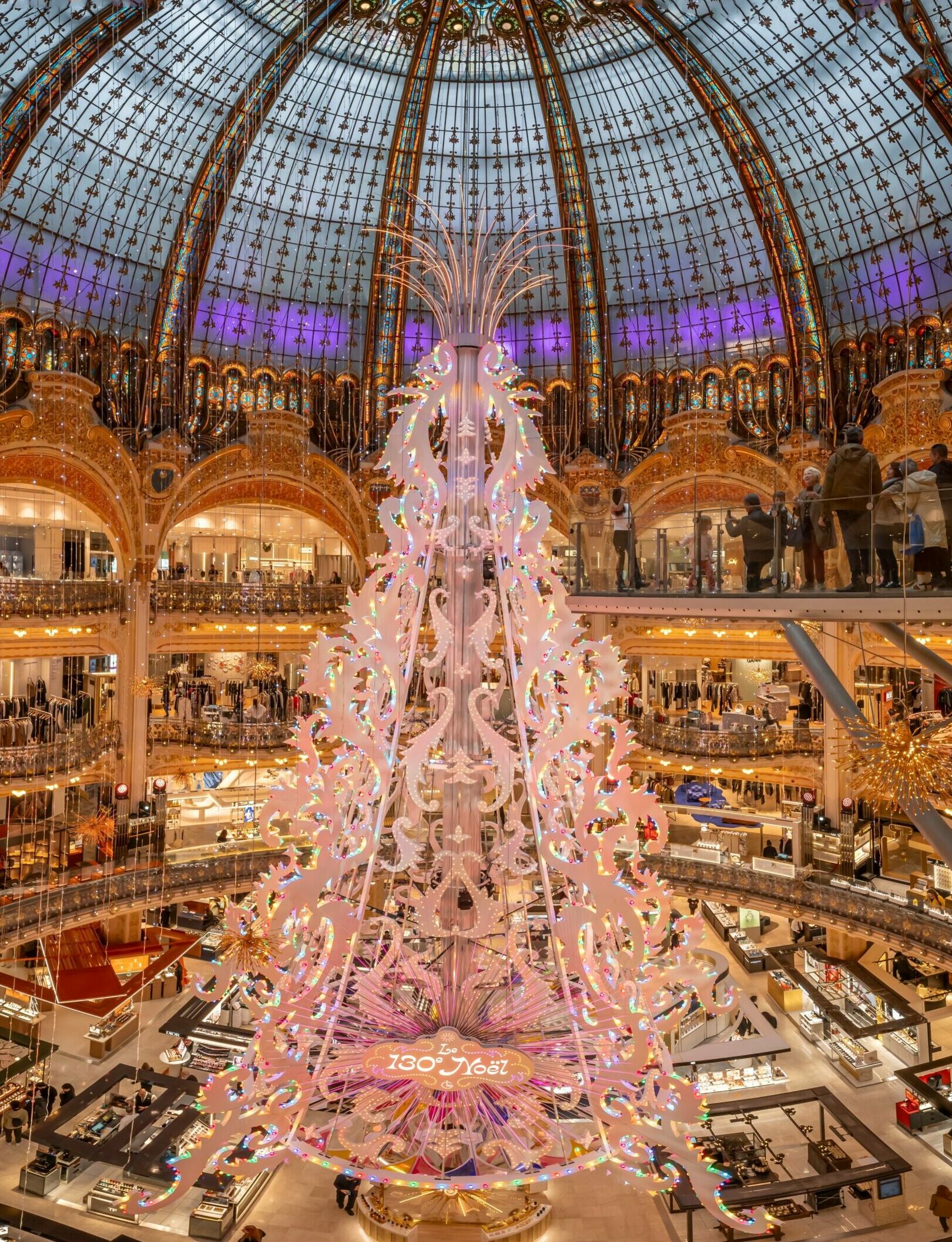 Οι Galeries Lafayette φέτος πρωτοπορούν καθώς γιορτάζουν τα 130 χρόνια τους. Στο επίκεντρο βρίσκεται το γιγαντιαίο Χριστουγεννιάτικο δέντρο που στήθηκε κάτω από τον art deco γυάλινο τρούλο. Το προχωρημένο concept του ροζ δέντρου από αλουμίνιο και πλέξι γκλας με τα 20.000 φωτάκια, υπογράφει ο νεαρός Ελβετός σχεδιαστής Kevin Germanier -που έγινε γνωστός διεθνώς χάρη στη δημιουργία του κουστουμιού με τις 2000 πέρλες για τον εμβληματικό «Χρυσό Εξερευνητή», τον ταξιδιώτη από το μέλλον, στην τελετή λήξης των Ολυμπιακών Αγώνων του Παρισιού. Στην πελώρια κατασκευή του δέντρου χρησιμοποιούνται οπτικές ίνες και σε τακτά διαστήματα γίνεται light show που θαυμάζουν οι επισκέπτες από τους γυάλινους εξώστες.