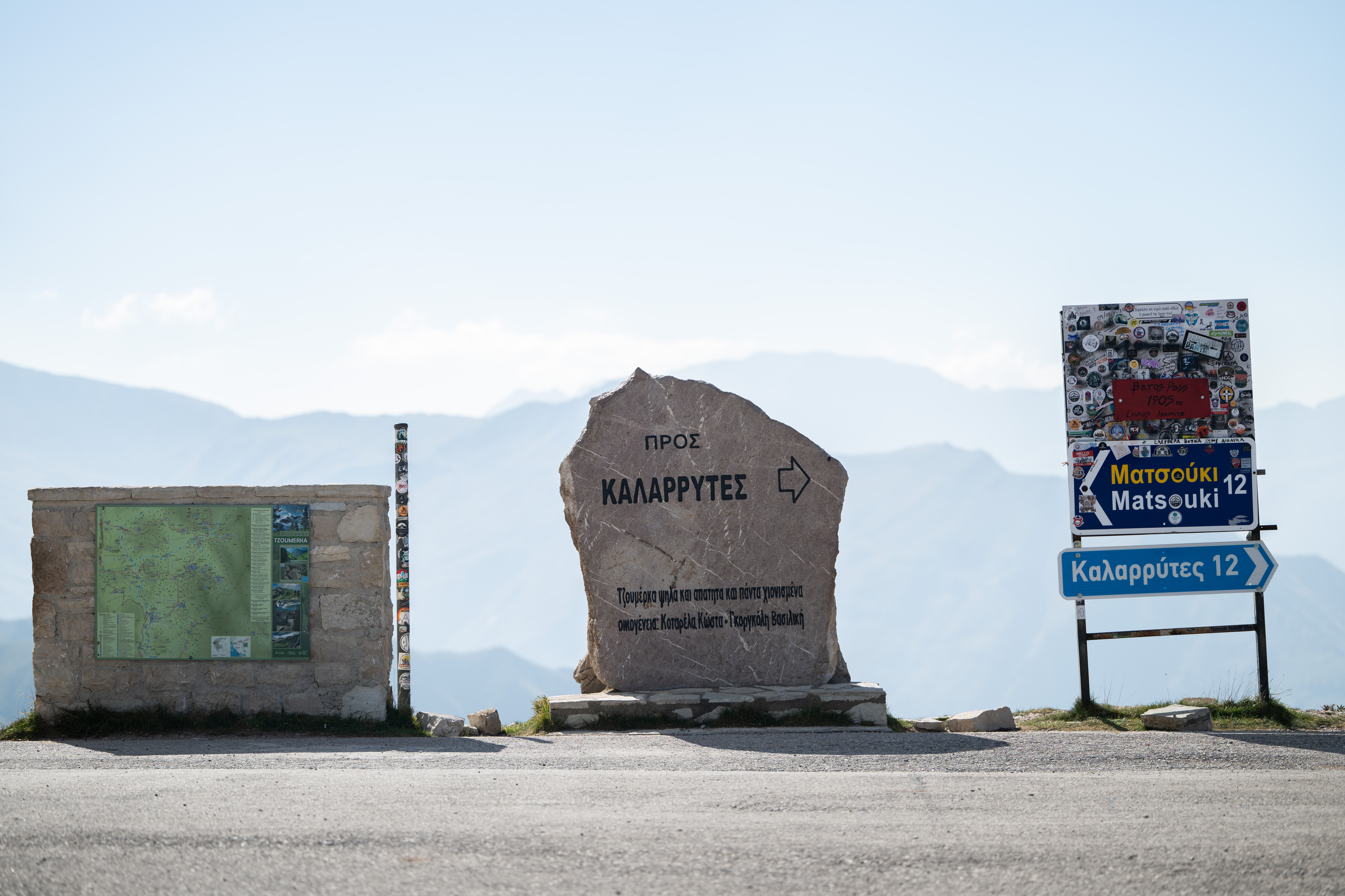 Συνεχίζουμε και φτάνουμε στο ψηλότερο σημείο της διαδρομής. Είναι εδώ που έχοντας πλέον περάσει στην Ήπειρο, απλώνονται μπροστά μας τα Τζουμέρκα. Εδώ, μία χαρακτηριστική πέτρινη στήλη, που σηματοδοτεί το υψηλότερο σημείο του περάσματος, στα 1.905 μέτρα. Σταματήσαμε. Έπρεπε. Η θέα ήταν καθηλωτική και μοναδική. Πίσω μας η Θεσσαλία απλωνόταν μέχρι εκεί που έφτανε το μάτι, μπροστά μας ατελείωτες βουνοκορφές. Και μόνο για αυτή την εικόνα αξίζει έστω μία φορά να βρεθούμε όλοι μας σε αυτό το σημείο. Είσαι τόσο μακριά από όλους και ταυτόχρονα τόσο κοντά με όλους εκείνους που αγαπάμε. Αυτή το απέραντο μωσαϊκό, δημιουργεί άλλες προτεραιότητες και έστω για λίγο θα μας κάνει όλους να θέσουμε σωστές προτεραιότητες. Τα σύννεφα έμοιαζαν τόσο κοντά που νόμιζες ότι μπορούσες να τα αγγίξεις.