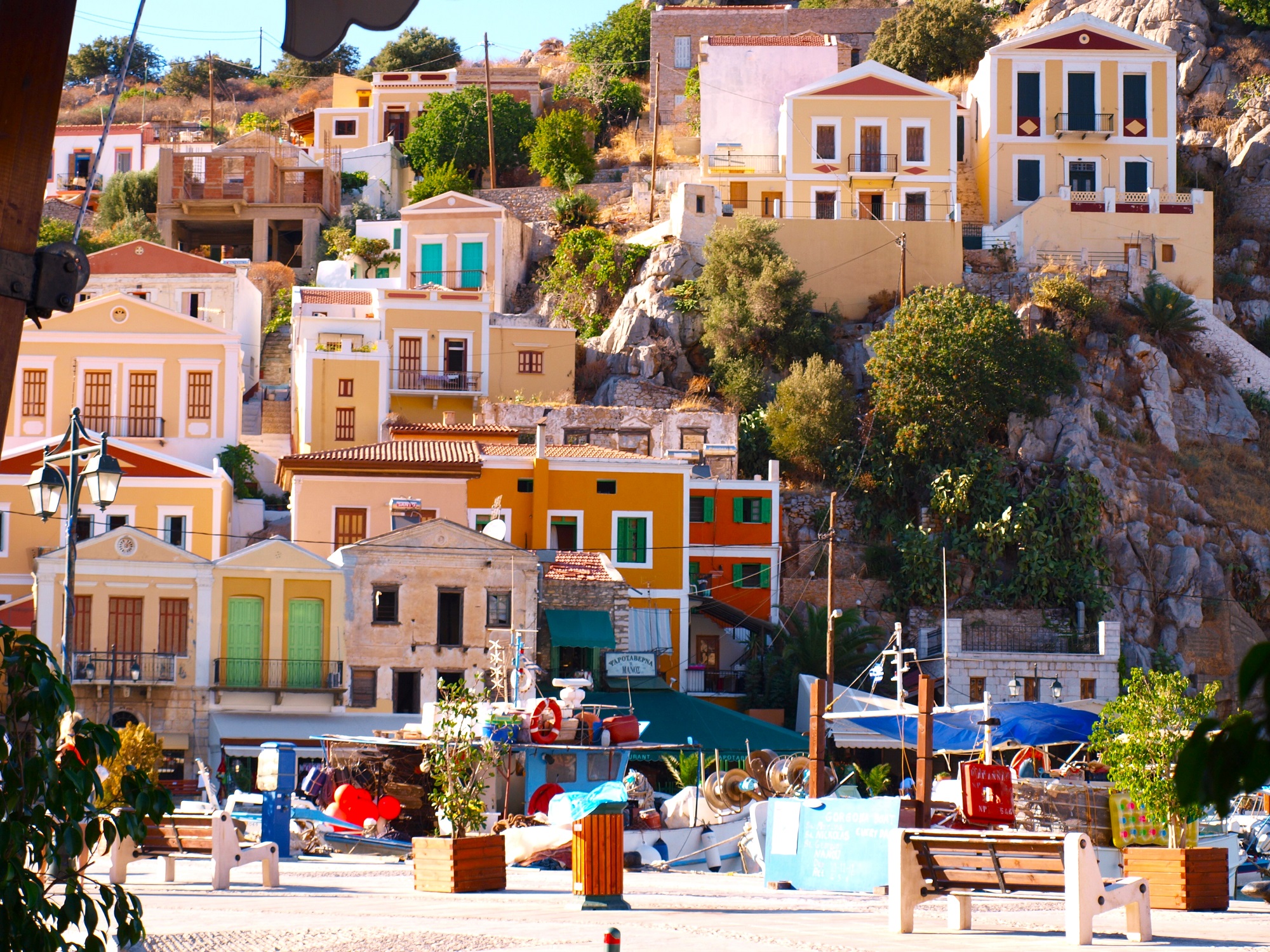 Το λιμάνι του νησιού, ο Γιαλός –όπως και η Χώρα (ή Χωριό, όπως τη λένε)– είναι κουρνιασμένο σε έναν κλειστό, απάνεμο κόλπο. Και απλώνεται σε δύο «αγκαλιές», με τα μπλε, ροζ και πράσινα νεοκλασικά να βρίσκονται το ένα δίπλα στο άλλο, χτισμένα σε αμφιθεατρική διάταξη. Όλα είναι κεραμόσκεπα, με αετώματα μα και με φινιστρίνια (ναυτικός λαός γαρ οι Συμιώτες), δημιουργώντας ένα μοναδικό παιχνίδι χρωμάτων.
