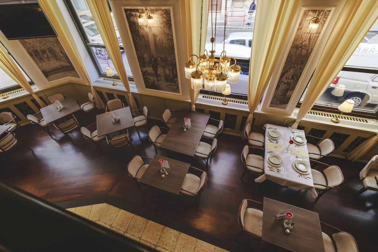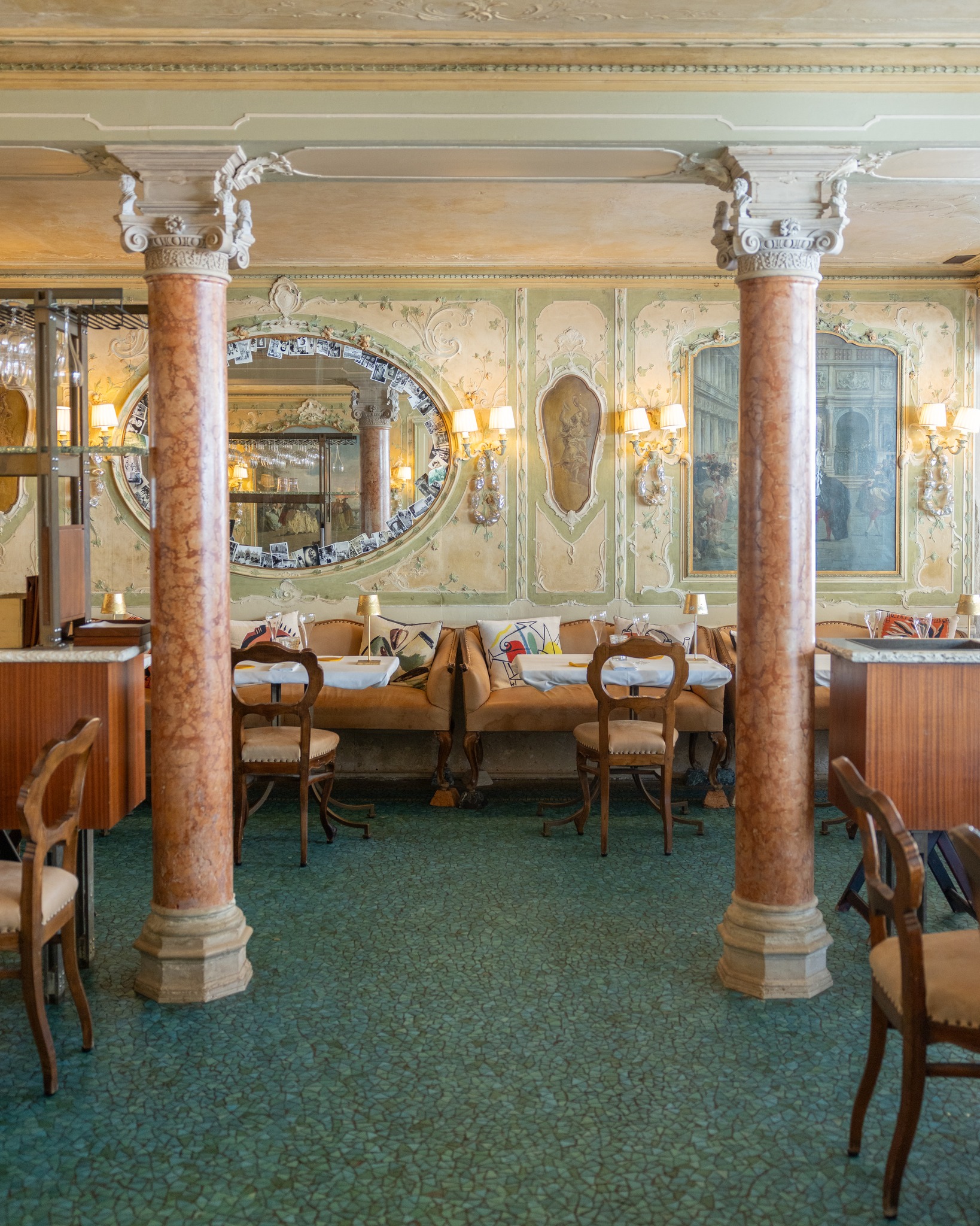 Στο Café έχουν διατηρηθεί άψογα αντικείμενα όπως τεράστιοι καθρέφτες με σκαλιστά κουφώματα, οβάλ τραπέζια και καναπέδες. Αξίζει να σημειωθεί πως αυτά τα έπιπλα κατασκευάστηκαν από τον διάσημο κατασκευαστή Michael Tonet (1796 – 1871) στη Βιέννη της Αυστρίας.