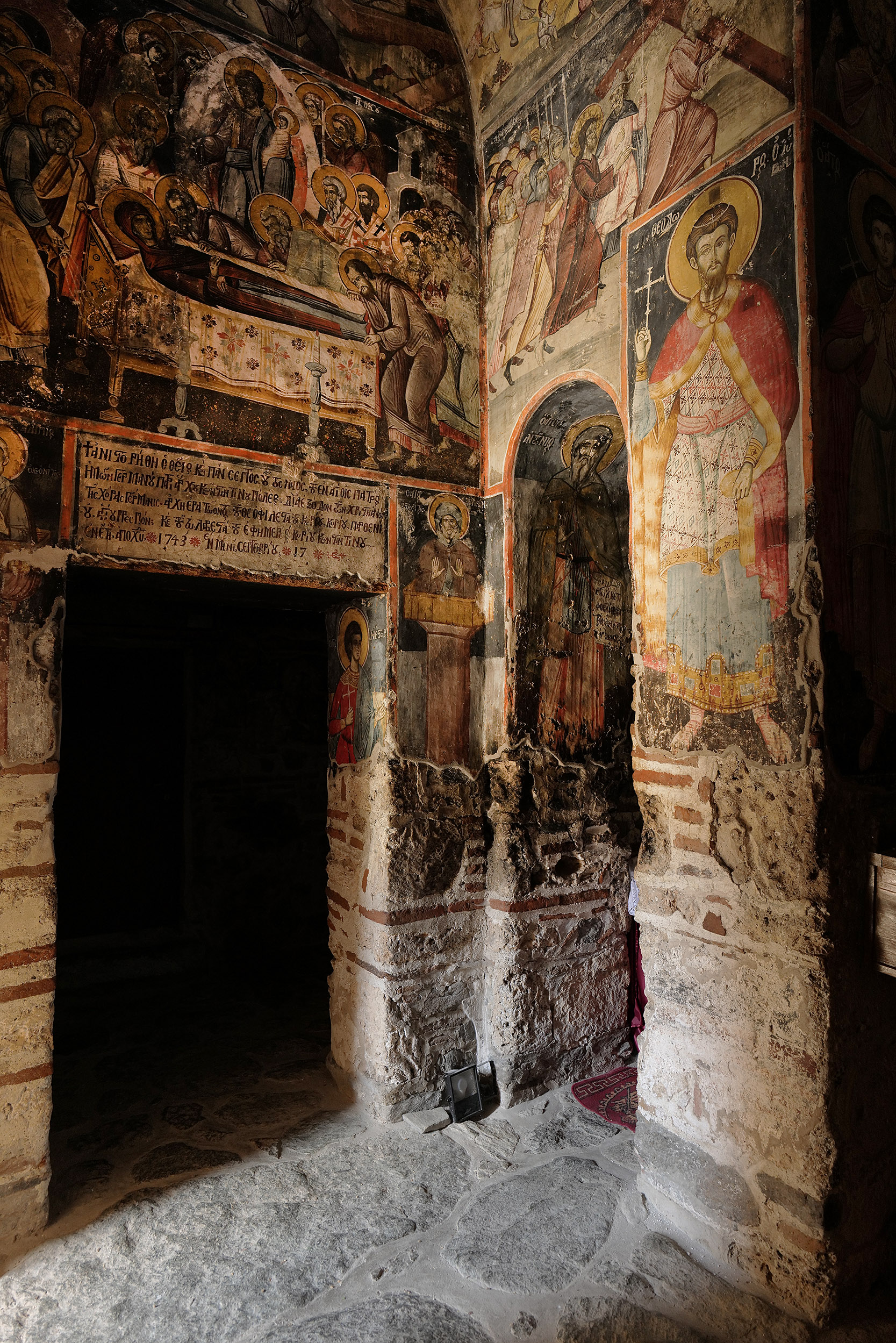 Το πρώτο ασκηταριό που θα δείτε βρίσκεται σε μια μικρή ακτή, στην εσοχή ενός κάθετου βράχου. Είναι το πέτρινο εκκλησάκι της Μεταμόρφωσης του Σωτήρα που θεωρείται του 13ου αι. Κοντά του διατηρούνται ίχνη κελιών από την ίδια εποχή. Η Μικρή Ανάληψη είναι το δεύτερο ασκηταριό, μια μονόχωρη εκκλησία κτισμένη σε εσοχή του βράχου. Στο ιερό ζωγραφίστηκαν παραστάσεις της Παναγίας Βλαχερνίτισσας, του Μελισμού με τους ιεράρχες, και της Πεντηκοστής. Στην καμάρα του ιερού είχε ζωγραφιστεί η Ανάληψη του Χριστού, πιθανόν από τα τέλη του 14ου αιώνα.