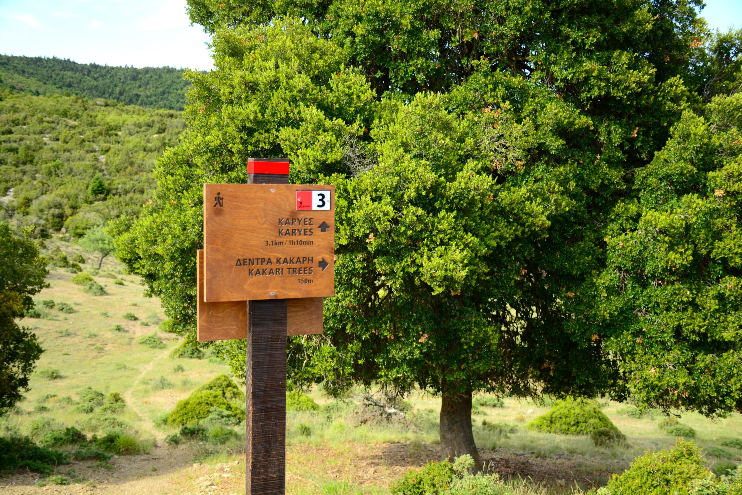 Το επόμενο σκέλος αυτής της διαδρομής διασχίζει ένα εκτεταμένο οροπέδιο με παλιά κτήματα, που τώρα είναι βοσκότοποι. Μετά από περίπου 2,8 χιλιόμετρα έχετε φτάσει στη βρύση Κρίτσοβα, σε μια πανέμορφη περιοχή με πολλά έλατα. Εδώ γεμίζετε το παγούρι σας με δροσερό νερό, και συνεχίζετε στο χωματόδρομο προς τα ανατολικά. Ο δρόμος προχωράει δίπλα σε ένα μακρόστενο χωράφι μήκους ενός χιλιομέτρου που τη λένε Μακριά Λάκκα, και σταματάει στο τέλος του χωραφιού. Από εδώ συνεχίζετε σε ένα μονοπάτι που προχωράει δίπλα σε μια στενή λωρίδα παλιών χωραφιών, και μετά από 800 μέτρα θα δείτε στα δεξιά σας το λιβάδι με μια σειρά από τεράστιες γέρικες βελανιδιές, τα ονομαζόμενα Δέντρα του Κάκαρη. Αξίζει να κάνετε μια στάση ξεκούρασης στη σκιά αυτών των αιωνόβιων βελανιδιών και να απολαύσετε τη γαλήνη του πανέμορφου τοπίου. Το τελευταίο σκέλος της Διαδρομής 3 ανηφορίζει στη βορειοδυτική πλαγιά του λόφου του Αη Λιά, και κατηφορίζει στη νότια πλαγιά του με μεγάλη κλίση και εξαιρετική θέα προς τις Καρυές, μέχρι να συναντήσει τον κεντρικό ασφαλτοστρωμένο δρόμο περίπου 600 μέτρα βόρεια από τις Καρυές.