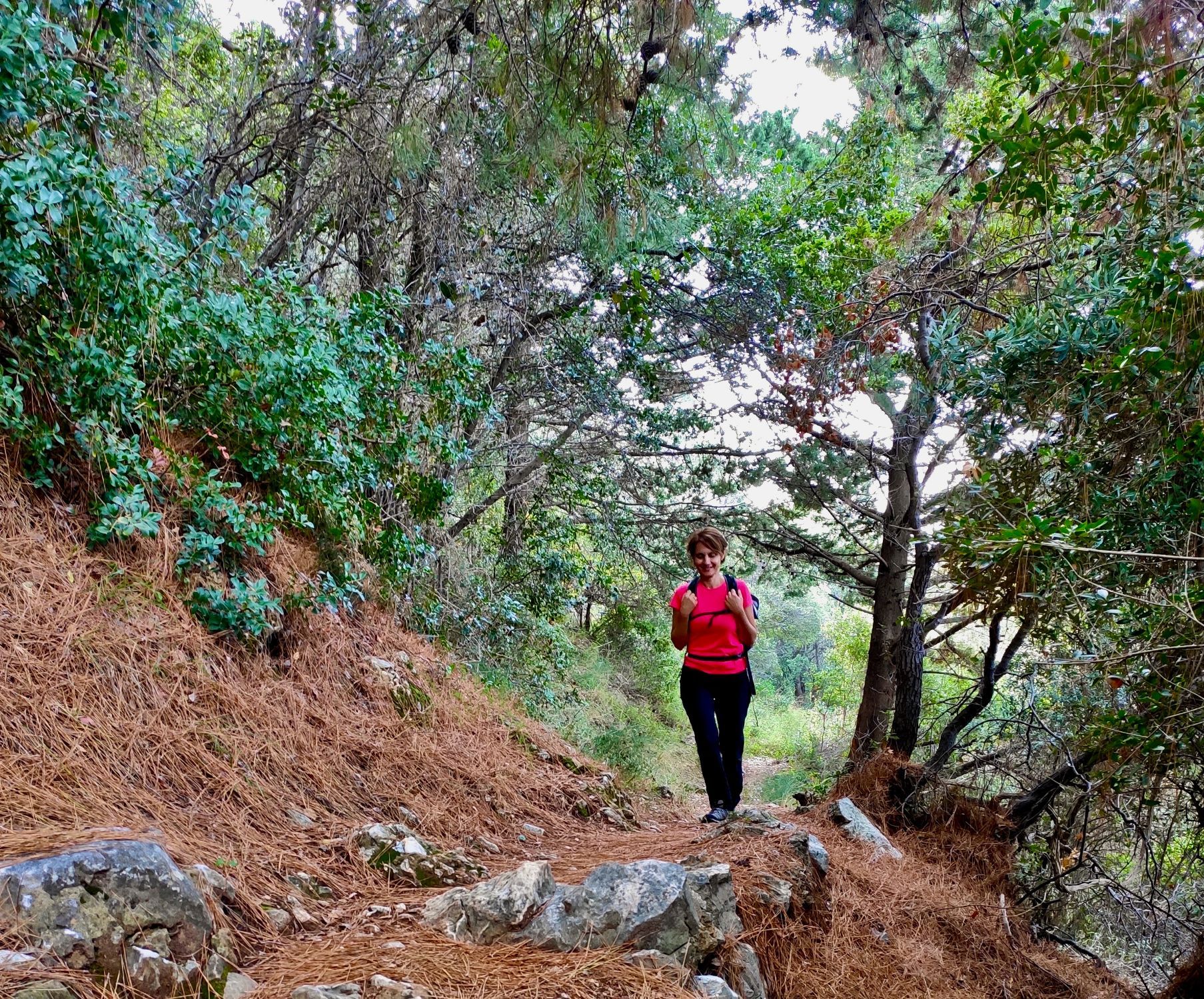 Ανηφορίζετε τώρα στο χωματόδρομο, μέσα στην πυκνή βλάστηση, με το ρέμα στα αριστερά σας. Τα νερά αυτού του ρέματος έδιναν παλαιότερα κίνηση σε δύο ακόμα νερόμυλους που υπήρχαν εδώ, σήμερα σε ερειπωμένη κατάσταση. Ο χωματόδρομος σε κάποιο σημείο διασχίζει τη ρεματιά, περνάει στην απέναντι πλαγιά, και ανηφορίζει ομαλά μέσα στην οργιώδη βλάστηση. Όταν φτάσετε στο τέλος του χωματόδρομου, θα δείτε την αρχή του μονοπατιού που ξεκινάει αριστερά σας, δίπλα από ένα παλιό ελαιόδεντρο. Ανηφορίζετε με νότια κατεύθυνση και φτάνετε σ’ έναν ελαιώνα με ωραίες πέτρινες πεζούλες. Περνάτε από την άκρη του ελαιώνα ακολουθώντας τη σήμανση, βγαίνετε σε έναν χωματόδρομο τον οποίο ακολουθείτε για λίγα μέτρα προς τα δεξιά μέχρι να βγείτε στον κεντρικό χωματόδρομο, τον οποίο επίσης ακολουθείτε προς τα δεξιά (δυτικά), μέσα στο πανέμορφο δάσος με τα θεόρατα πεύκα και κυπαρίσσια.