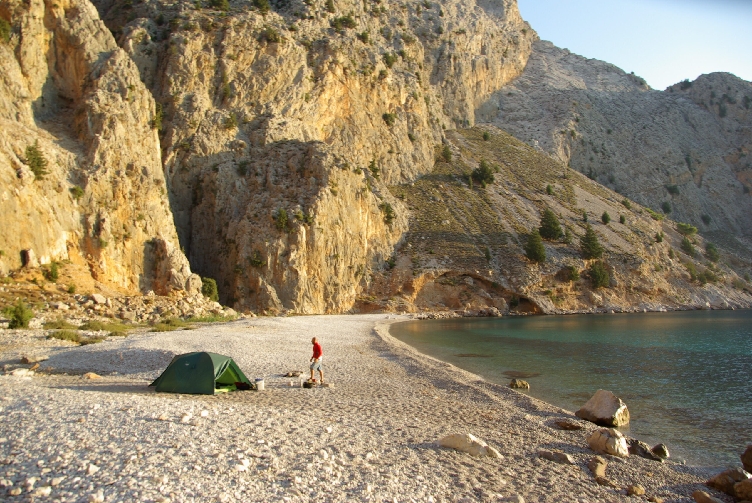 Στο σημείο αυτό η παραλία πρέπει να φαίνεται στα αριστερά σας. Εσείς ακολουθείτε τους κούκους και τα κόκκινα και μπλε σημάδια, ώσπου φτάνετε σε ένα σημείο όπου βλέπετε στα δεξιά σας τη θάλασσα. Λίγο πιο κάτω, πάντα στα δεξιά σας, θα δείτε τα σκαλοπάτια που οδηγούν στο ξωκλήσι του Αγίου Βασιλείου. Συνεχίζοντας προς την ειδυλλιακή παραλία, θα πρέπει να κατηφορίσετε προσεκτικά, ακολουθώντας τα κόκκινα και γαλάζια σημάδια από βράχο σε βράχο, καθώς το μονοπάτι παίρνει πολύ απότομη κλίση.