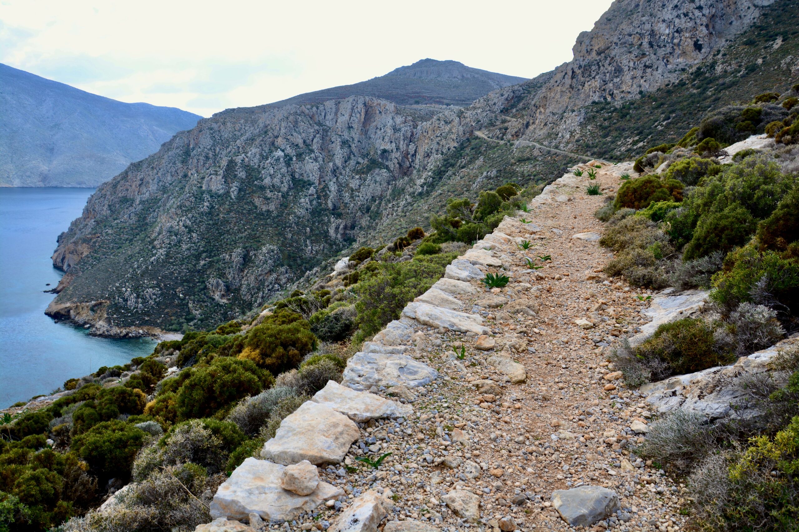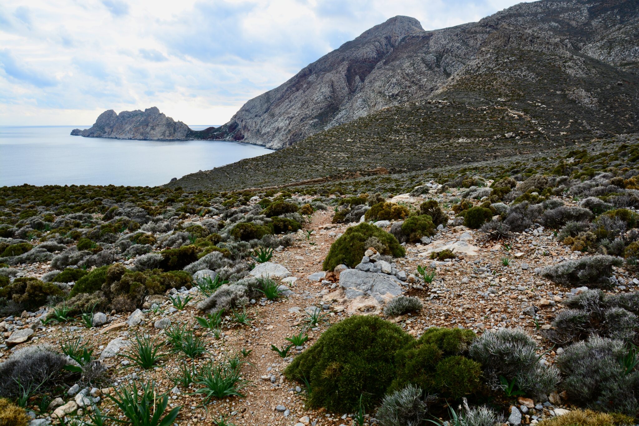 Πρόκειται για το πιο μακρύ και δύσκολο μονοπάτι του νησιού. Ξεκινά από το γνωστότερο μοναστήρι της Τήλου, όπου υπάρχει και μία παραδεισένια πηγή, και καταλήγει κοντά στην πιο δημοφιλή παραλία του, αυτήν της Ερίστου. Ξεκινάτε αριστερά, πριν από την κύρια είσοδο της Μονής Αγίου Παντελεήμονα, ακολουθώντας το μονοπάτι που πηγαίνει παράλληλα με την περίφραξη του μοναστηριού. Βαδίζετε κάτω από την απόκρημνη κορυφή του Προφήτη Ηλία, σε ευδιάκριτο μονοπάτι με σηματοδότηση. Περνάτε το διάσελο μεταξύ Προφήτη Ηλία και της κορυφής Κεφάλα. Κατόπιν κατηφορίζετε ακολουθώντας τα κόκκινα σημάδια ώσπου να βρεθείτε πάνω από τη ρεματιά που καταλήγει στην παραλία Λιμενάρι. Το μονοπάτι στο σημείο αυτό δείχνει να χάνεται, αλλά αν κρατηθείτε αριστερά, θα δείτε σε λίγο από κάτω και δεξιά σας το ξωκλήσι της Παναγιάς προς το οποίο κατευθύνεστε. Κατηφορίζετε μέσα στη ρεματιά, προσπερνάτε το εκκλησάκι, και από εδώ αρχίζει μια αρκετά επίπονη ανάβαση, σε ασαφές μονοπάτι, που σας οδηγεί στο διάσελο ανάμεσα στην κορυφή Πατέλα και την τοποθεσία Θερίδια. Μόλις φτάσετε στο ψηλότερο σημείο της διαδρομής, από όπου φαίνεται ο όρμος της Ερίστου, θα διακρίνετε κάποιους κούκους και λίγα ξεθωριασμένα κόκκινα σημάδια, που θα σας οδηγήσουν σε μια στάνη, πάνω από την παραλία του Αγίου Πέτρου. Από εκεί μπορείτε να κατεβείτε στην παραλία ή να συνεχίσετε ως την Έριστο, ακολουθώντας το χωματόδρομο.