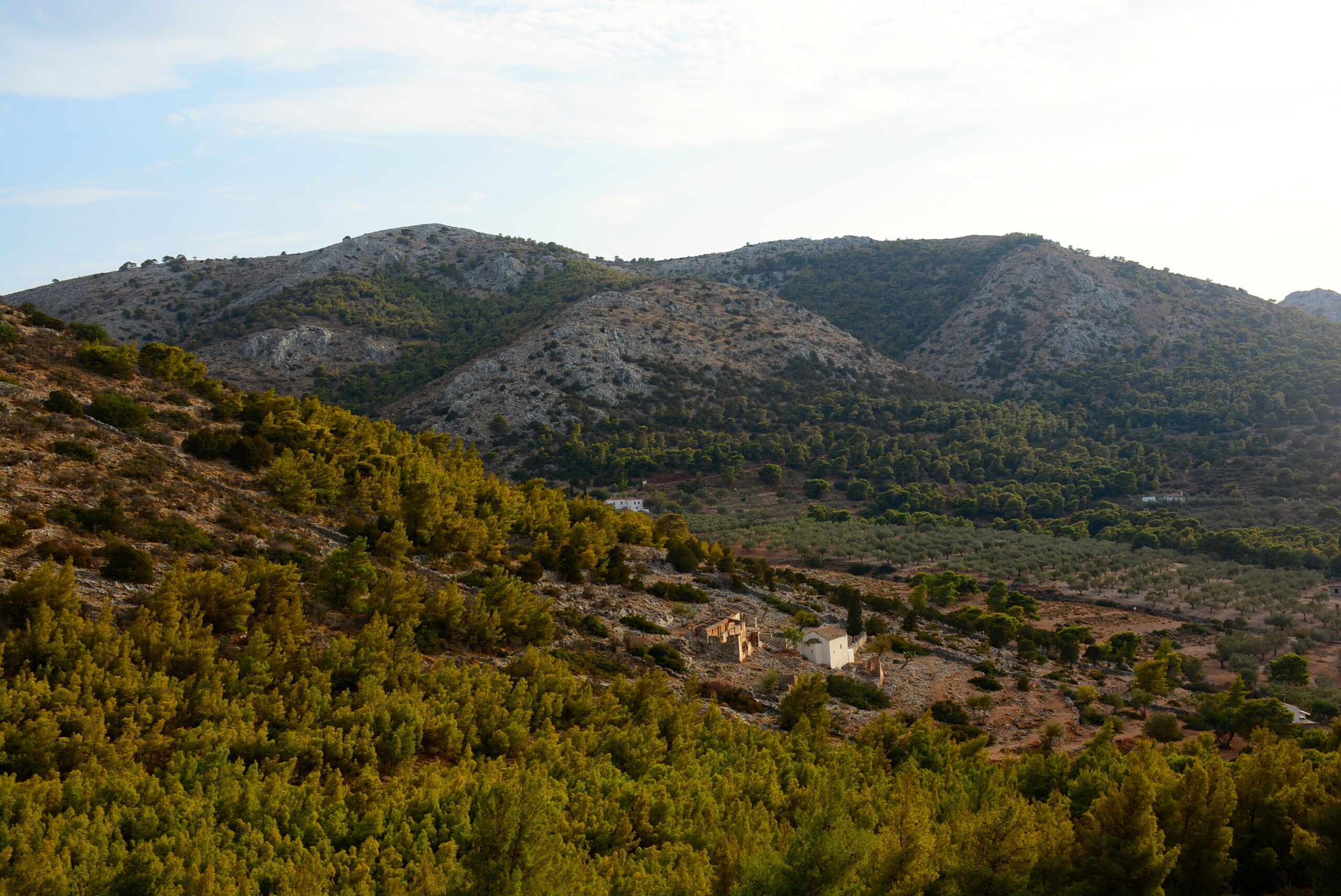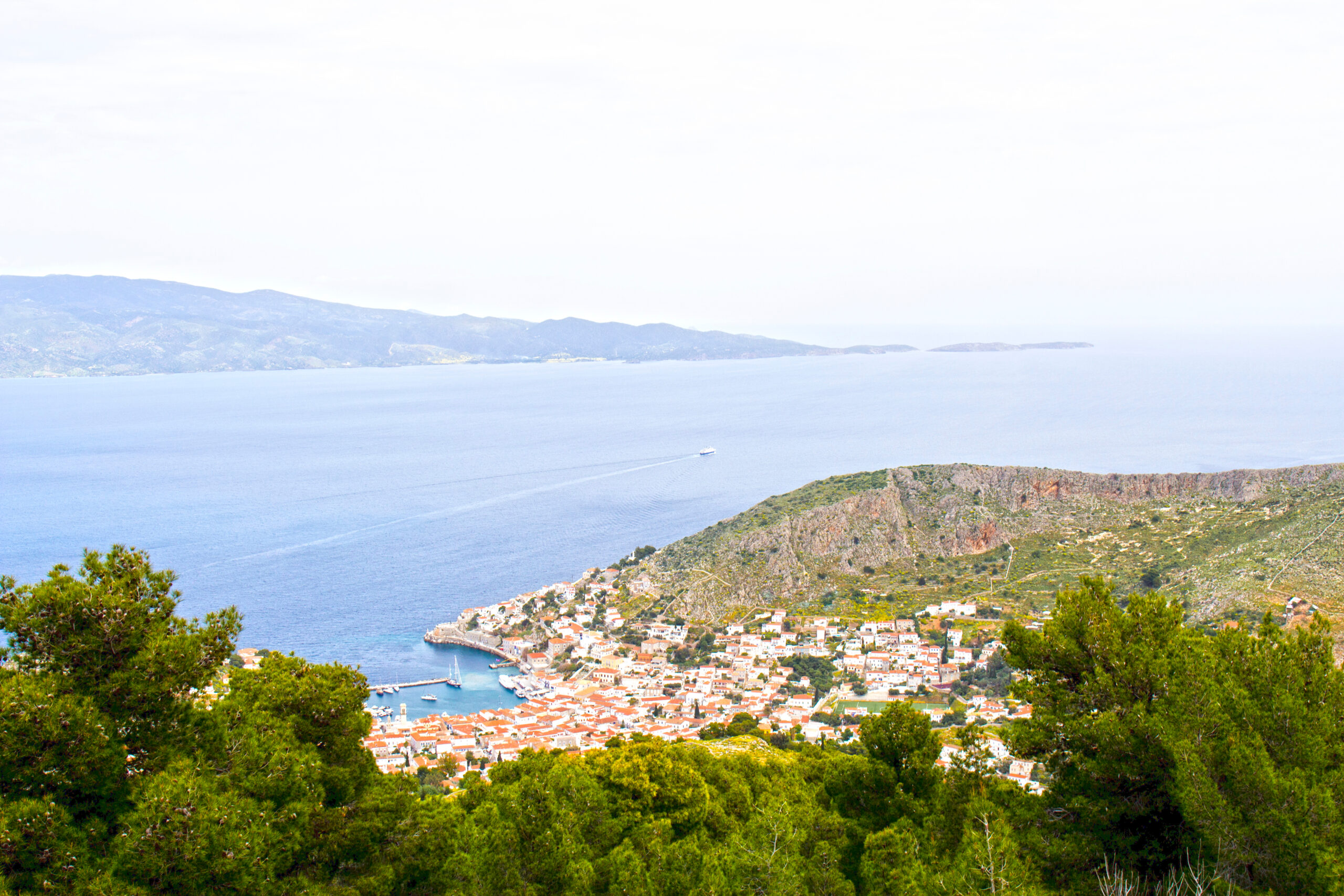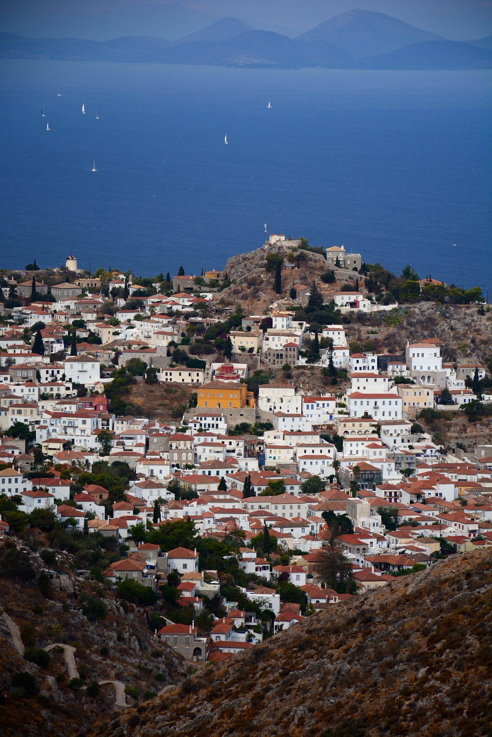 Μην σας ξεγελάει το μικρό της μήκος, αυτή η πεζοπορία είναι αρκετά δύσκολη γιατί έχει μεγάλη υψομετρική διαφορά. Όμως η μαγευτική θέα από την κορυφή Έρως (588 μ.) προς το πέλαγος στα νότια θα σας αποζημιώσει. Ξεκινήστε από το λιμάνι, από το μνημείο του Παύλου Κουντουριώτη, και ακολουθήστε προς τα νότια την οδό Μιαούλη που διασχίζει τον οικισμό. Μετά από 650 μέτρα φτάνετε σε μια διχάλα όπου ακολουθείτε το δεξιό καλντερίμι και μετά από 100 μέτρα έχετε φτάσει στη μικρή πλατεία με τα Καλά Πηγάδια (δύο εντυπωσιακά πετρόχτιστα πηγάδια απ’ όπου υδρευόταν όλη αυτή η γειτονιά που τη λένε Κιάφα). Συνεχίζοντας στο κεντρικό καλντερίμι, μετά από περίπου 250 μ. φτάνετε στο ναό του Αγίου Κωνσταντίνου του Υδραίου (νεομάρτυρας της ορθόδοξης εκκλησίας, 1770-1800), και από εκεί συνεχίζετε νότια στο στενό τσιμεντόδρομο. Περίπου 200 μ. μετά το ναό, στη διχάλα που θα συναντήσετε, ακολουθείτε το δεξιό σκέλος, μέσα στο άλσος με τα πεύκα. Στο τέλος του δρόμου, συνεχίζετε αριστερά. Μετά από περίπου 1.500 μέτρα ανηφορικής πορείας έχετε φτάσει στο ιστορικό μοναστήρι του Προφήτη Ηλία (ιδρύθηκε το 1813) χτισμένο στην κορυφή ενός λόφου με τα κτήματά του απλωμένα στις πλαγιές του λόφου τριγύρω. Εδώ αξίζει να κάνετε μια στάση ξεκούρασης για να απολαύσετε την εξαιρετική θέα προς τη Χώρα, και εν συνεχεία να ανηφορίσετε στο τελευταίο σκέλος αυτής της διαδρομής, από τη Μονή Προφήτη Ηλία μέχρι την κορυφή Έρως, μήκους 1.000 μ.