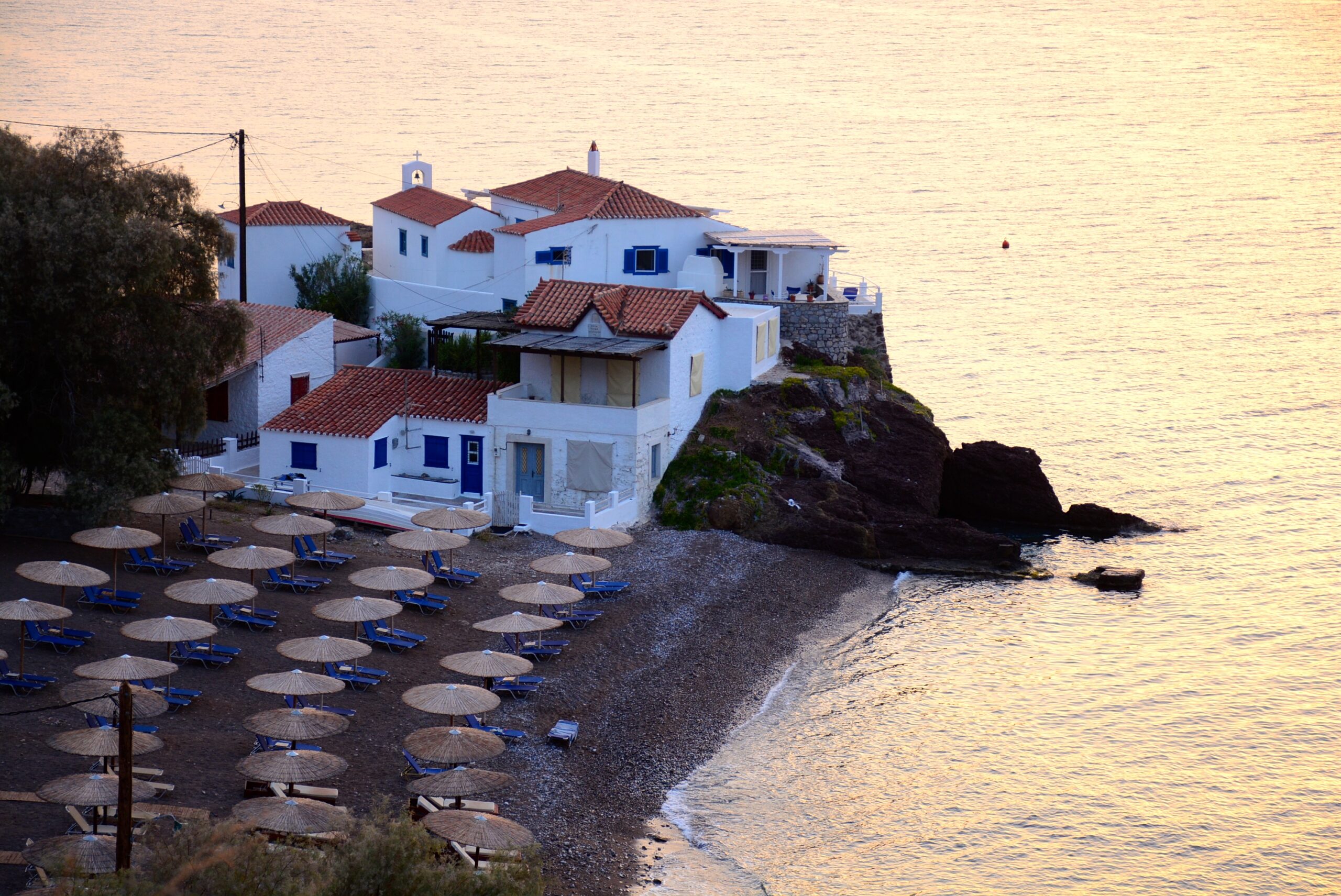 Μόλις φτάσετε στα Καμίνια θα δείτε τη μικρή παραλία που είναι γεμάτη κόσμο και πολλές ξύλινες βάρκες, θα δείτε επίσης το Κόκκινο Σπίτι που κάποτε ήταν το αρχοντικό της οικογένειας Μιαούλη. Συνεχίζετε στα πέτρινα σκαλιά που ανεβαίνουν πίσω από το Κόκκινο Σπίτι και περπατάτε στον παραλιακό δρόμο προς τα δυτικά. Σε 15 λεπτά έχετε φτάσει στον οικισμό Βλυχός, όπου υπάρχει μια πιο μεγάλη παραλία με ωραίες ψάθινες ομπρέλες. Πίσω από την παραλία, το μονοπάτι περνάει πάνω από μια παλιά πέτρινη τοξωτή γέφυρα. Ακριβώς ανατολικά από τη γέφυρα, στην πλαγιά του λόφου, θα δείτε το ξωκλήσι των Ταξιαρχών που προσφέρει πολύ ωραία θέα στη θάλασσα. Το μονοπάτι που βλέπετε να ανηφορίζει μέσα στη ρεματιά στα ανατολικά, είναι μια πολύ ωραία εναλλακτική διαδρομή για να έρθετε ως εδώ από τη Χώρα, ή να επιστρέψετε στη Χώρα από εδώ.