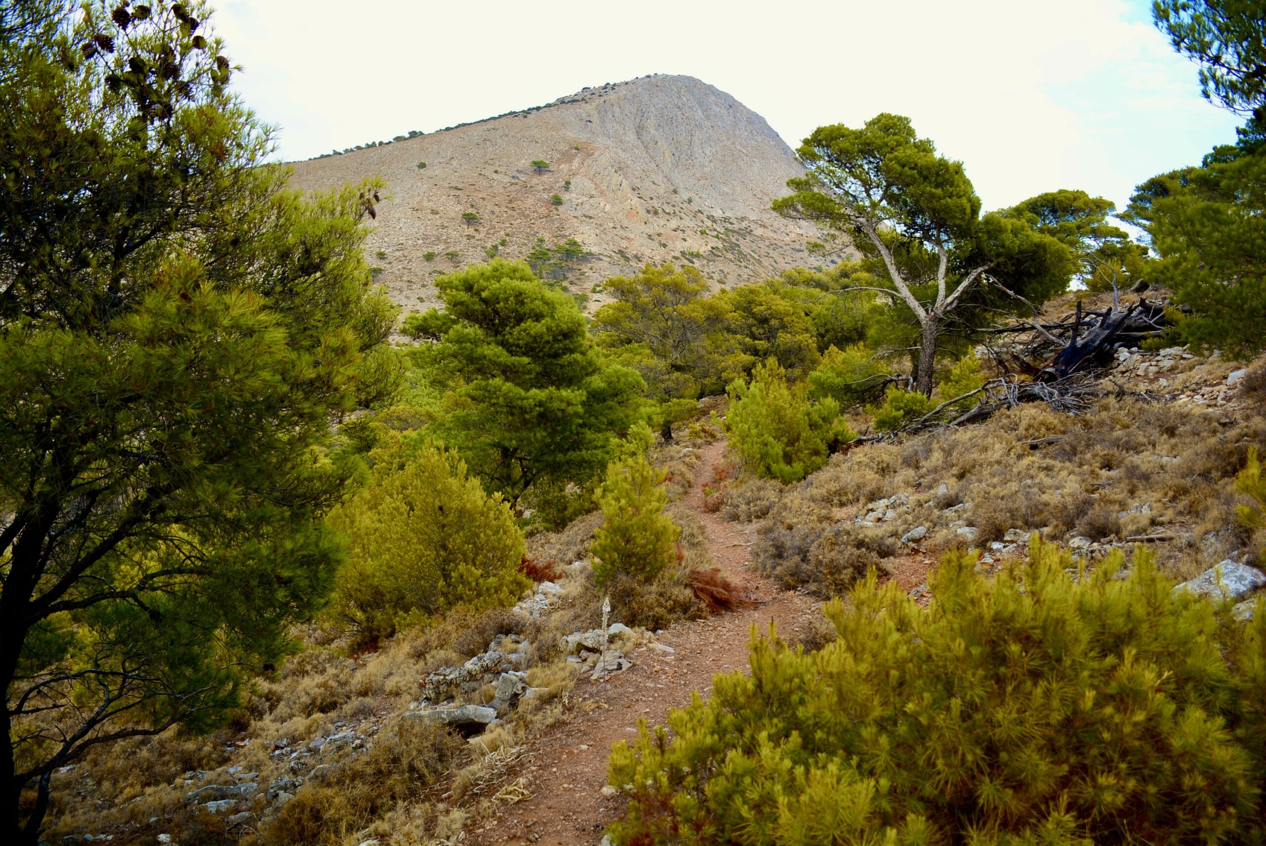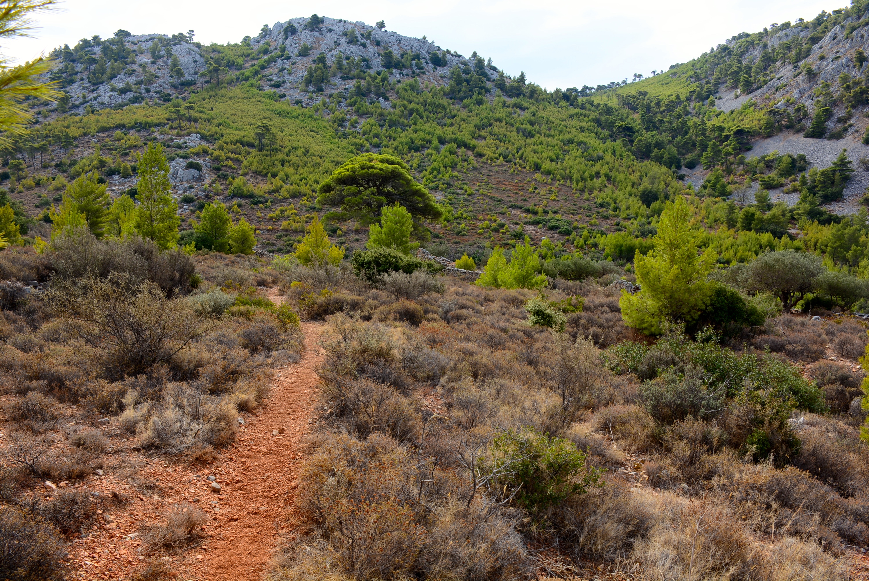 Από αυτό το σημείο συνεχίζετε νότια ανηφορίζοντας στη βουνοπλαγιά. Το παλιό μονοπάτι χάνεται συχνά κάτω από τα αγριόχορτα ή μπερδεύεται με γιδόστρατα, αλλά δεν θα χαθείτε γιατί βάζετε σημάδι τα δύο πέτρινα ερείπια σπιτιών που τα βλέπετε ψηλότερα στην πλαγιά. Μετά το τελευταίο σπίτι, το μονοπάτι είναι πολύ πιο καθαρό και σαφές και ανηφορίζει «καρφί» προς την κορυφή του λόφου στα νότια. Πίσω (νότια) από αυτή την κορυφή, θα βγείτε στο κεντρικό μονοπάτι Επισκοπή – Μονή Προφήτη Ηλία, στο σημείο όπου βρίσκεται το ξωκλήσι του Αγίου Μάμα.
