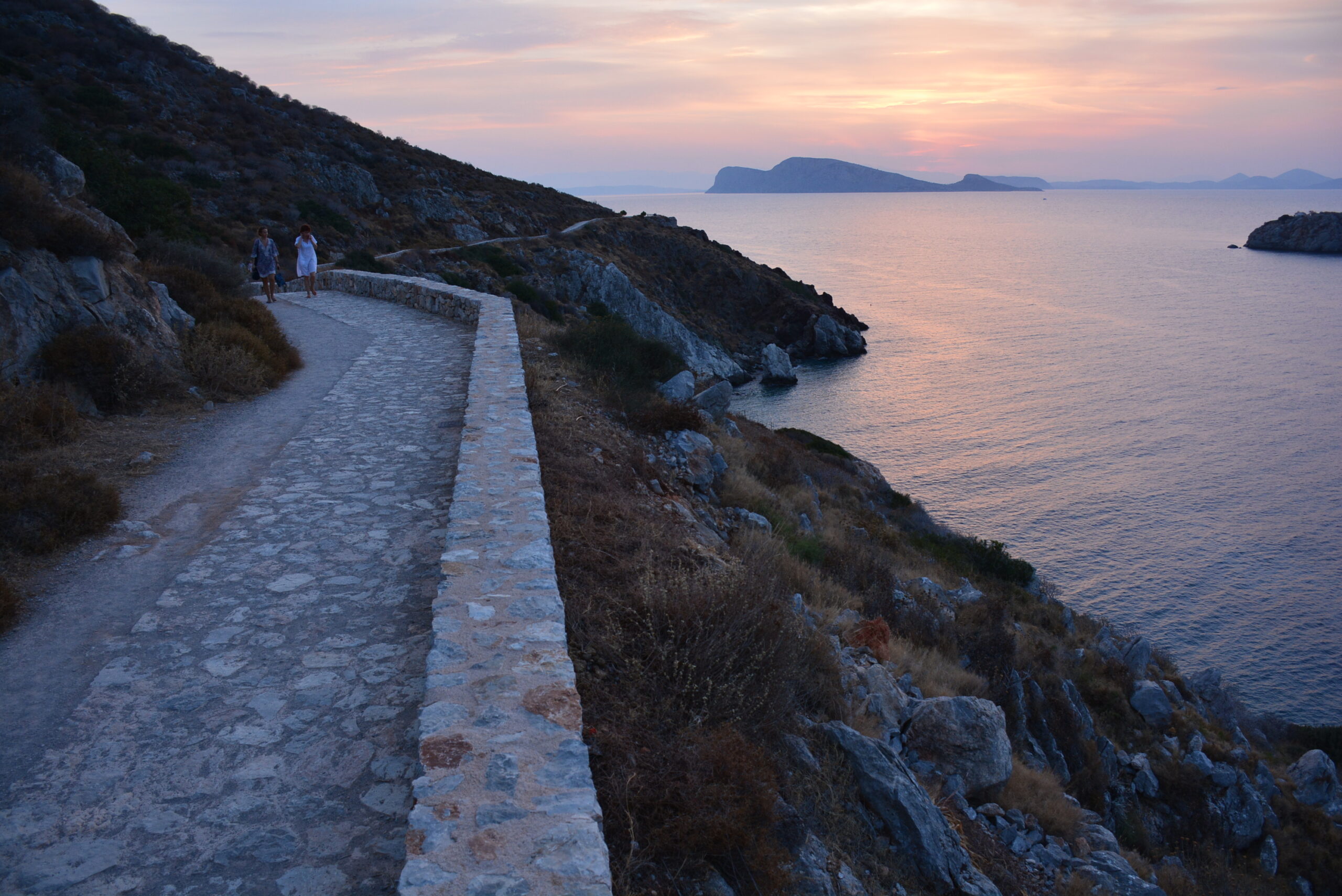 Μια δύσκολη διαδρομή για πεζοπόρους σε άριστη φυσική κατάσταση. Πηγαίνετε στη δυτική άκρη του λιμανιού της Χώρας, και από εκεί συνεχίστε στον παραλιακό πεζόδρομο προς τα βραχάκια της Υδρονέτας και της Σπηλιάς. Αυτός ο πλακοστρωμένος φαρδύς δρόμος προχωράει κατά μήκος της βραχώδους ακτογραμμής, με ωραία θέα στη θάλασσα ιδίως τις απογευματινές ώρες. Στο πρώτο σκέλος του, μέχρι τις Πλάκες Βλυχού, πολύ πιθανό να συναντήσετε πολύ κόσμο που κάνει εδώ τη βόλτα του ή έρχεται για τα μπαράκια, τα εστιατόρια και τις μικρές παραλίες της περιοχής.