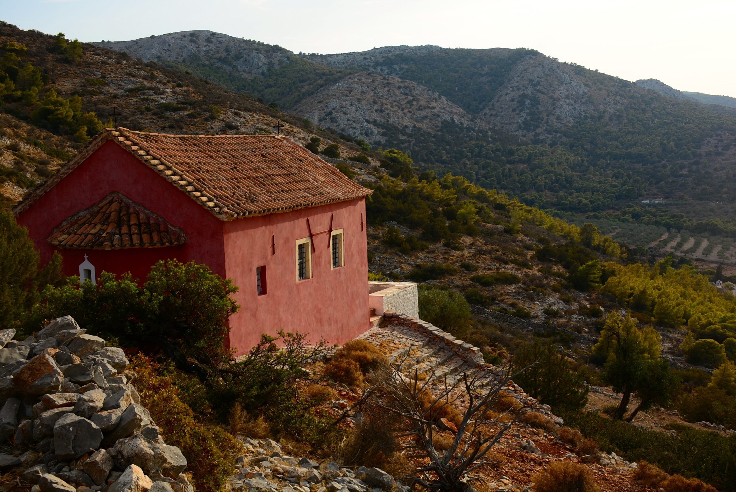 Άλλη μια δύσκολη – αλλά εξαιρετικά απολαυστική – διαδρομή στην Ύδρα, κατάλληλη για πεζοπόρους σε άριστη φυσική κατάσταση. Θα πρέπει να ξεκινήσετε νωρίς το πρωί, και να έχετε άφθονο νερό μαζί σας. Το μονοπάτι ξεκινάει από τη νότια άκρη του οικισμού Πλάκες Βλυχού, ακριβώς στο πέτρινο γεφυράκι, και φεύγει νότια, μέσα στην κοίτη του ξεροχείμαρρου (προσοχή: δεν ακολουθείτε το τσιμεντοστρωμένο δρομάκι που οδηγεί στο αρχοντικό με τα μπλε παντζούρια). Μετά από δέκα βήματα θα δείτε και την ξύλινη πινακίδα που γράφει «Προς Άγιο Μάμα, Κλιμάκι, Ταξιάρχες», μόνο στα ελληνικά. Μετά από 300 μ. το μονοπάτι διχάζεται: το αριστερό σκέλος συνεχίζει για λίγο μέσα στη ρεματιά και καταλήγει μετά από 200 μ. στο ξωκλήσι του Αγίου Ιωάννου Θεολόγου, ενώ το δεξί σκέλος, που έχει και μια πορτούλα για τα ζώα στην αρχή του και ένα κόκκινο βέλος που το σηματοδοτεί, είναι η συνέχεια της πορείας μας.