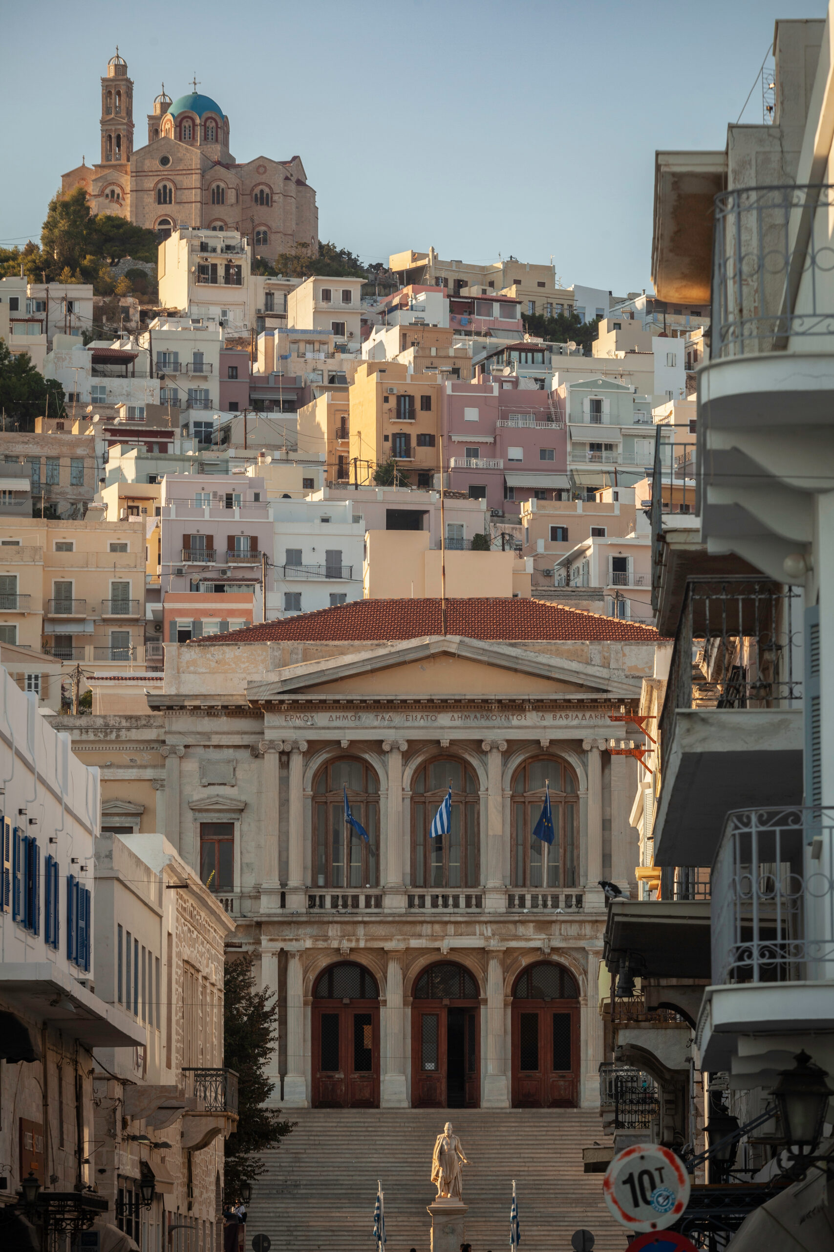 «Μακάρι να ζούσα εδώ», εύχεσαι καθώς αντικρίζεις από την Αληθινή το σύμπλεγμα των δύο οικισμών που όλο και εξαπλώνεται, σαν να γεννάει κάθε τόσο ζωή. Την ευχή σου έχουν κάνει πραγματικότητα άνθρωποι από όλο τον κόσμο και η Ερμούπολη εποικίζεται πλέον (και) με «digital nomads». Η μεγάλη προίκα της νεοκλασικής πόλης, που δεν μοιάζει με καμία στις Κυκλάδες, είναι τα μέγαρα και τα δημόσια κτίριά της.