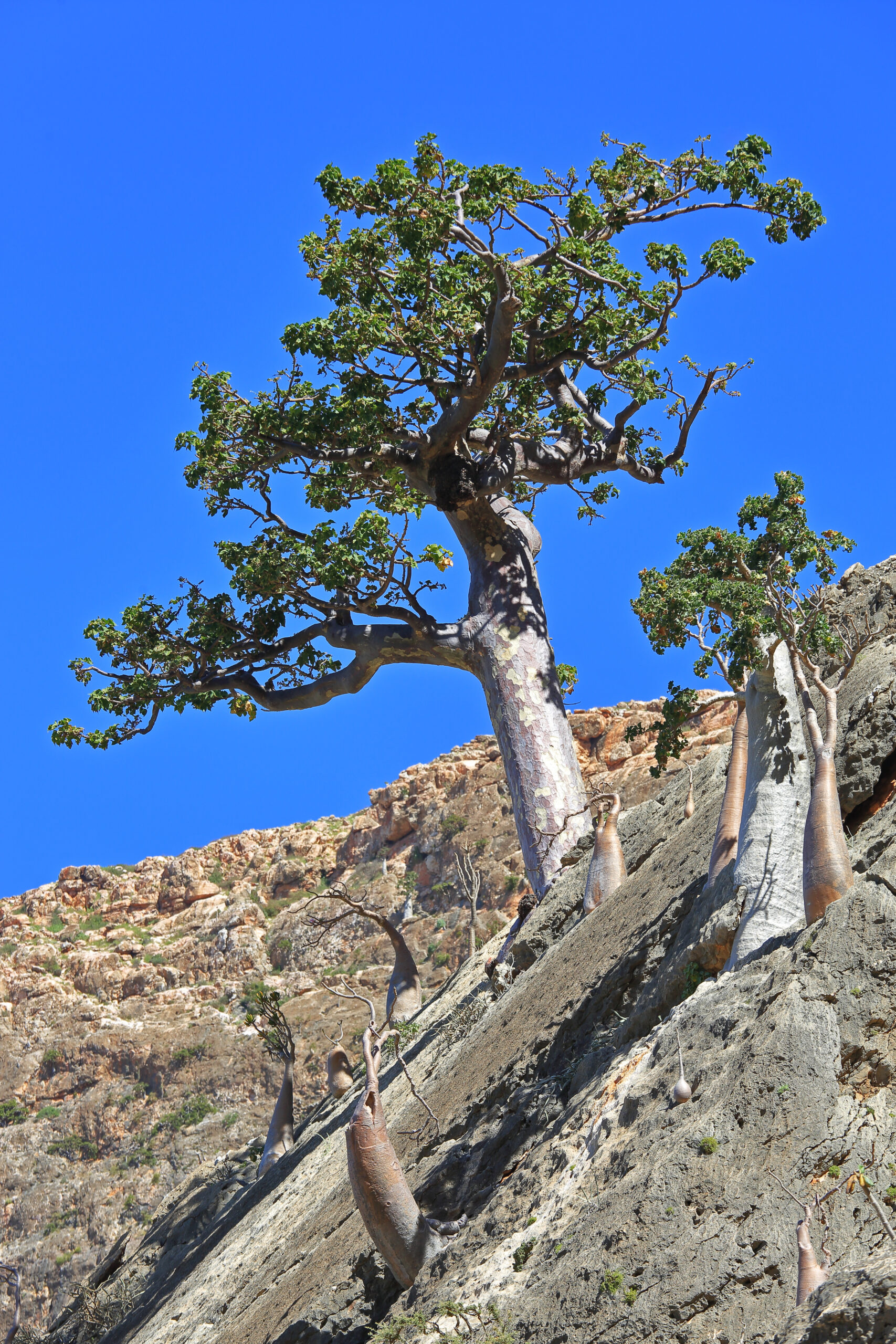 Στα ίδια ξηρά εδάφη ανθίζει και το «Ρόδο της Ερήμου» της Σοκότρα (Adenium obesum socotranum), που το λένε και «φυτό-μπουκάλι». Είναι τόσο παράξενο και όμορφο που μοιάζει εξωπραγματικό. Ο κορμός του, παχύς και γυαλιστερός σαν γλυπτό, αποθηκεύει στους ιστούς του νερό για τους άνυδρους μήνες, και την εποχή της ανθοφορίας του καλύπτεται από μεγάλα ροζ ή κοκκινωπά άνθη, που ξεχωρίζουν στις ξηρές πεδινές περιοχές και στα χαμηλά οροπέδια.