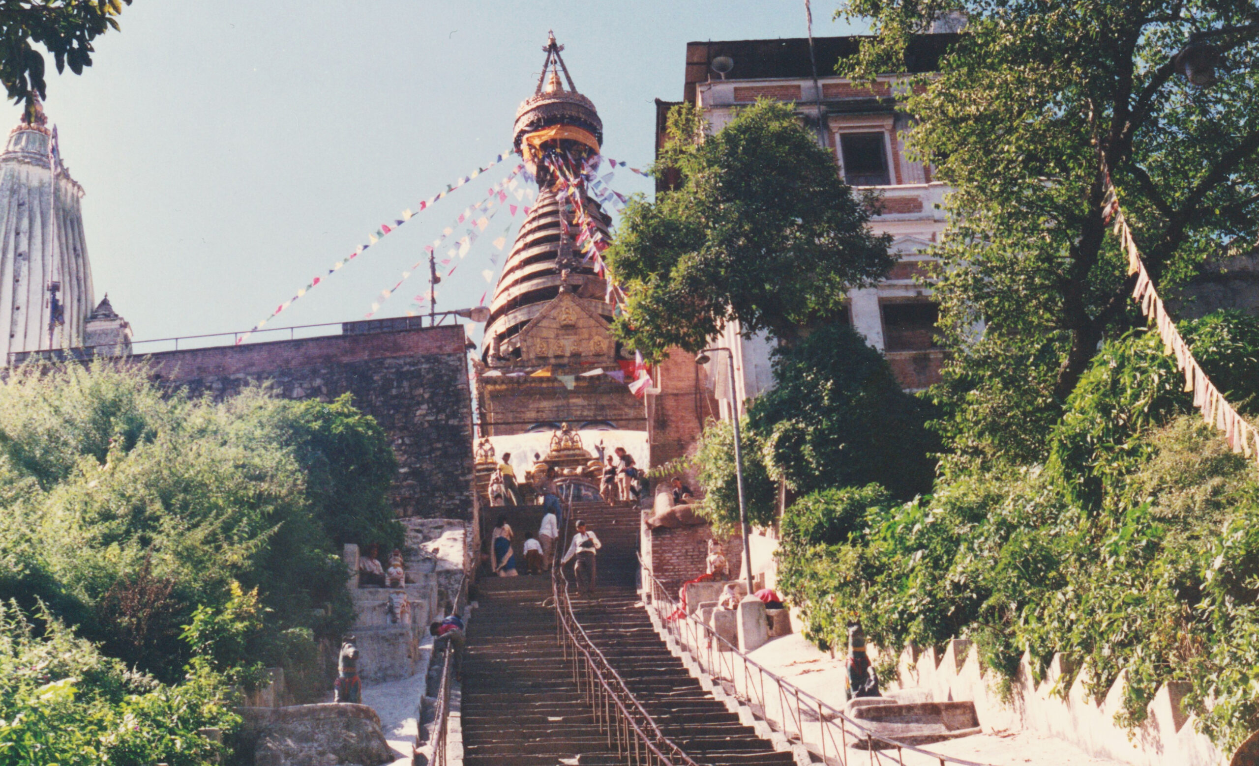 Επόμενη επίσκεψη στην ιερή βουδιστική στούπα Swayambhunath, στην κορυφή ενός λόφου, στον οποίο για να φθάσεις πρέπει να ανέβεις 330 σκαλοπάτια στα οποία σε συντροφεύουν μαϊμούδες. Καθώς φθάνουμε στην κορυφή, αντικρίζουμε ένα συγκρότημα ναών θιβετιανού βουδισμού που θεωρείται ένας από τους πιο σημαντικούς τόπους προσκυνήματος.