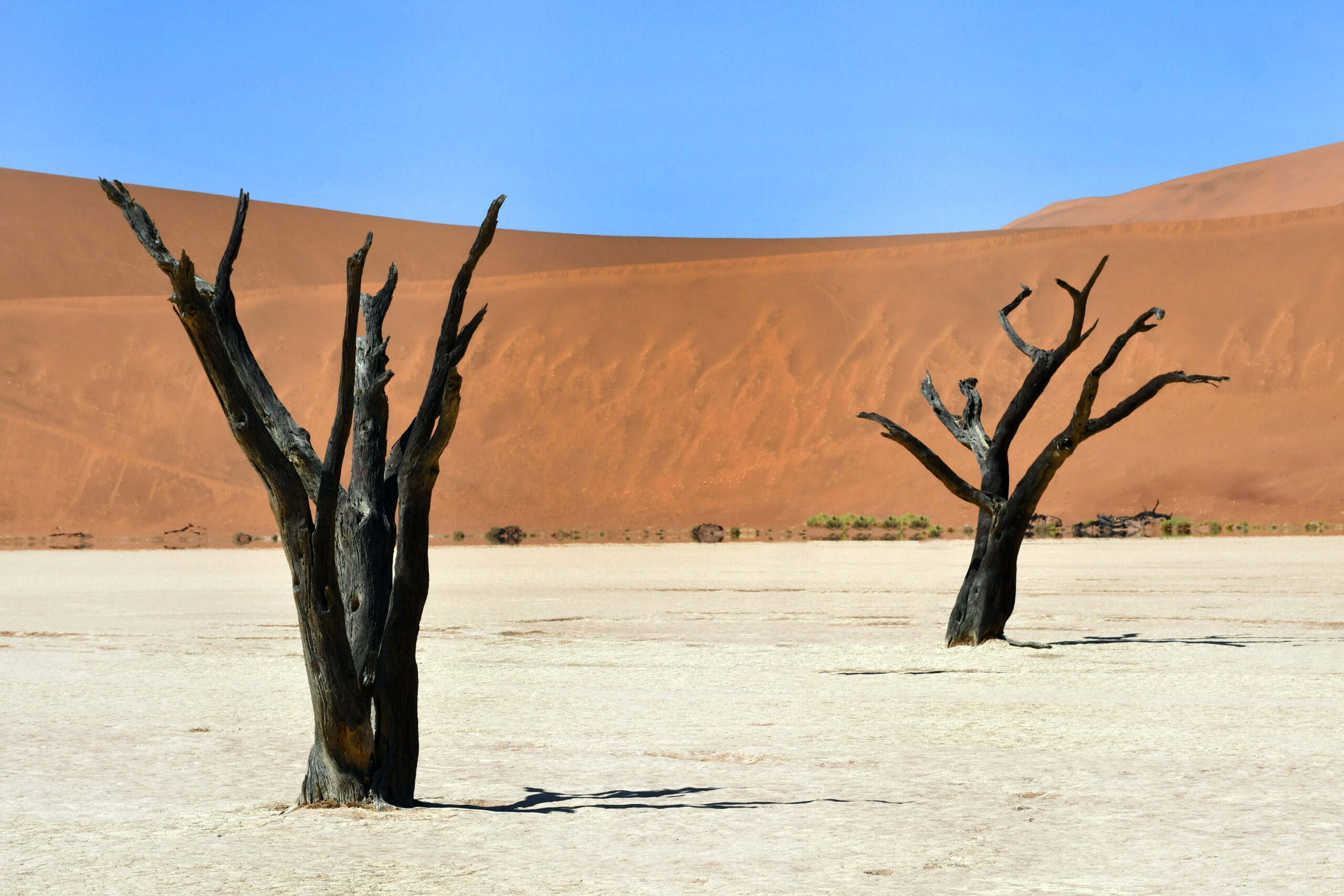 Μισή ώρα πεζοπορία στην άμμο και το αλατώδες πεδίο θα μας οδηγήσει στο Ντέντβλεϊ. Το πιο μυστηριώδες τοπίο της Ναμίμπ. Μια λευκή αργιλώδης λεκάνη με μαύρες φιγούρες-σκελετούς που μοιάζουν με γλυπτά από έβενο. Περιβάλλεται από πορτοκαλί αμμόλοφους σε μια δραματική αντίθεση που δημιούργησε η φύση. Μια σπουδή πάνω στο φως τη σκιά και την αιώνια αναμονή είναι το τοπίο της Ντέντβλεϊ. Τα «άψυχα» δέντρα κυρίως ακακίες στέκονται μοναχικές και αγέρωχες μάρτυρες μιας άλλης εποχής όταν το νερό κυλούσε ακόμη στην έρημο. Το τοπίο σχηματίστηκε πριν από 900 χρόνια, όταν ο ποταμός Tsauchab που του έδινε ζωή αποκόπηκε από τους αμμόλοφους και η περιοχή στέρεψε από νερό. Τα δέντρα νέκρωσαν, οι κορμοί τους μαύρισαν από τον καυτό ήλιο της ερήμου, αλλά η ξηρασία τα προστάτευσε και δεν διαλύθηκαν. Οι αιωνόβιοι κορμοί των ακακιών εξακολουθούν να πατούν στην ραγισμένη από την δίψα αργιλώδη επιφάνεια, ενώ τα κλαδιά τους υψώνονται στον ουρανό σαν να προσεύχονται.