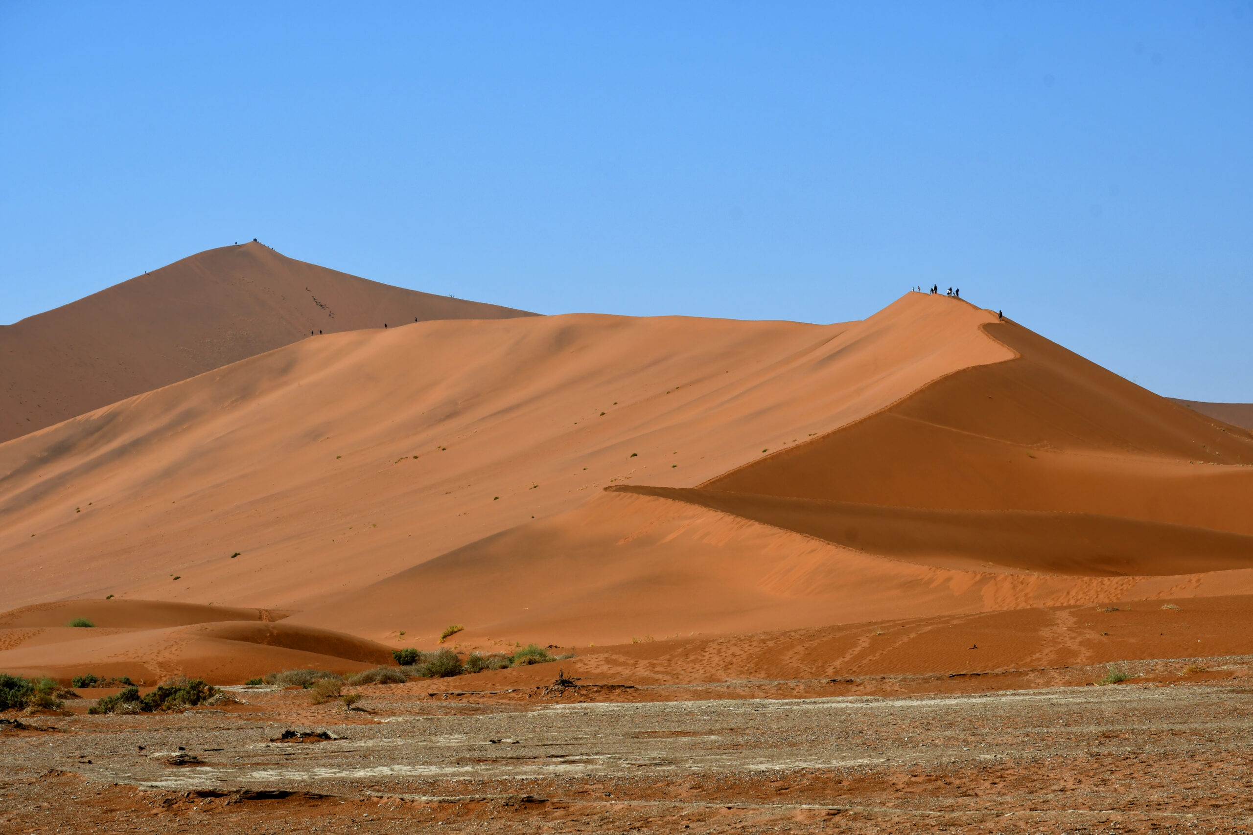 Η ανάβαση διακόπτεται από σύντομες στάσεις, καθώς δεν μπορώ να αντισταθώ στην ομορφιά του τοπίου που ξετυλίγεται γύρω μου. Φθάνοντας στην κορυφή η άπλετη θέα είναι μοναδική. Το βλέμμα μου χάνεται πέρα από τον άνεμο σε έναν ωκεανό από άμμο. Διατρέχει τις κυματιστές κορυφές των διάσπαρτων αμμόλοφων που αλλάζουν χρώμα ανάλογα με το φως και τα οξείδια σιδήρου που κρύβουν μέσα τους. Μια παλέτα αποχρώσεων της ώχρας, της φωτιάς, του πορτοκαλιού, της κανέλλας, της πάπρικας. Μοναδικές πράσινες πινελιές λίγες ακακίες και μικροί θάμνοι εξακολουθούν να ανθίστανται στην ξηρότητα του γυμνού τοπίου. Αφήνομαι στην εκκωφαντική σιωπή, στην αρχέγονη ομορφιά και στο γεμάτο δύναμη και μαγεία πρόσωπο της ναμιμπιανής ερήμου.