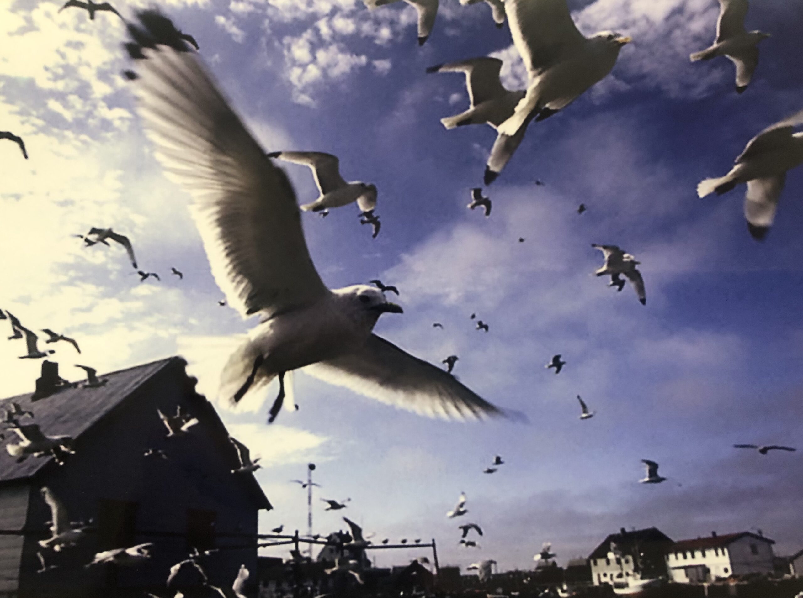 Το πρωί ο ουρανός είναι βαρύς, η θάλασσα αρκετά τρικυμιώδης και τα πουλιά πάρα πολλά. Βρισκόμαστε στο μέρος του νησιού όπου γίνεται η επεξεργασία των ψαριών και δεν χρειάζεται να περπατήσουμε πολύ για να βρεθούμε στην καρδιά της δραστηριότητας. Στη διαδρομή βλέπουμε αποθήκες, ξύλινα σπίτια ψαράδων, καινούργια κτίσματα, και σκάφη. Τριγύρω πετούν θαλασσοπούλια πάφιν, οι παπαγάλοι της θάλασσας με τις πολύχρωμες μύτες, πάπιες και αναρίθμητοι γλάροι. Είναι τόσοι πολλοί που καλύπτουν τις στέγες των σπιτιών και των κτιρίων, κυρίως του εργοστασίου αλιείας. Νομίζω ότι έχω μπει σε ένα βιβλίο του Ιούλιου Βερν και πως ξύπνησα κι εγώ σαν τον καθηγητή Pierre Aronnax, στις «20000 λεύγες κάτω από την θάλασσα», στα θρυλικά νησιά Lofoten.
