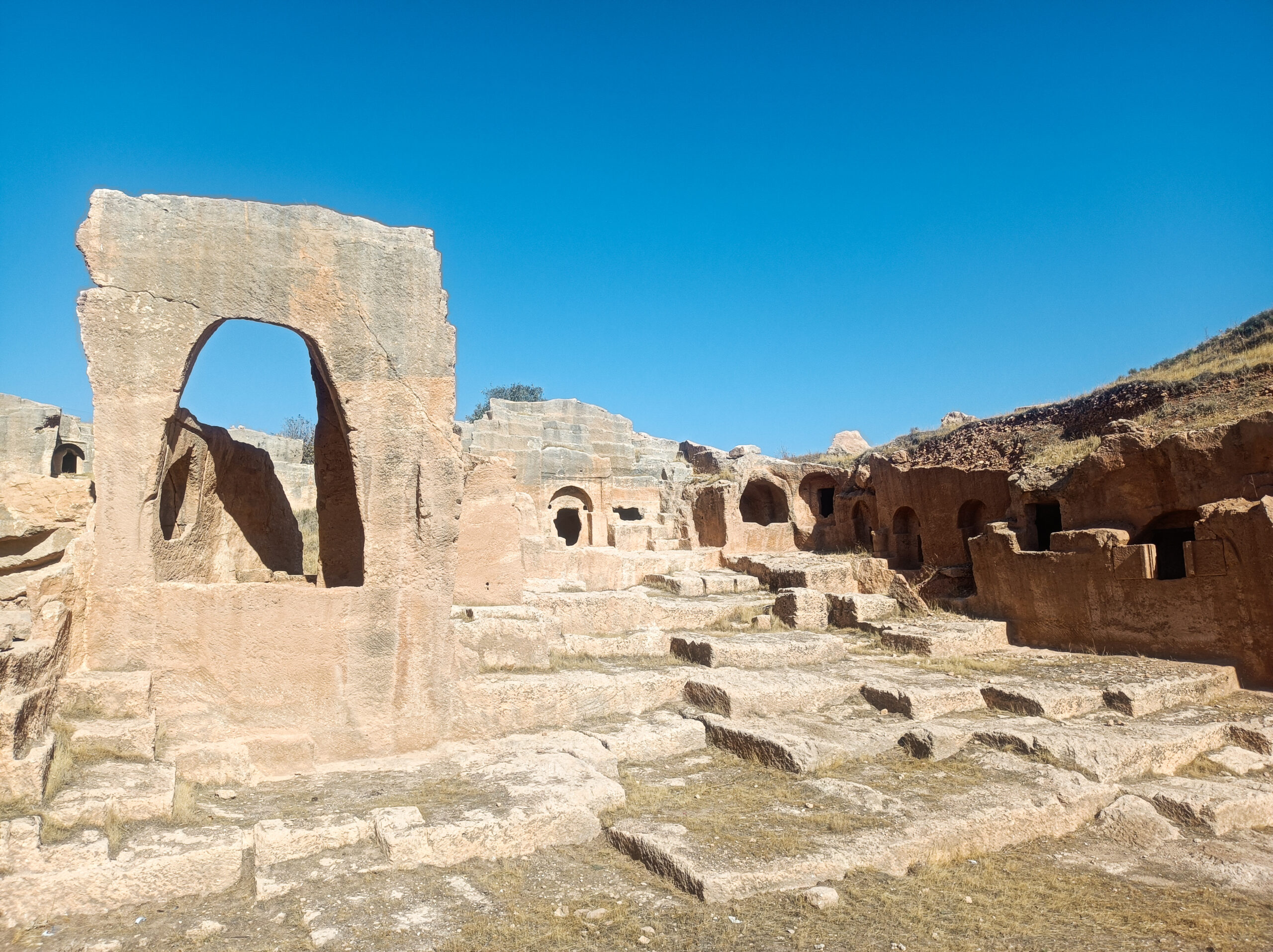 Σε μισή ώρα φτάνουμε στη σημαντική βυζαντινή πόλη-οχυρό της Δάρα που οριοθετούσε τα σύνορα με την Περσική Αυτοκρατορία των Σασσανιδών. Με τη βοήθεια ενός ντόπιου Κούρδου ξεναγού περπατάμε σ’ ένα ξεροπόταμο, που κάποτε ήταν ο κεντρικός οδικός άξονας της πρωτοβυζαντινής καστροπολιτείας θαυμάζοντας τη Νεκρόπολη με τους σκαλιστούς, στους κάθετους βράχους, τάφους αλλά και τις κινστέρνες (υπόγειες δεξαμενές νερού).