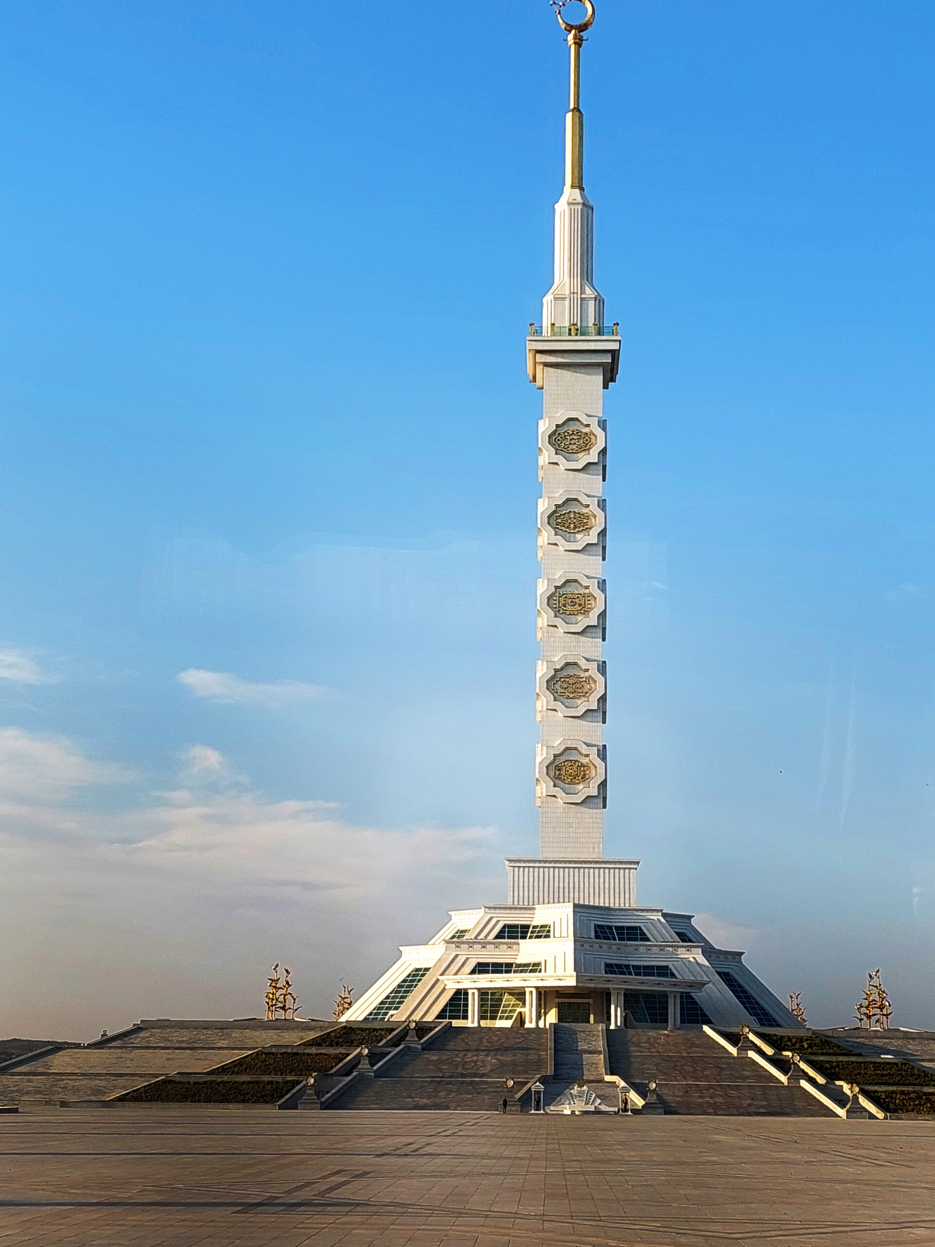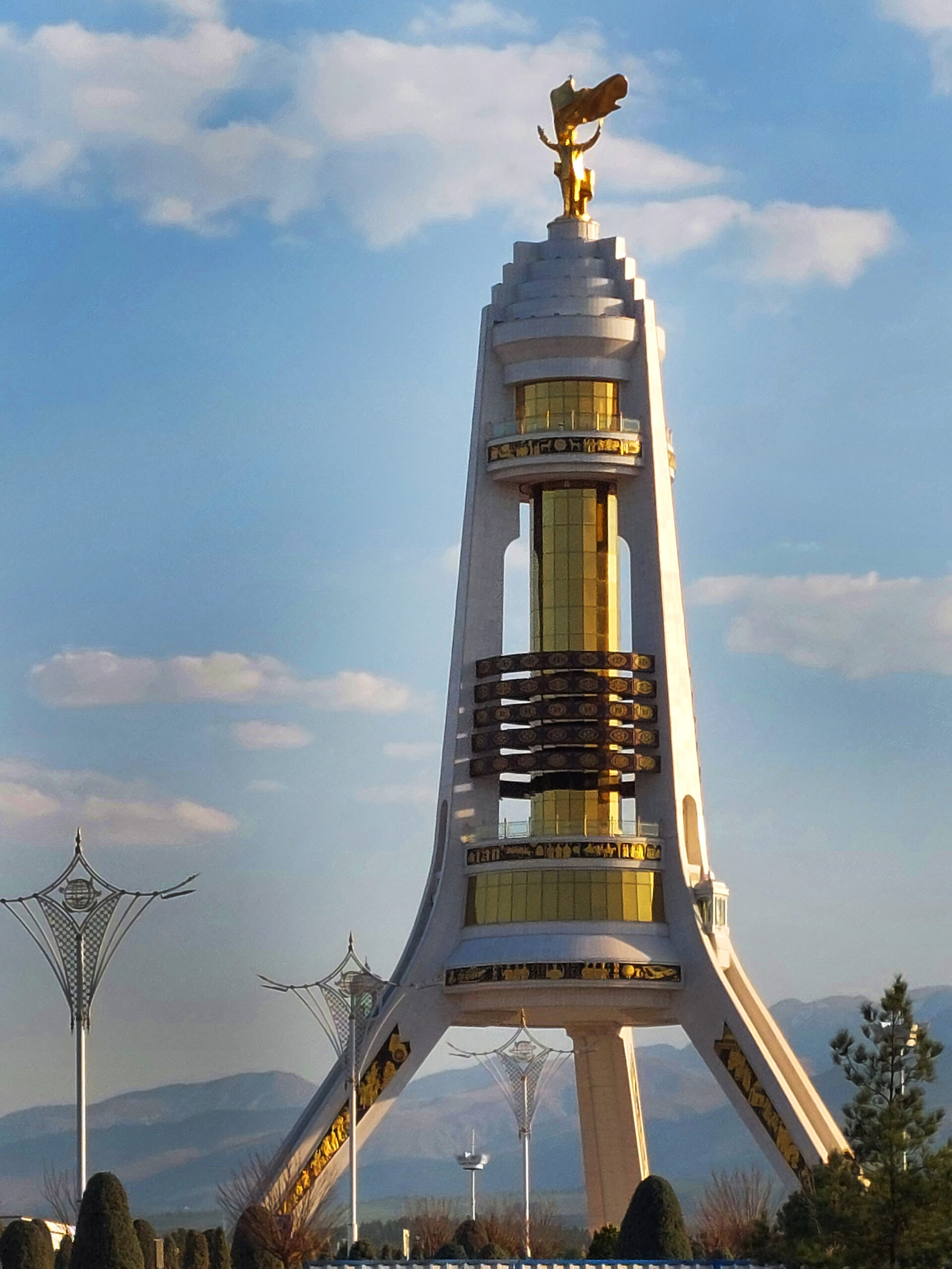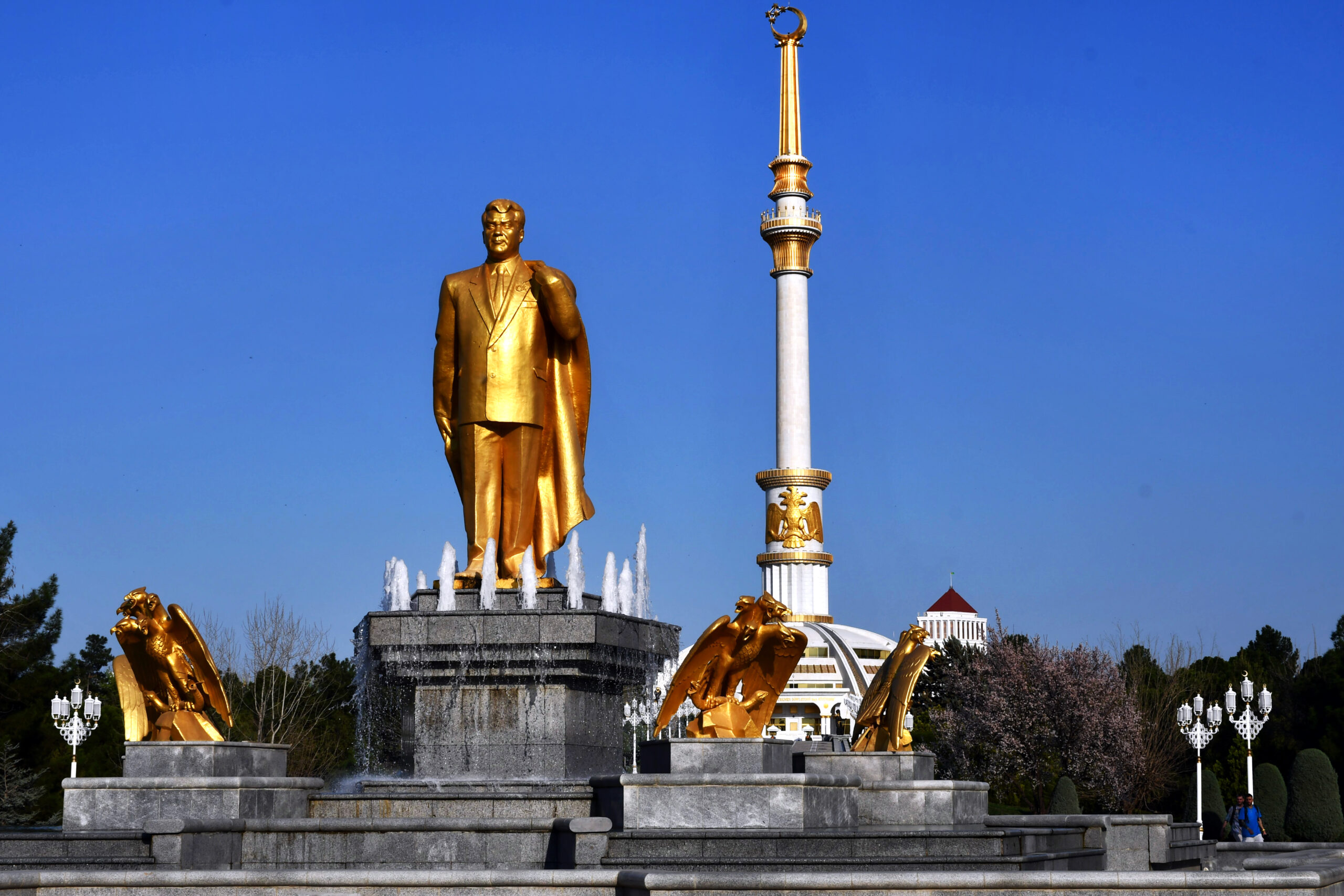 Αποκαλυπτική είναι και η περιήγηση σε ορισμένα από τα ογκώδη μνημεία. Πρώτη στάση στο Πάρκο και το Μνημείο της Ανεξαρτησίας ύψους 118 μέτρων. Κατασκευάστηκε το 2001 για να συμβολίσει την ανεξαρτησία σε μια τοποθεσία συνολικής έκτασης 84.500 τ.μ. Πλαισιώνεται από εκατοντάδες δέντρα, σιντριβάνια με καταρράκτες και μπρούτζινα αγάλματα ηρώων και ηγεμόνων του έθνους. Στο κέντρο του δεσπόζει το χρυσό άγαλμα του Νιγιαζόφ του πρώτου προέδρου μετά από την ανεξαρτησία, του επονομαζόμενου Τουρκμενμπασί (Ηγέτη όλων των Τουρκμένων). Ένα δεύτερο επιβλητικό άγαλμα του Νιγιαζόφ, περιστρεφόμενο αυτή τη φορά για να ακτινοβολεί κάτω από τον ήλιο, έχει τοποθετηθεί στην κορυφή της Αψίδας Ουδετερότητας. Βρίσκεται στις παρυφές της πόλης και το ύψος της φθάνει τα 95 μέτρα.