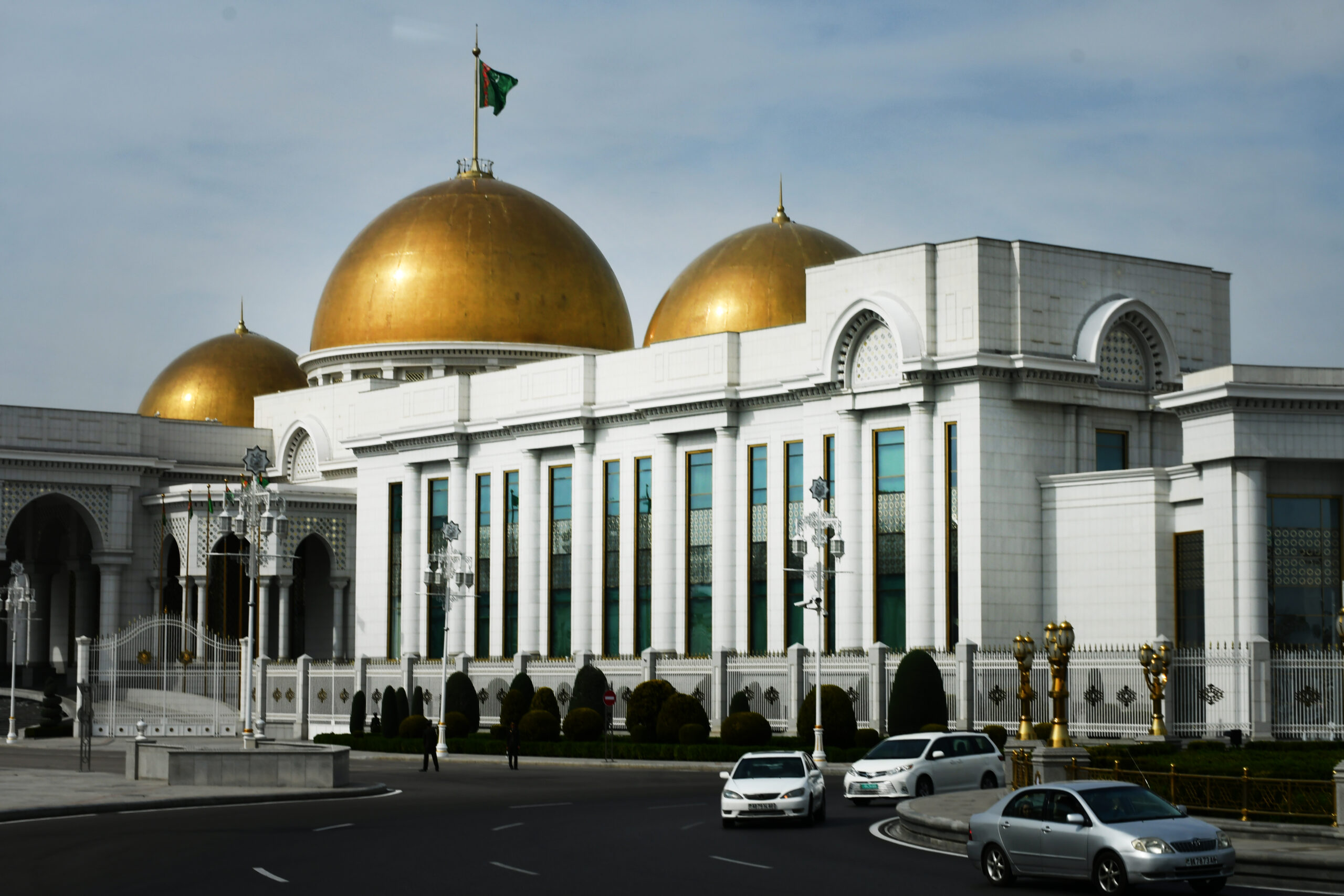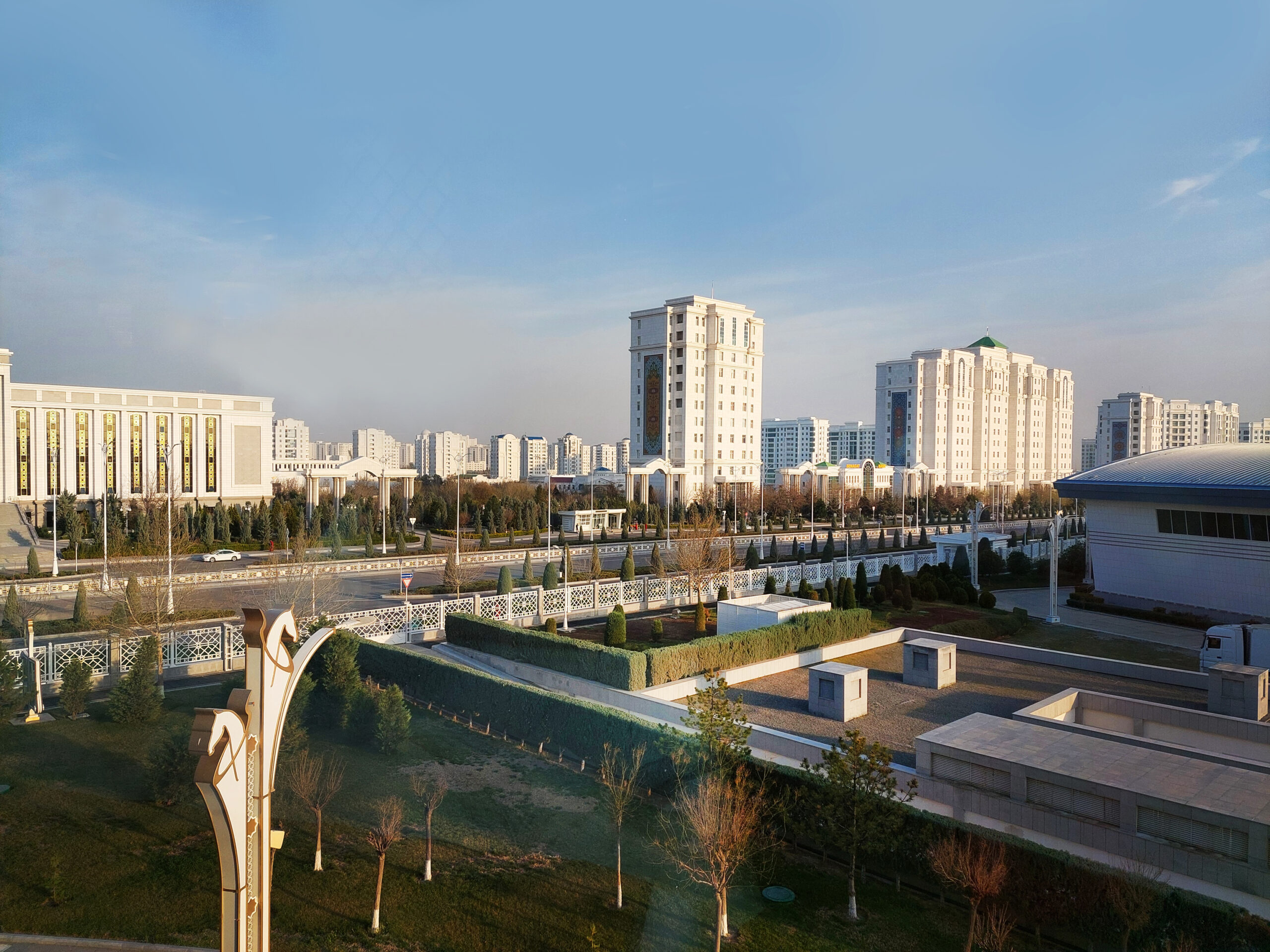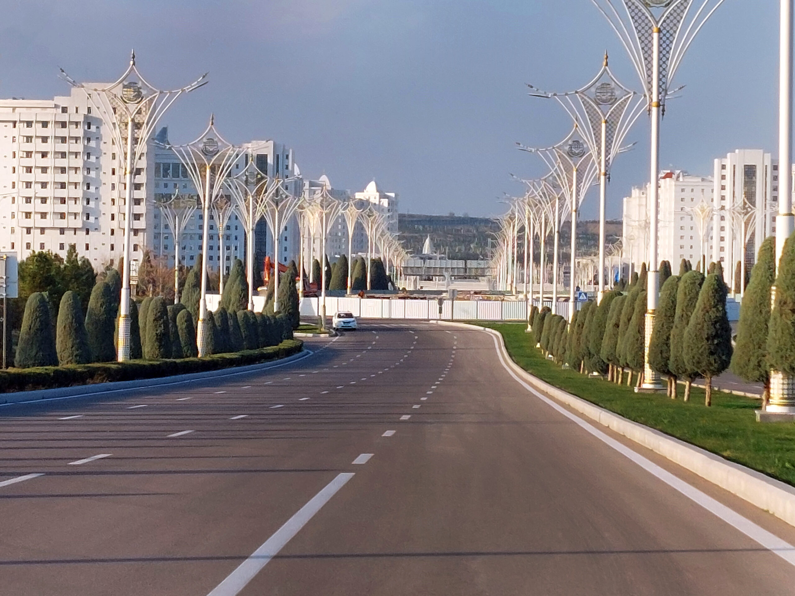 Και να ΄μαστε στην Ασγκαμπάτ την λαμπερή πρωτεύουσα, την «πόλη της αγάπης» ή έστω «την πόλη που οικοδομήθηκε με αγάπη», αλλά και υπερβολική πολυτέλεια. Βρίσκεται στο νότο, 25 χιλιόμετρα από τα σύνορα με το Ιράν και είναι κάτοχος τουλάχιστον 5 ρεκόρ Γκίνες. Ένα από αυτά αφορά στην υψηλότερη πυκνότητα κτηρίων που έχουν κατασκευαστεί από λευκό μάρμαρο. Στη λευκή πρωτεύουσα των Τουρκμένων ακόμη και τα κράσπεδα είναι από μάρμαρο. Ωστόσο, δεν είναι μόνο η λευκή απόχρωση που την κάνει να ξεχωρίζει. Είναι και τα φαραωνικού τύπου μνημεία της, λευκά κι αυτά με χρυσά φινιρίσματα, οι πανύψηλοι πύργοι και τα ογκώδη χρυσά αγάλματα. Λευκές και οι στάσεις των λεωφορείων, οι φανοστάτες, οι σηματοδότες, λευκά και τα λιγοστά αυτοκίνητα που κυκλοφορούν στους δρόμους. Όλα πεντακάθαρα, σκουπιδάκι δεν βλέπεις.