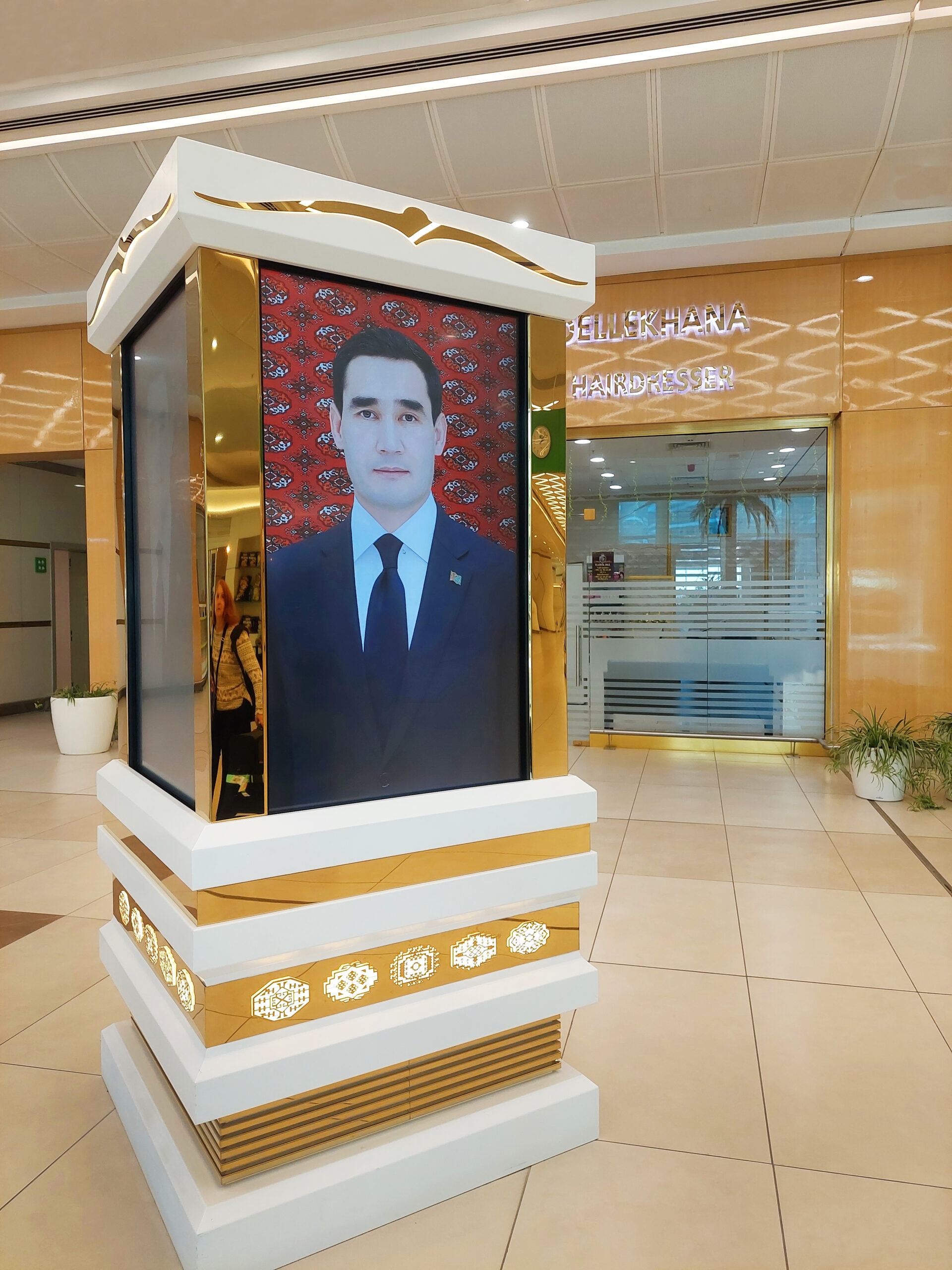 Η προσγείωση στο αεροδρόμιο της Ασγκαμπάτ και η είσοδος σε ένα πολυτελές κτηριακό συγκρότημα με όψη γερακιού έτοιμου να πετάξει, ήταν η πρώτη έκπληξη. Το γεράκι είναι ένα από τα εθνικά σύμβολα, στην πορεία θα δούμε κι άλλα κι είναι επίσης σύμβολο και λογότυπο των Τουρκμενικών αερογραμμών. Λάμψη, αναμονή και μοναξιά. Παίζει να ΄μαστε και οι μοναδικοί ξένοι ταξιδιώτες που έφθασαν στη χώρα. Αίθουσες άδειες, γραφειοκρατία και πήγαινε-έλα για το πολυπόθητο Entry travel pass και το «υποχρεωτικό» κόβιντ τέστ, το οποίο τελικά δεν έγινε, αν και το αντίτιμο καταβλήθηκε. Και η πρώτη ψυχρολουσία, no photo. Ε, εντάξει μια δύο φωτογραφίες πρόλαβα και τις τράβηξα, χωρίς να γίνω αντιληπτή, ώσπου επιτέλους ύστερα από ένα δίωρο οδηγούμαστε προς την έξοδο. Στο κέντρο της τελευταίας αίθουσας των αφίξεων δεσπόζει η φωτογραφία του 44χρονου Σερντάρ Μπερντιμουχαμέντοφ, σημερινού ηγέτη της χώρας. Είναι η πρώτη μας γνωριμία με τον νέο πρόεδρο, από την επομένη θα τον βλέπουμε παντού στο δρόμο μας. Σε ταμπέλες και προσόψεις κτηρίων, ακόμα και πάνω σε χαλιά στα μουσεία. Στη χώρα είναι εμφανής η προεδρική προσωπολατρεία και μηνύματα τύπου «Δόξα σε σένα ήρωά μας Σερνταρεμύ» σε λίγο θα πάψουν να μας εκπλήσσουν.