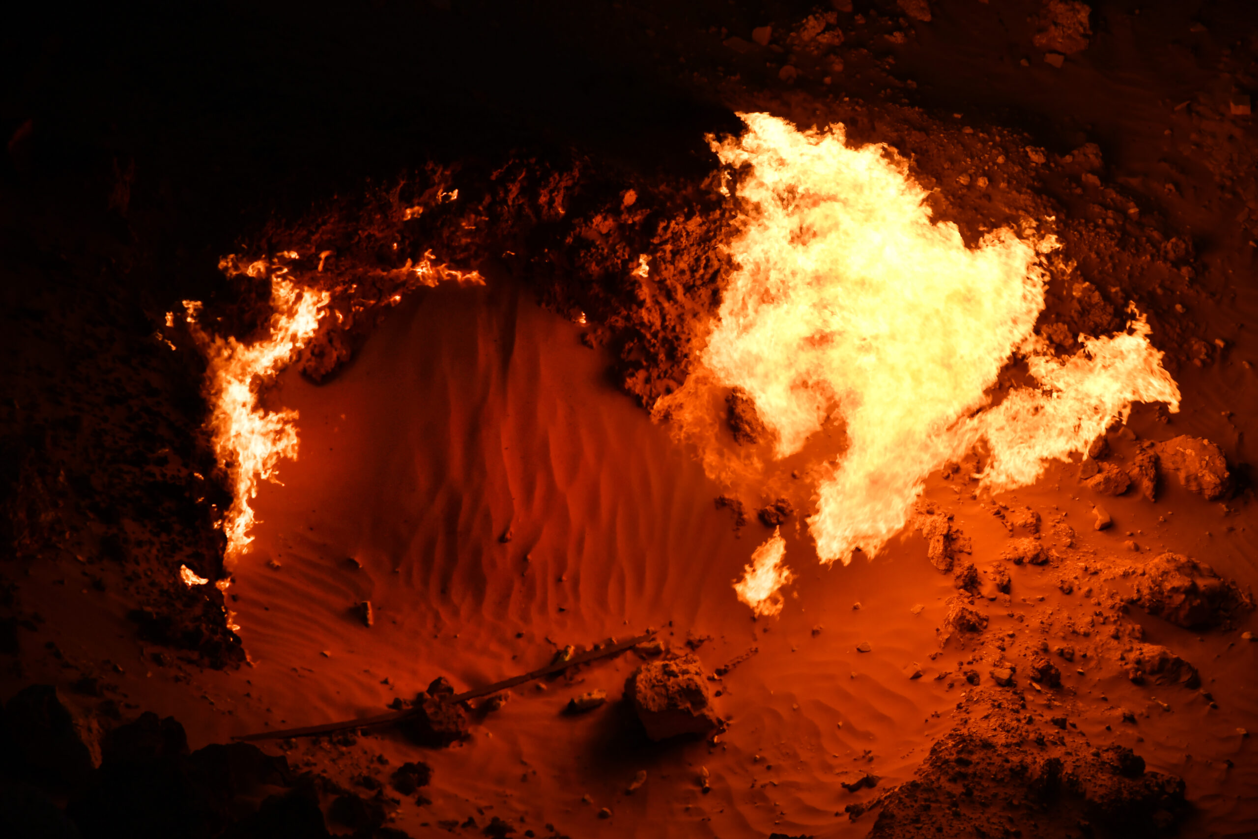 Φθάσαμε στον κρατήρα. Το θέαμα είναι εντυπωσιακό. Η φλεγόμενη άβυσσος μας αποκαλύπτει το άλλο πρόσωπο της ερήμου. Σμιλεμένο με αμέτρητους κόκκους άμμου, έτοιμους να ανοίξουν τα φτερά με το πρώτο φύσημα του αέρα. Σε λίγο αρχίζει να πέφτει η νύχτα, ο άνεμος δίνει το σύνθημα, στροβιλίζεται κι αρχίζει να σέρνει το χορό πάνω από τις φλόγες. Πλησιάζω το πυρακτωμένο στόμιο της «Κόλασης». Η ανάσα του με ζεσταίνει. Η φλογερή λάμψη του, το έντονο τοπίο γύρω, ο σκούρος ουρανός και η σιωπή σκηνοθετούν το απόκοσμο θέαμα. Καταμεσής της ερήμου. Τι νύχτα κι αυτή, μαγική, αξέχαστη.