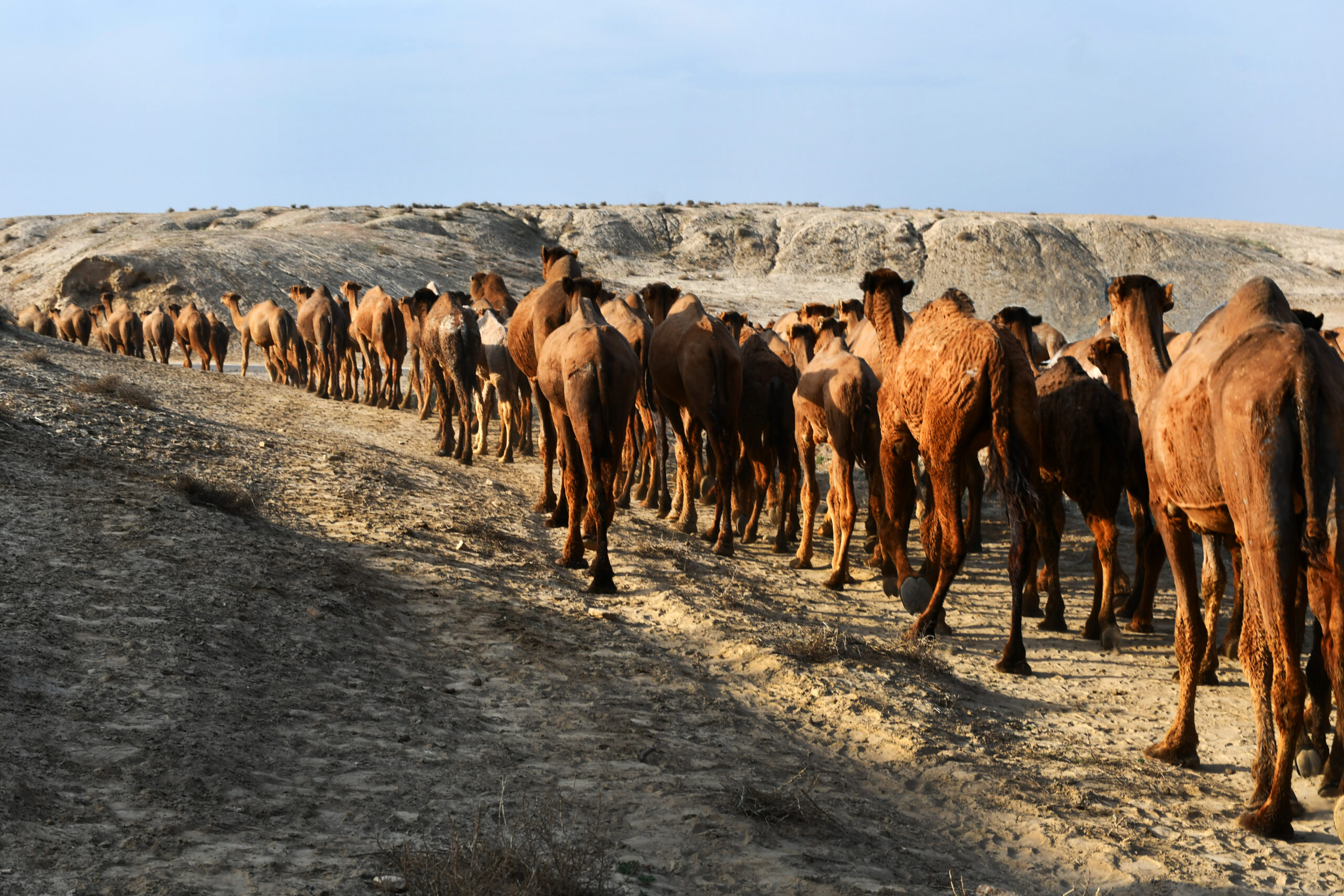 Διασχίζουμε την Καρακούμ, τρέχει και στροβιλίζεται κι αυτή μαζί μας, αλλάζοντας συνεχώς πρόσωπα. Η «μαύρη έρημος» που μόνον μαύρη δεν είναι. Εκεί που τη βλέπεις ξανθή, και διάφανη σαν πούδρα να πασπαλίζει τους αμμόλοφους, αίφνης αλλάζει, μελαγχολεί, γίνεται γκρίζα κι ύστερα λευκή αλατώδης κάτω από έναν βαρύ ουρανό βροχερό, τυλιγμένο στα σύννεφα. Το τράβελινγκ της φύσης καταγράφει εικόνες Σαχάρας και Κυζίλ Κουμ μαζί, φωτεινές πινελιές στον μονόχρωμο καμβά της στέπας. Μια απέραντη ημιέρημος που καταλαμβάνει το 70% της έκτασης της χώρας.