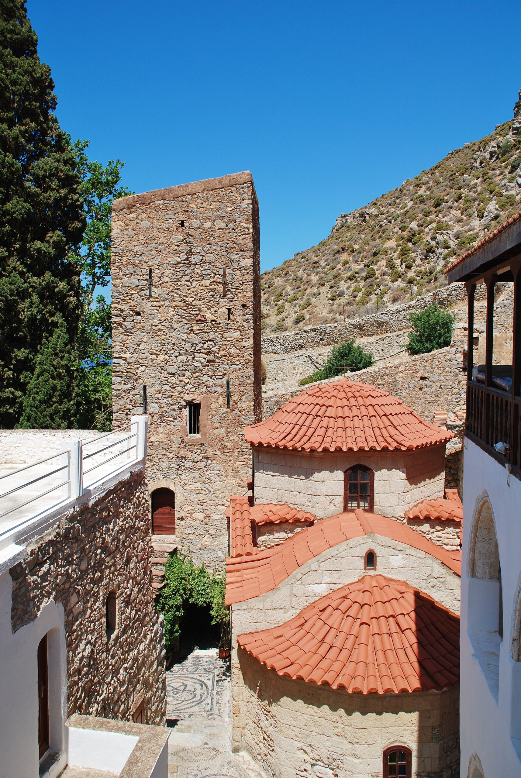 Στα 7 χλμ. από το Μεγάλο Χωριό, στην πλαγιά του λόφου Κρύαλλος, βρίσκεται το μεγάλο προσκύνημα της Τήλου, το ιστορικό μοναστήρι του Αγίου Παντελεήμονα, γνωστό σε όλα τα Δωδεκάνησα. Κτίστηκε μεταξύ 1470-80, με φρουριακή αρχιτεκτονική -γι’ αυτό το περιβάλλει ισχυρός πέτρινος περίβολος με τριώροφο αμυντικό πύργο. Ανακαινίστηκε το 1703 και το 1824 και επεκτάθηκε το 1843. Το καθολικό του, με τα αποκατεστημένα ψηφιδωτά, χρονολογείται από τα τέλη του 15ου αιώνα και έχει ξυλόγλυπτο τέμπλο του 1714. Η βοτσαλωτή αυλή της μονής είναι ένα μικρός παράδεισος γαλήνης, καθώς την περιτριγυρίζουν πλατάνια, λουλούδια και αμπέλια. Πλάι στο μοναστήρι υπάρχει ωραίος χώρος αναψυχής με πηγή.