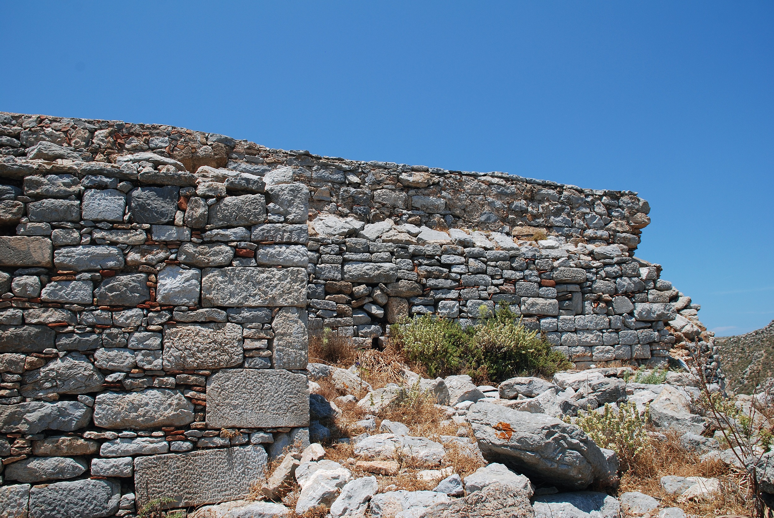 Εάν ανεβείτε ως εκεί θα δείτε ερείπια της αρχαίας και της μεσαιωνικής περιόδου και την εκκλησία των Ταξιαρχών (14ος αι.) που θεμελιώθηκε, όπως εικάζεται, στη θέση των δύο αρχαίων ιερών. Κάτω από το κάστρο, στη νότια πλαγιά του λόφο, ανακαλύφθηκαν ερείπια οικισμού του 4ου π.Χ. αι. Σύμφωνα με το kastra.eu, θεωρείται από τους σημαντικότερους δωρικούς που έχουν ανακαλυφθεί. Το ίδιο site μας δίνει πληροφορίες για ένα ακόμη κάστρο των Ιπποτών, της Μεσσαριάς, στη μέση της διαδρομής μεταξύ Μικρού και Μεγάλου Χωριού, επάνω από το σπήλαιο Χαρκαδιό όπου ανακαλύφθηκαν οι σκελετοί των νάνων ελεφάντων. Ήταν από τα πρώτα που έκτισαν οι Ιππότες και σήμερα έχουν διασωθεί στο εσωτερικό του θεμέλια οικοδομημάτων κι ένα εκκλησάκι προς τιμήν του Προφήτη Ηλία ή του Τιμίου Σταυρού. Στις παρυφές του υπάρχουν ερείπια βυζαντινού οικισμού και ένα εκκλησάκια του 13ου και 5ου αιώνα με αξιόλογες αγιογραφίες.